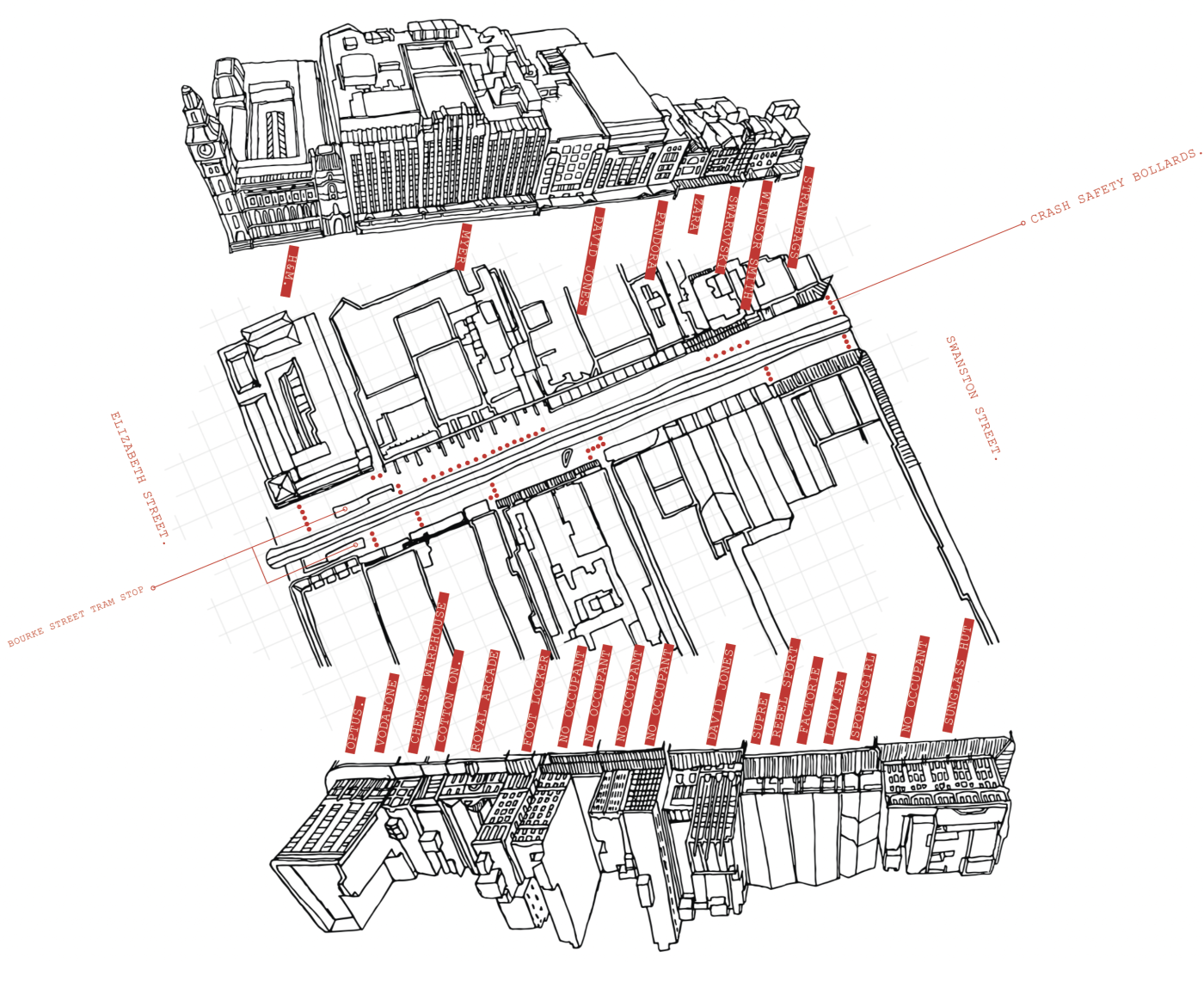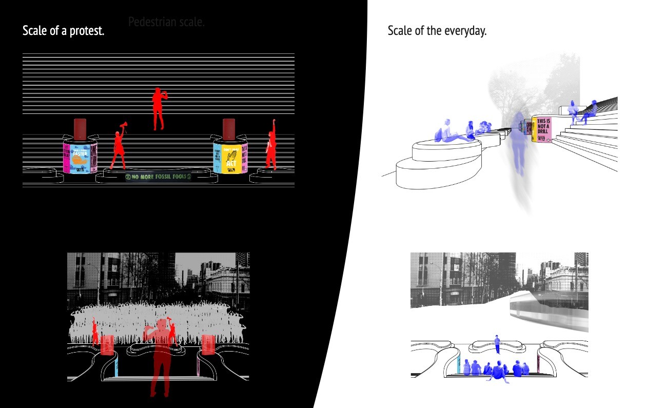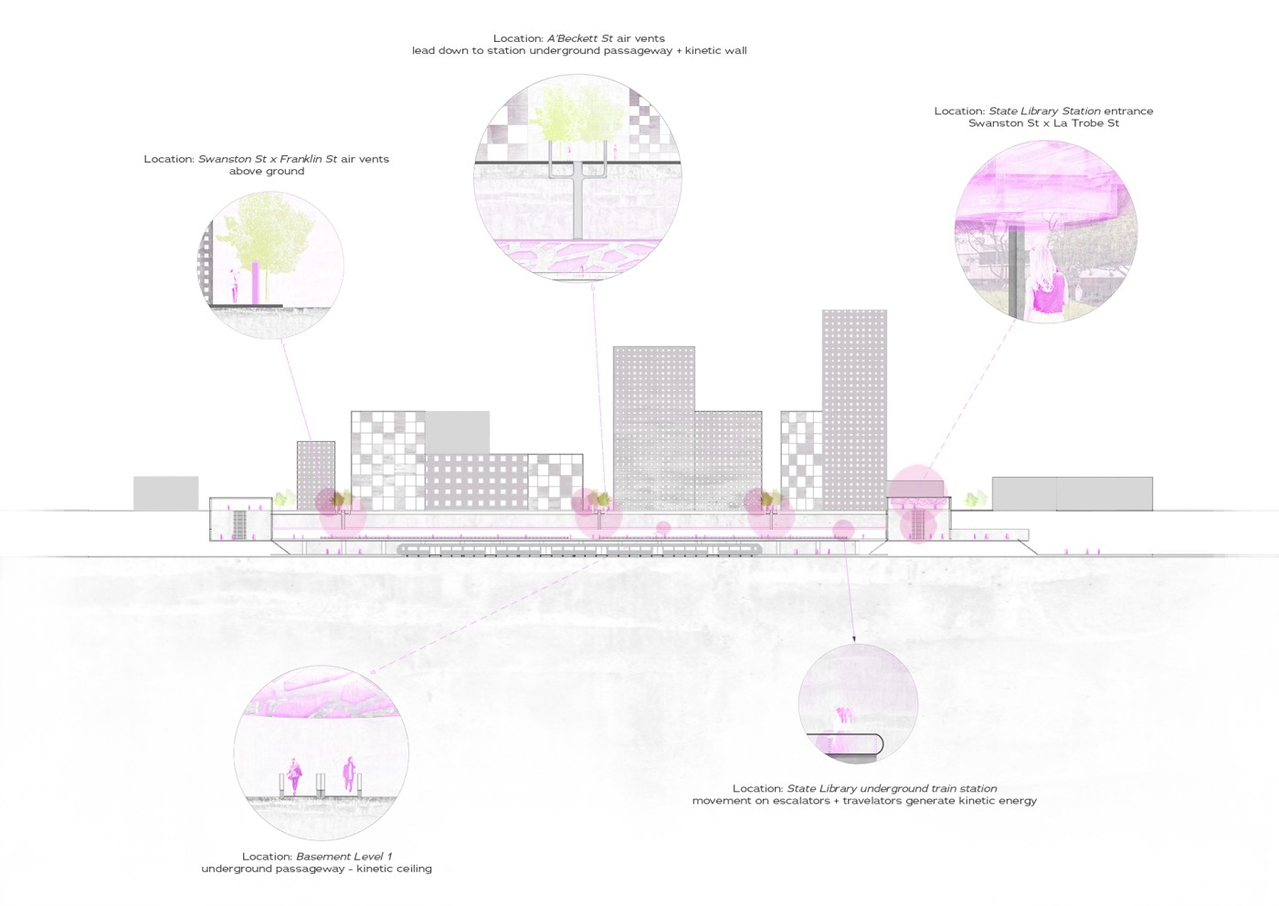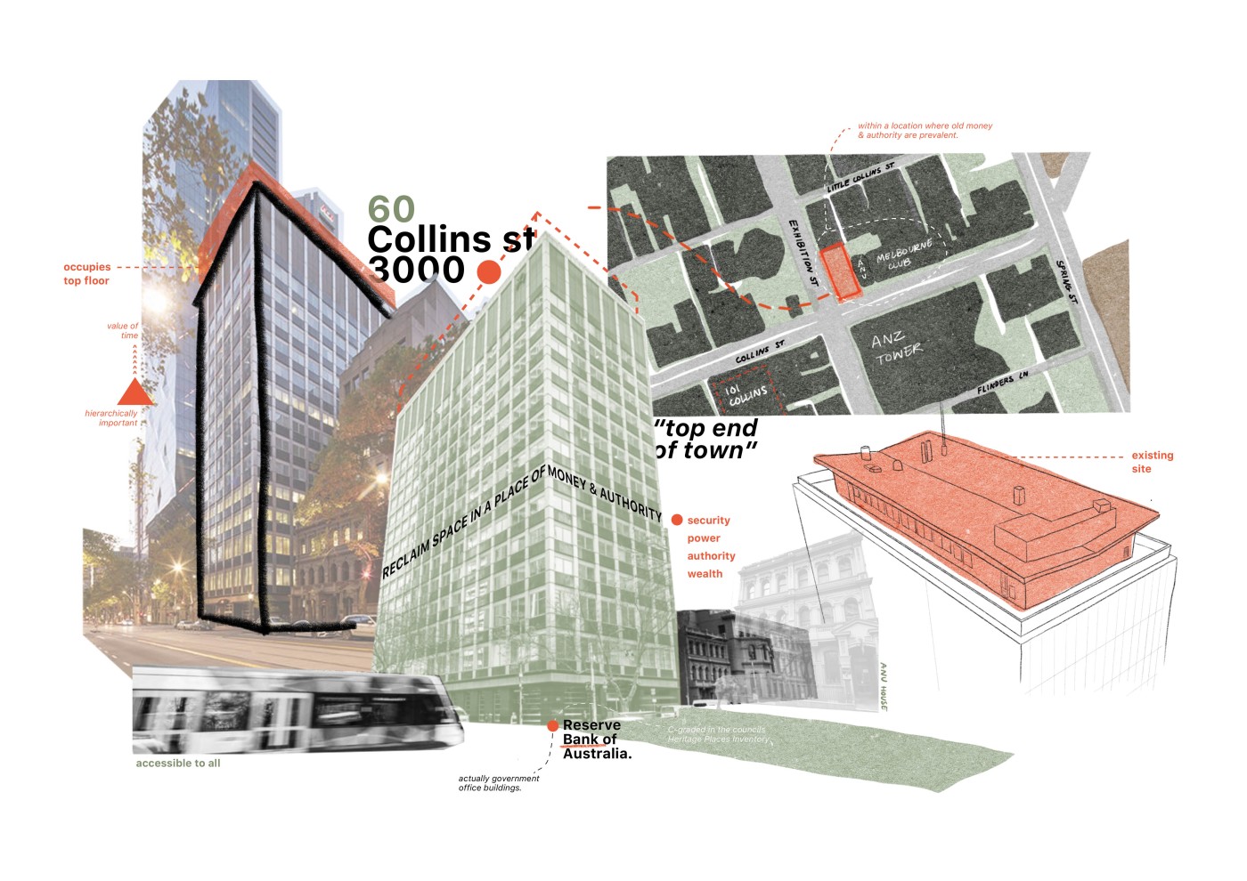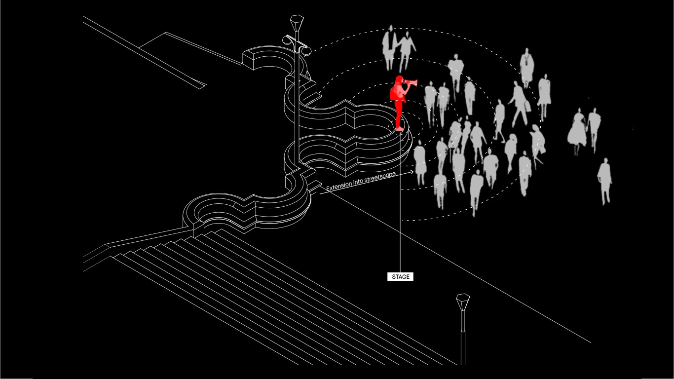 Embedded within the design of our public spaces are hidden power structures that can influence how we navigate through sites and at times dictate our behaviour. This project seeks to privilege pedestrians over cars and explore the values of public spaces for community within the development of a precinct.