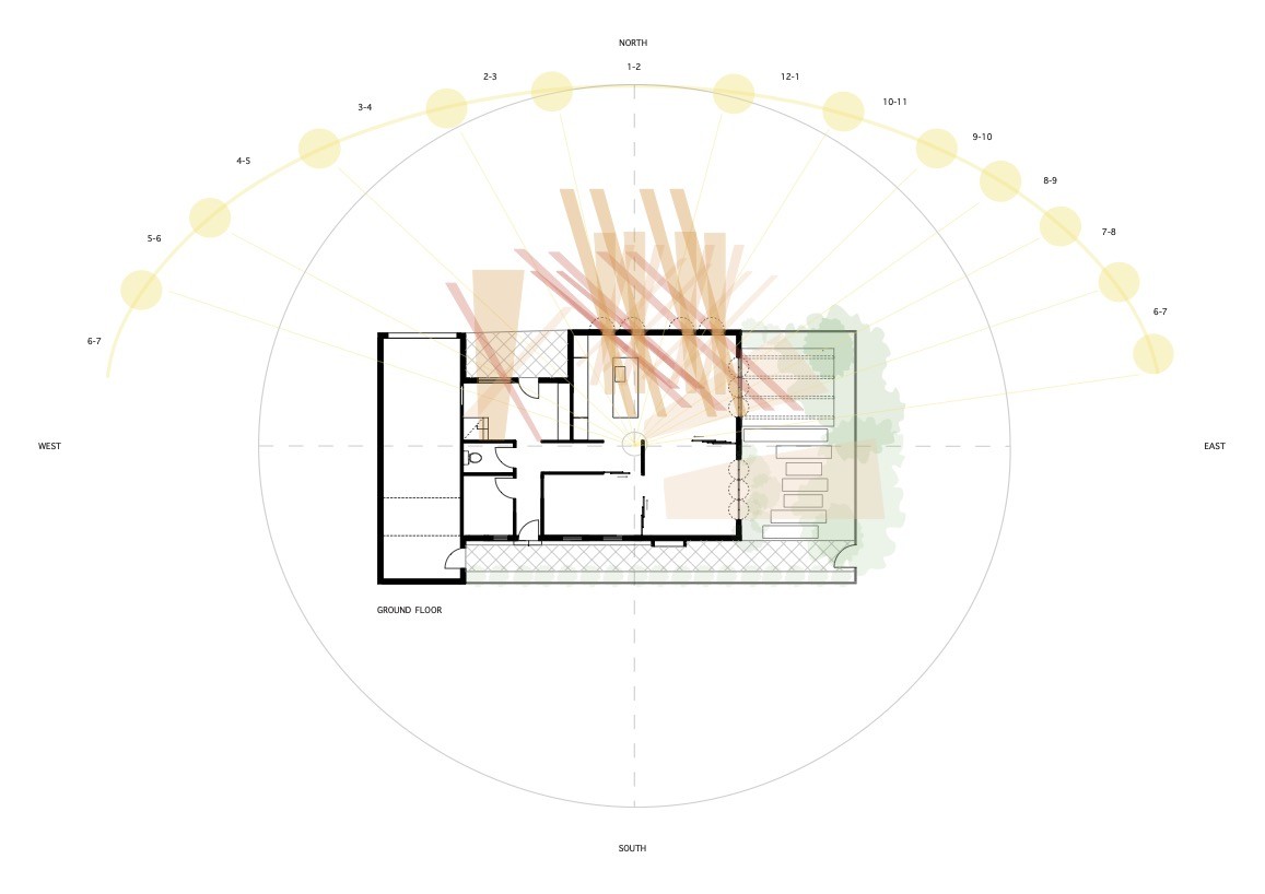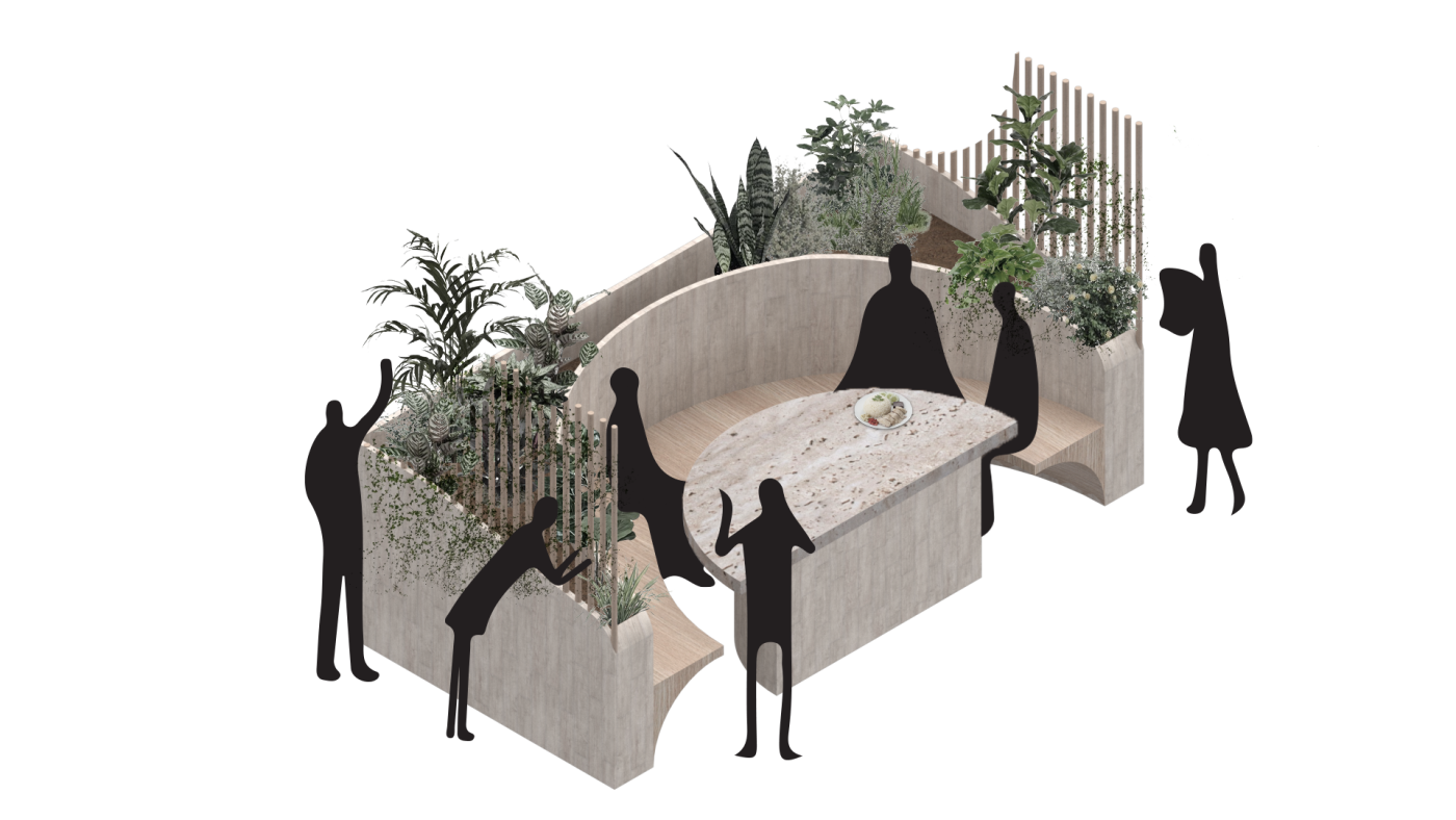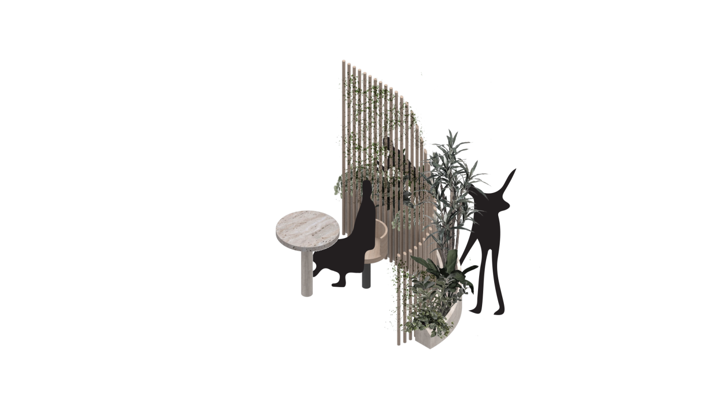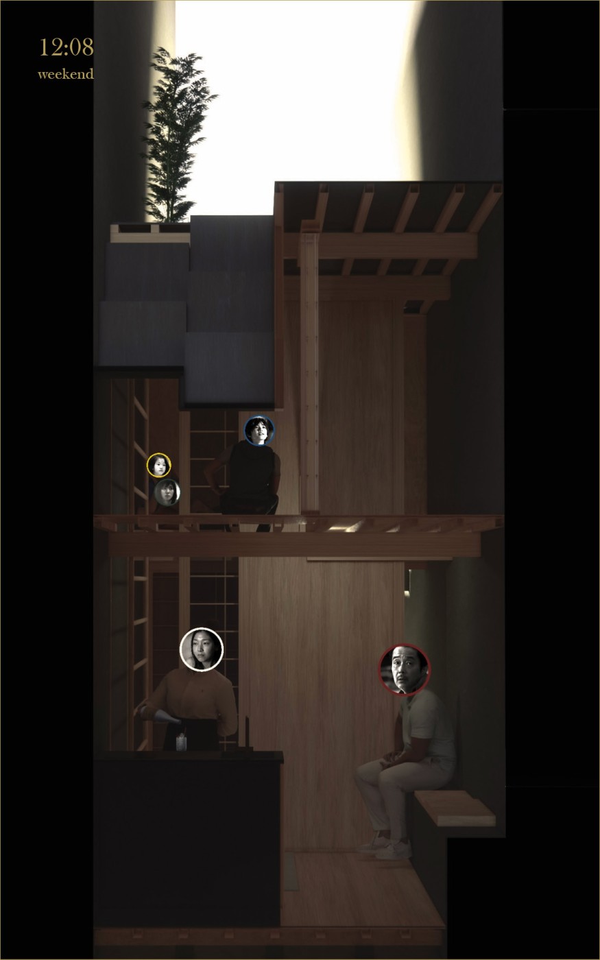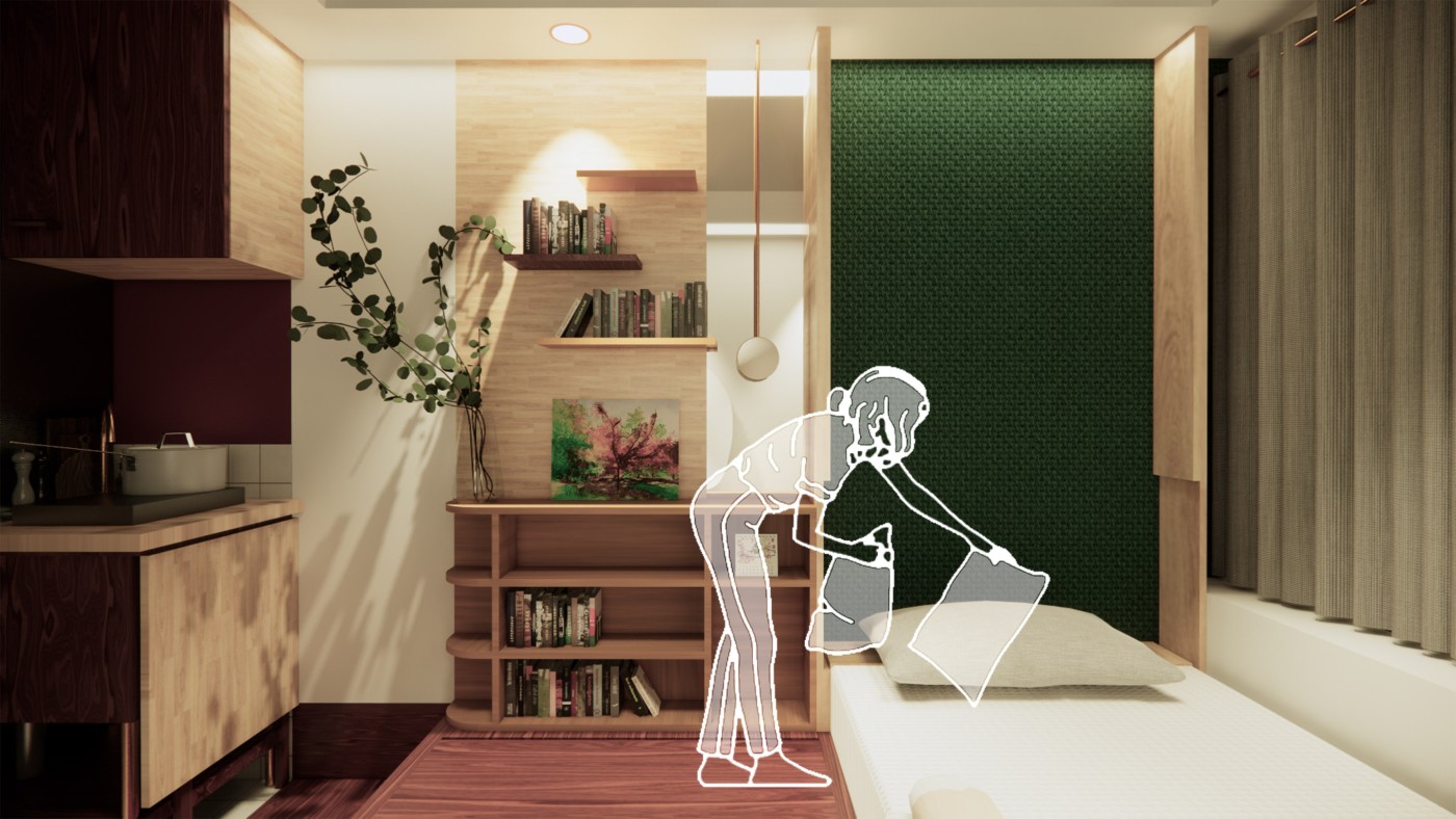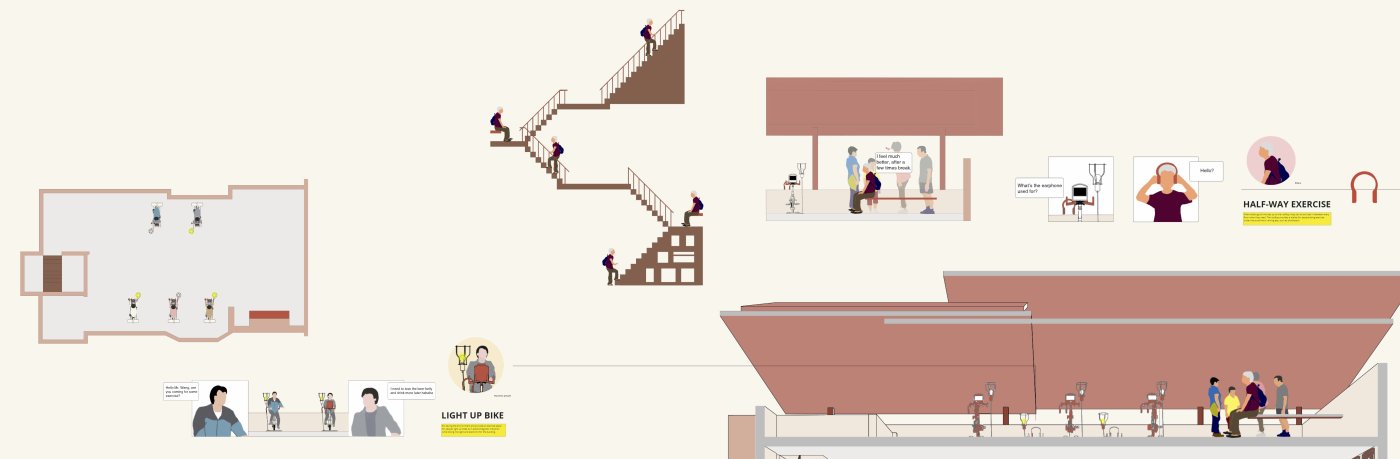 The final project expands on this approach by designing for residents in a retirement home. Given that people of retirement age spend more time at home the research asks whether the design of green spaces within the interior can assist residents in sociality, purpose and wellbeing. The design proposal first establishes the residents overlapping routines.
