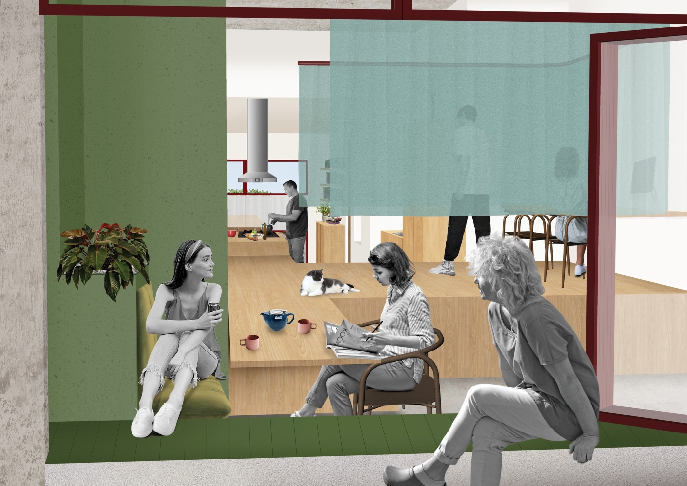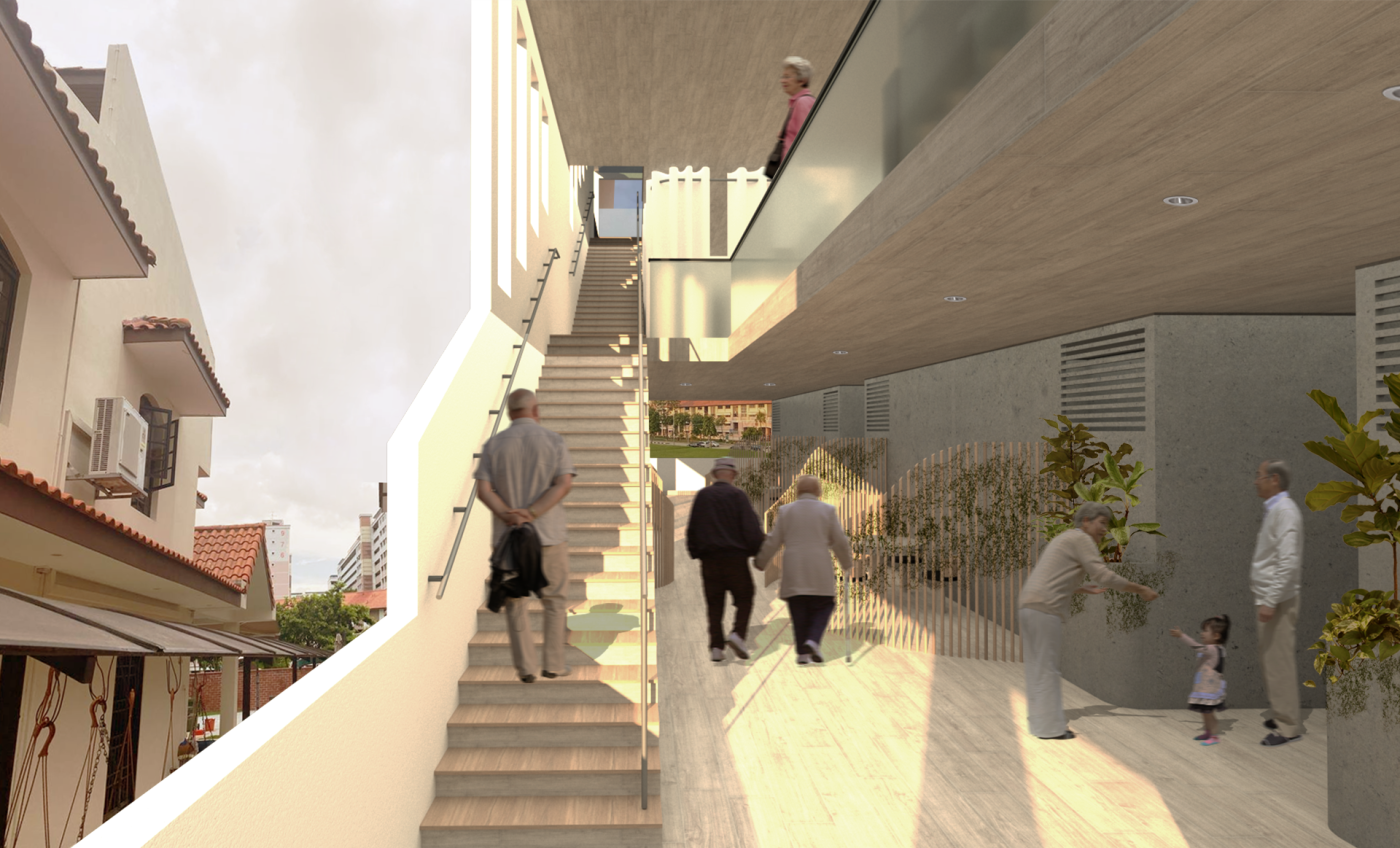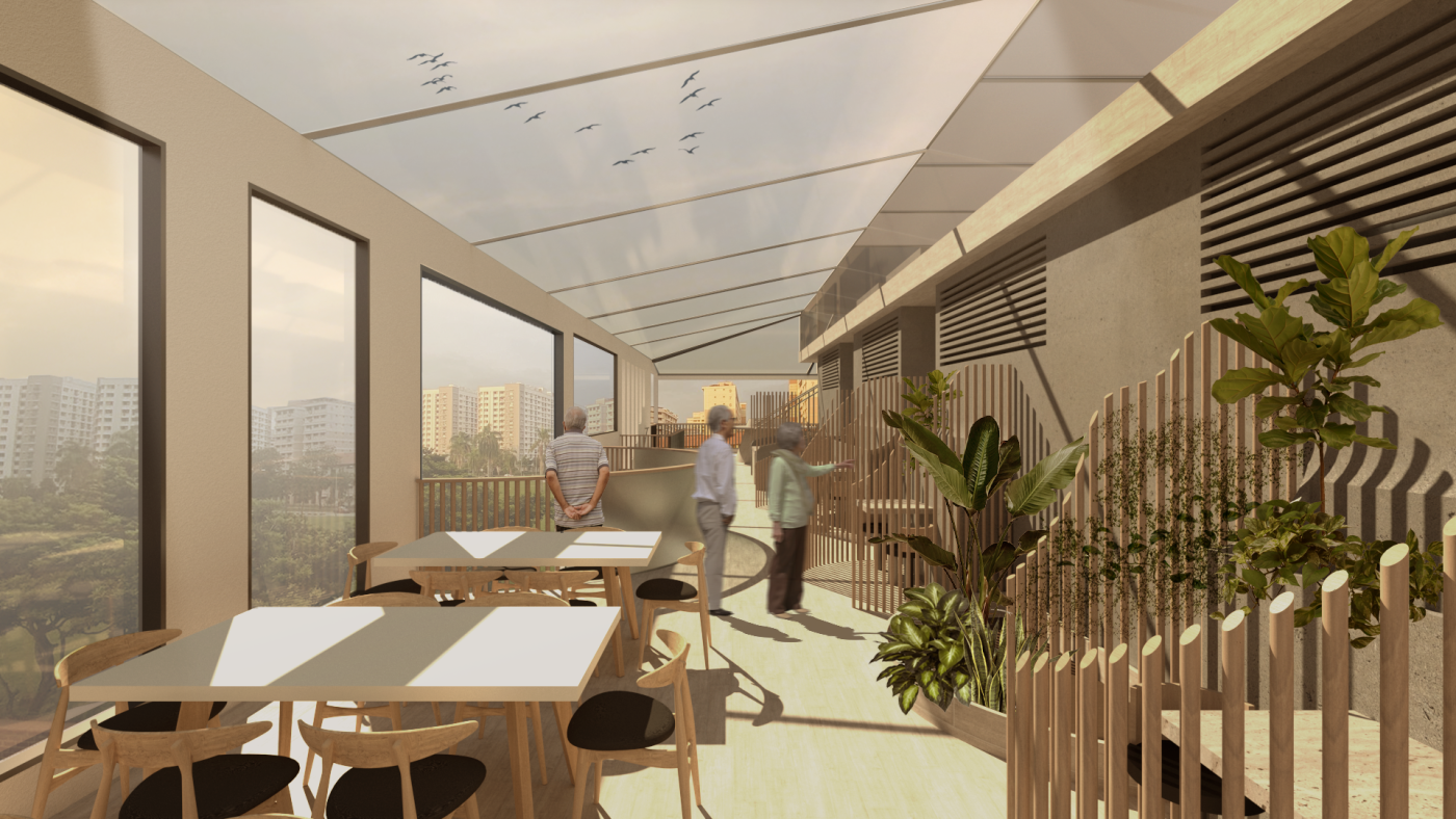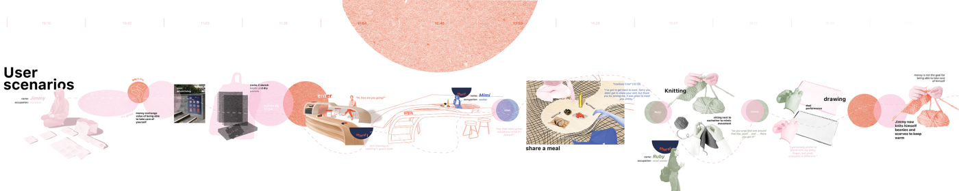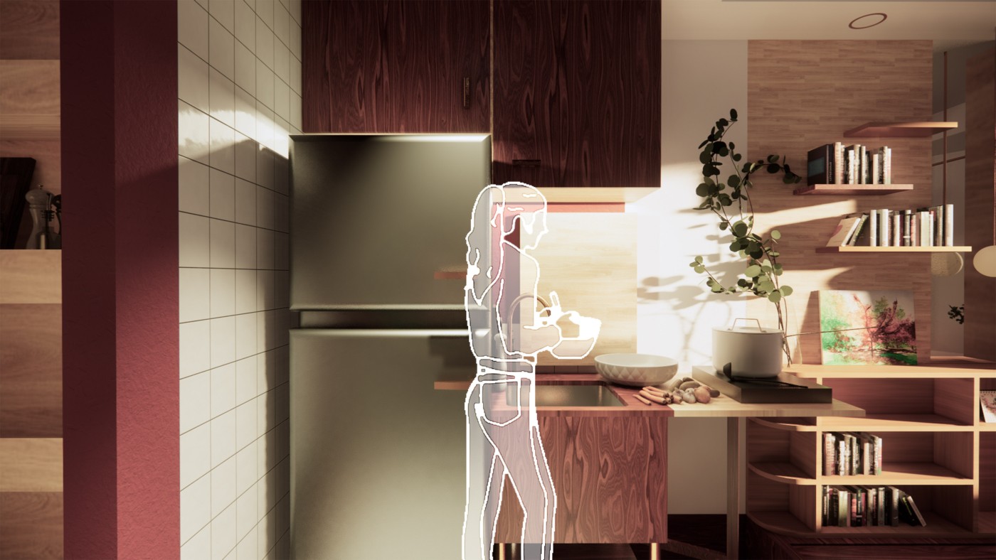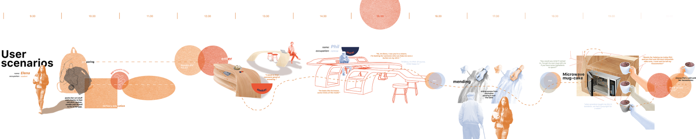 The final project expands on this approach by designing for residents in a retirement home. Given that people of retirement age spend more time at home the research asks whether the design of green spaces within the interior can assist residents in sociality, purpose and wellbeing. The design proposal first establishes the residents overlapping routines.