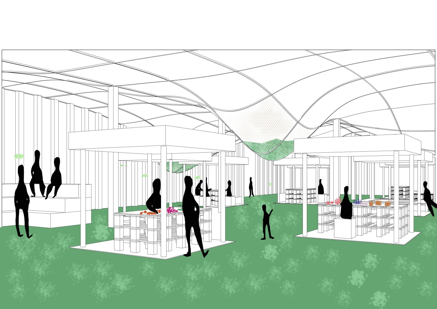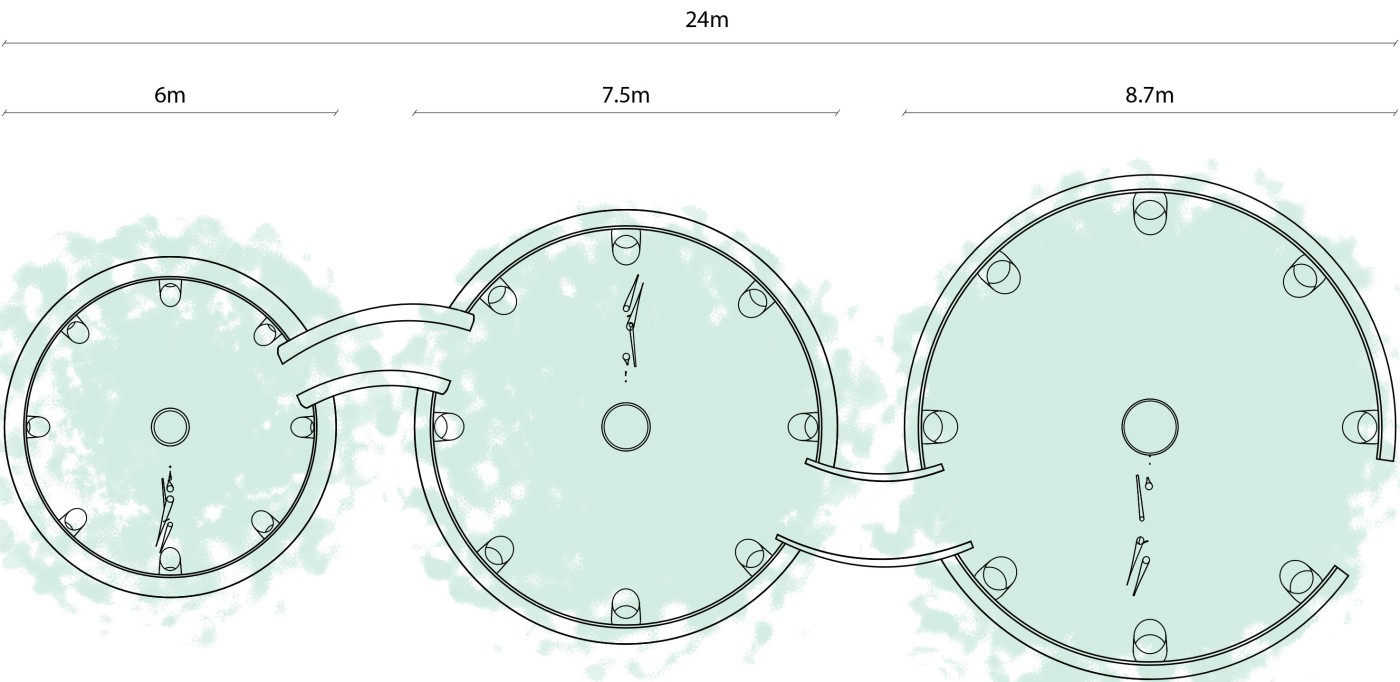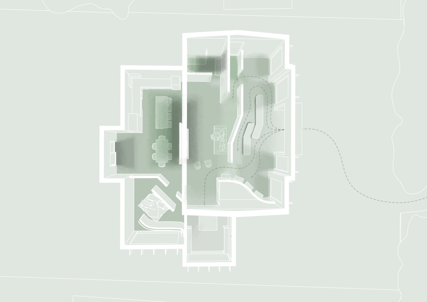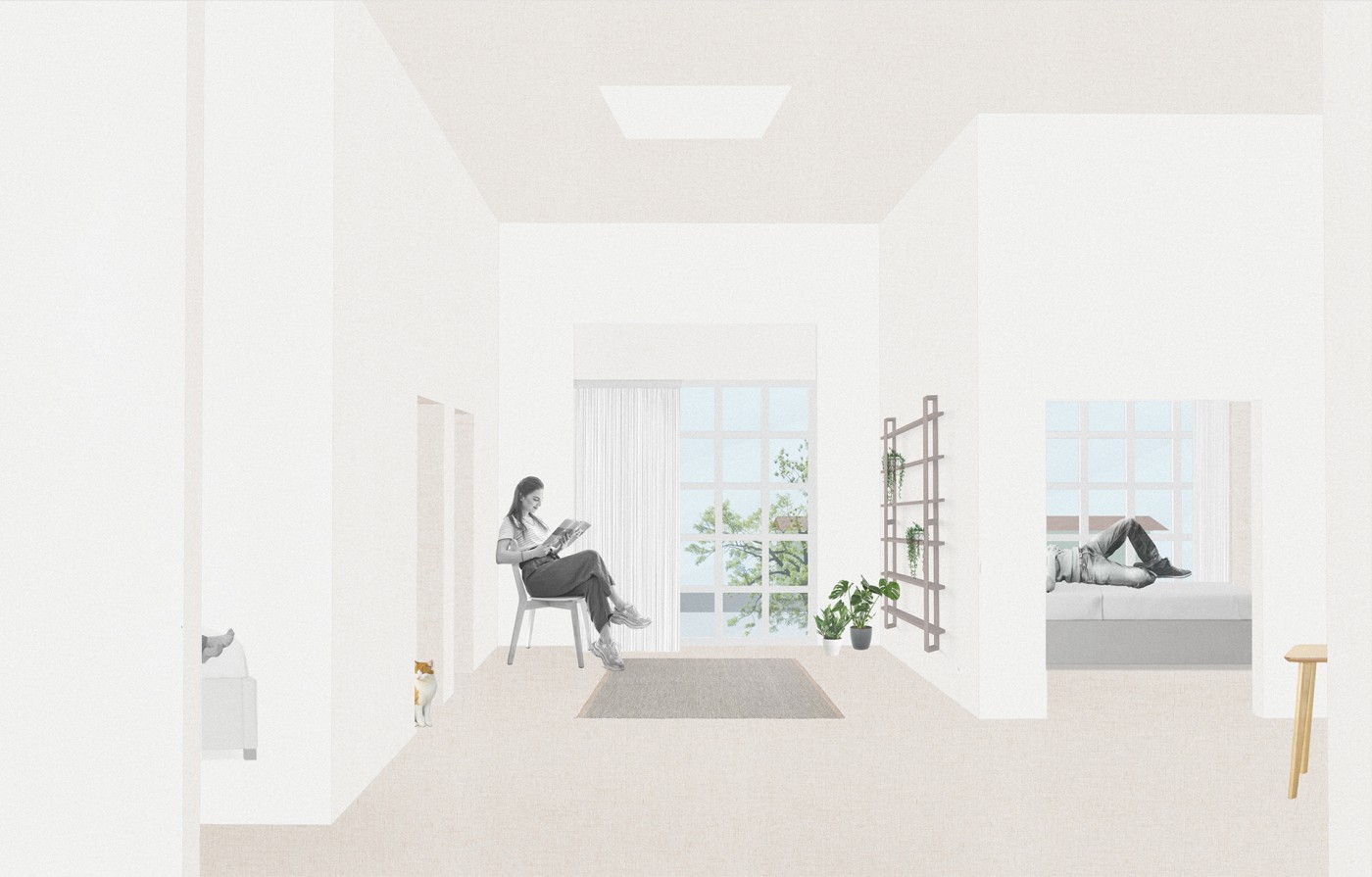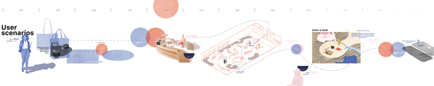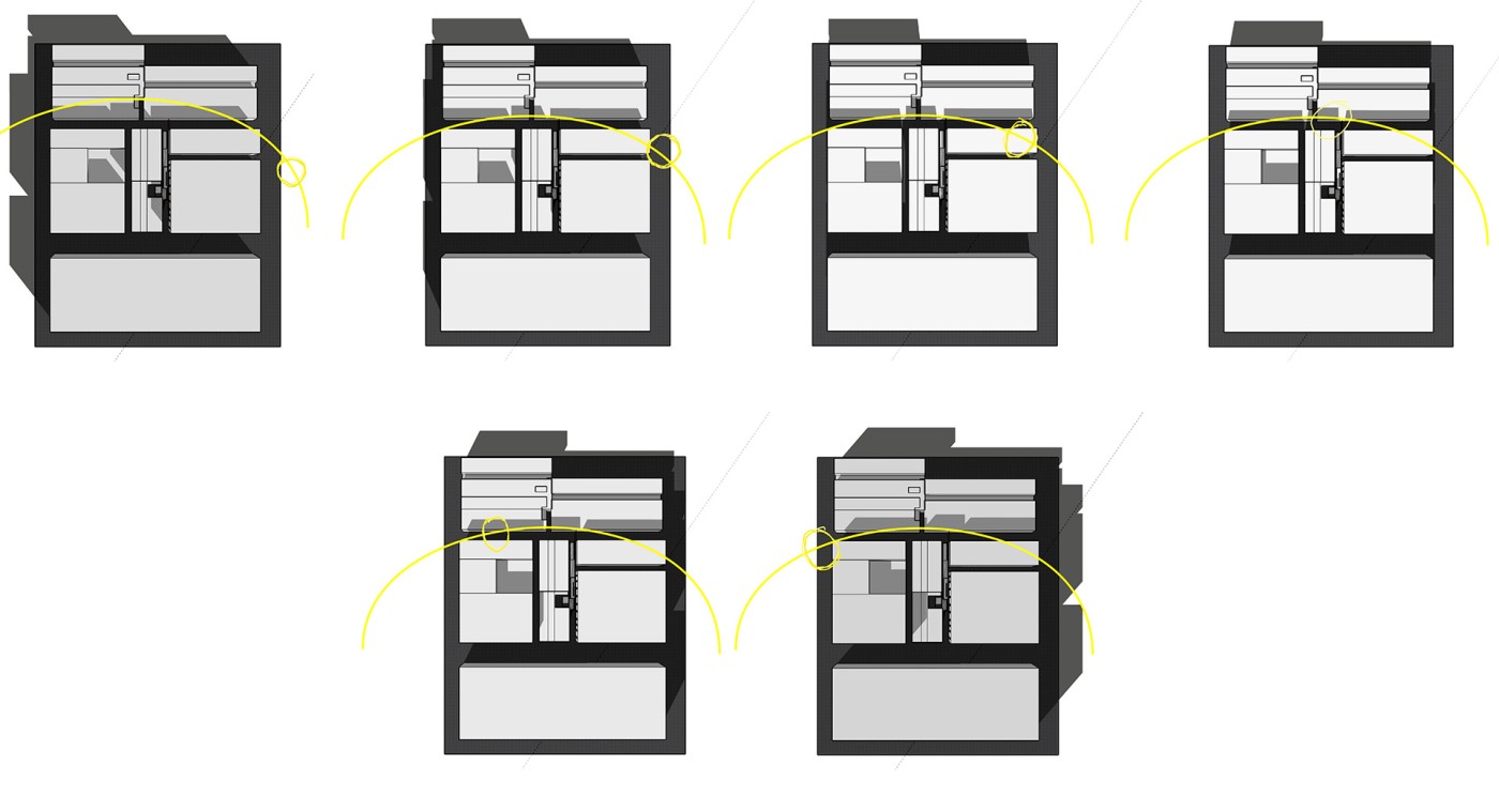 The final project expands on this approach by designing for residents in a retirement home. Given that people of retirement age spend more time at home the research asks whether the design of green spaces within the interior can assist residents in sociality, purpose and wellbeing. The design proposal first establishes the residents overlapping routines.