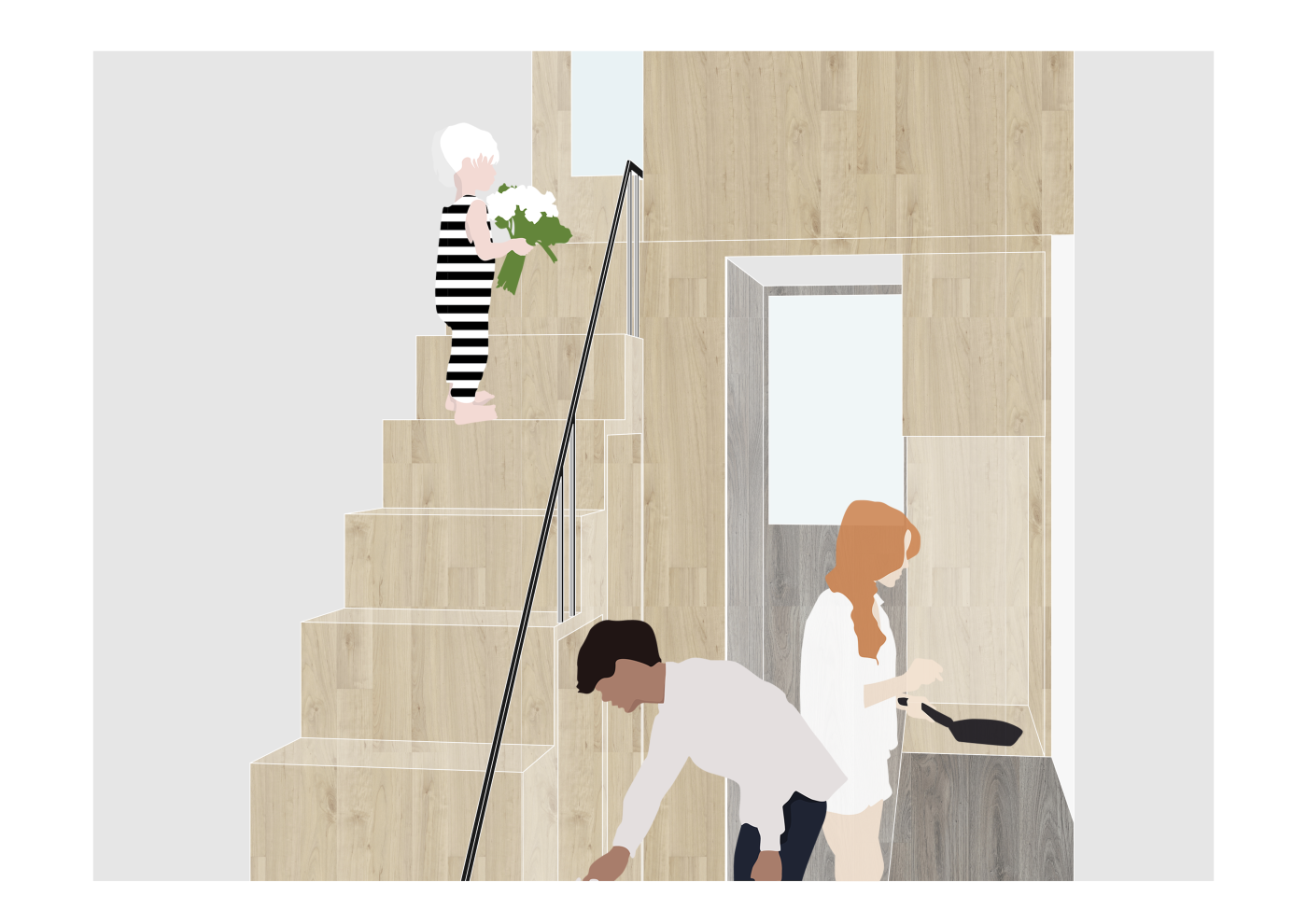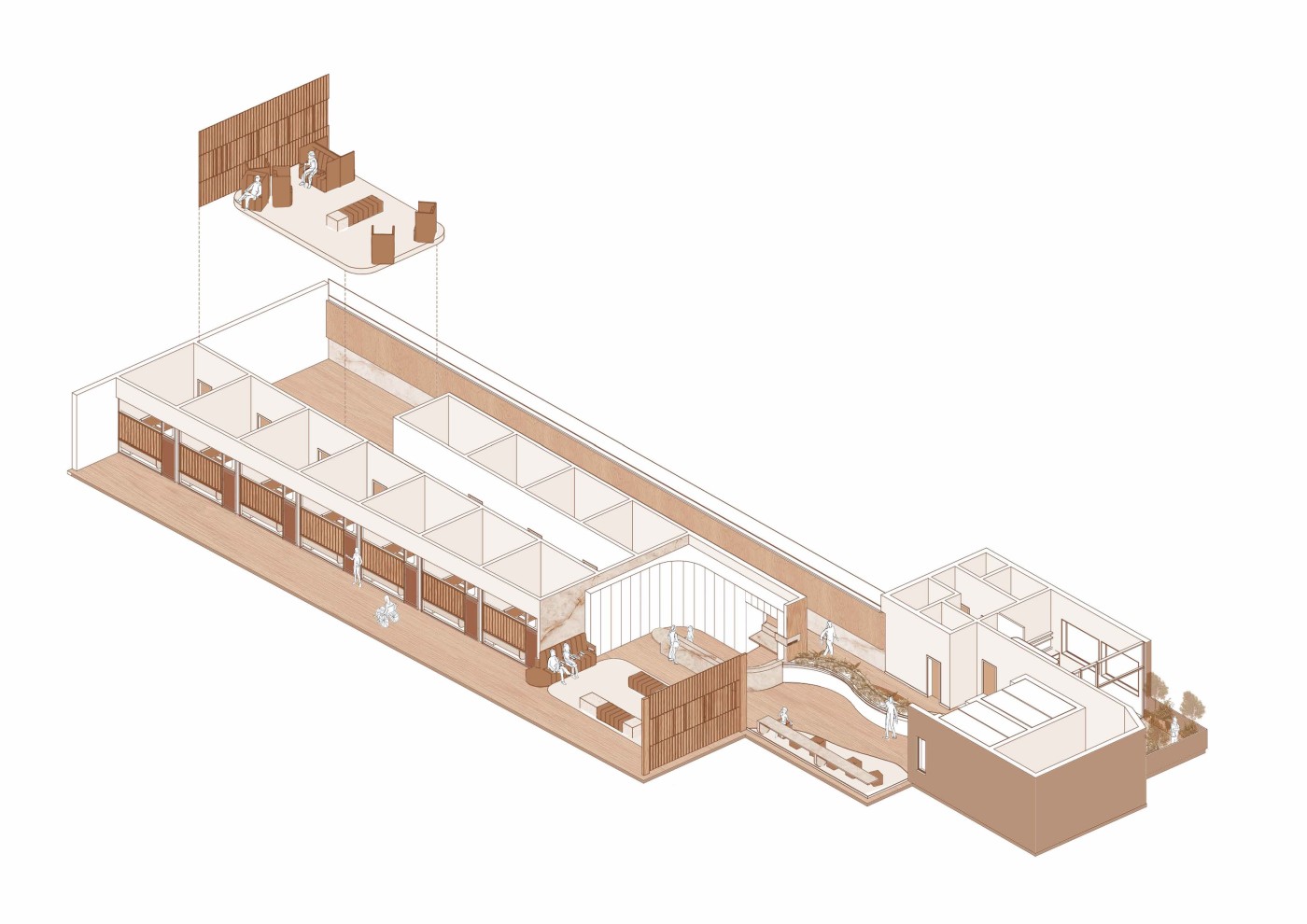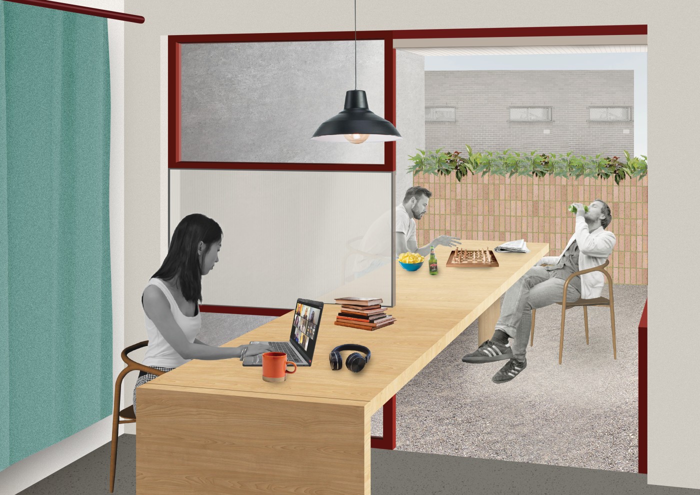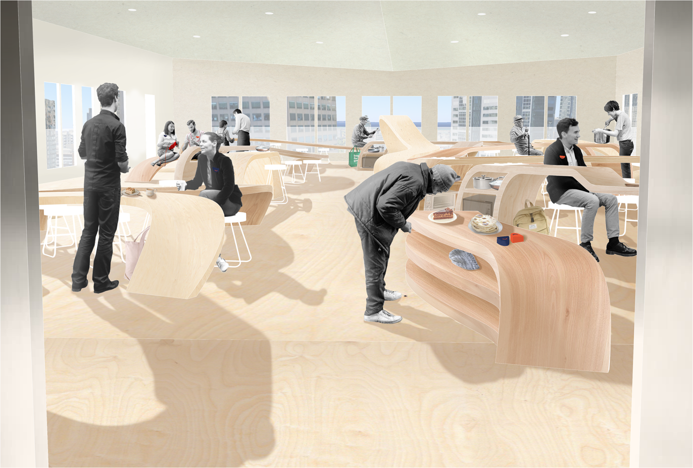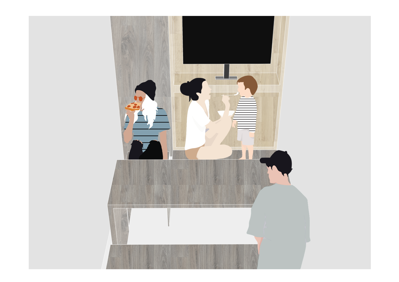 The final project expands on this approach by designing for residents in a retirement home. Given that people of retirement age spend more time at home the research asks whether the design of green spaces within the interior can assist residents in sociality, purpose and wellbeing. The design proposal first establishes the residents overlapping routines.