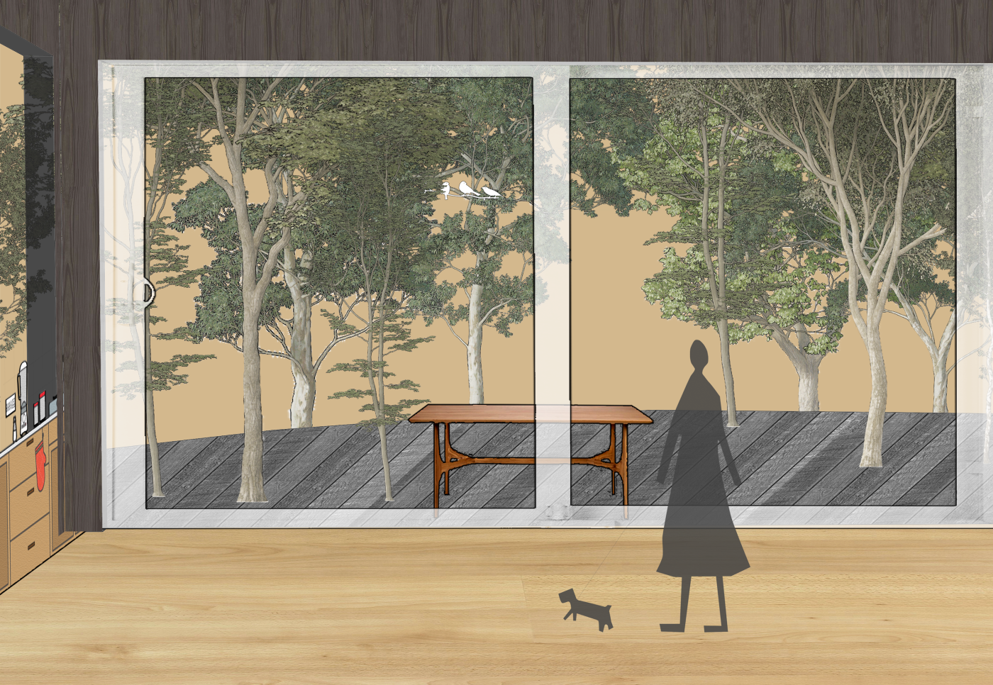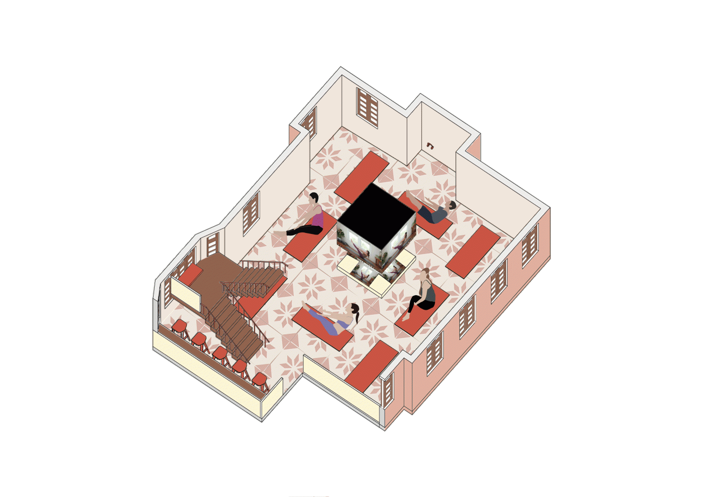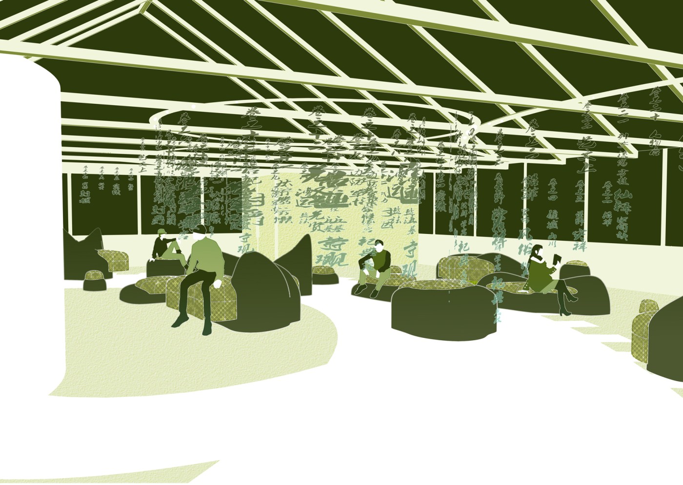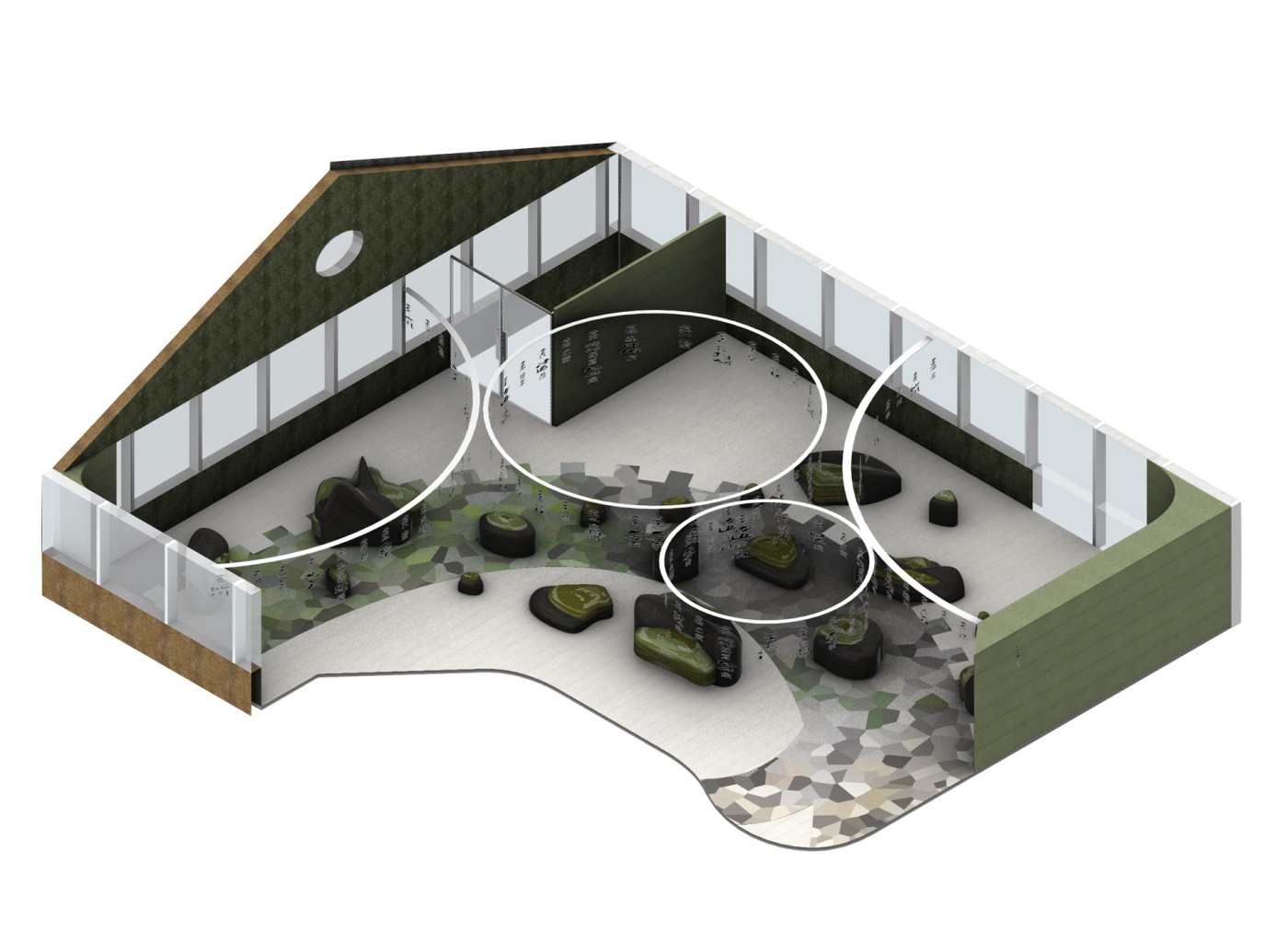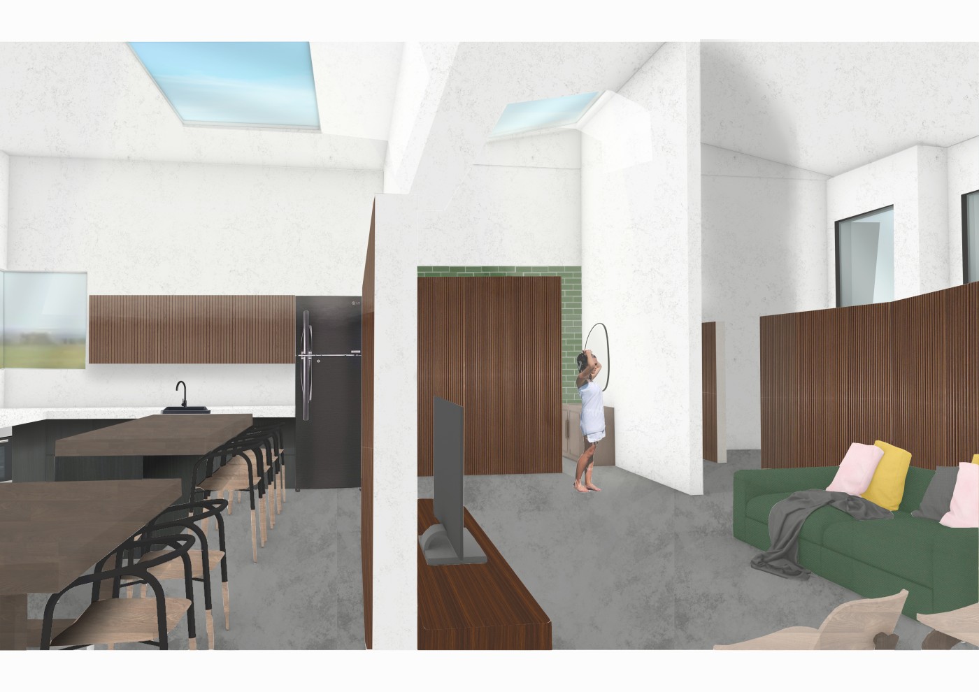 The final project expands on this approach by designing for residents in a retirement home. Given that people of retirement age spend more time at home the research asks whether the design of green spaces within the interior can assist residents in sociality, purpose and wellbeing. The design proposal first establishes the residents overlapping routines.
