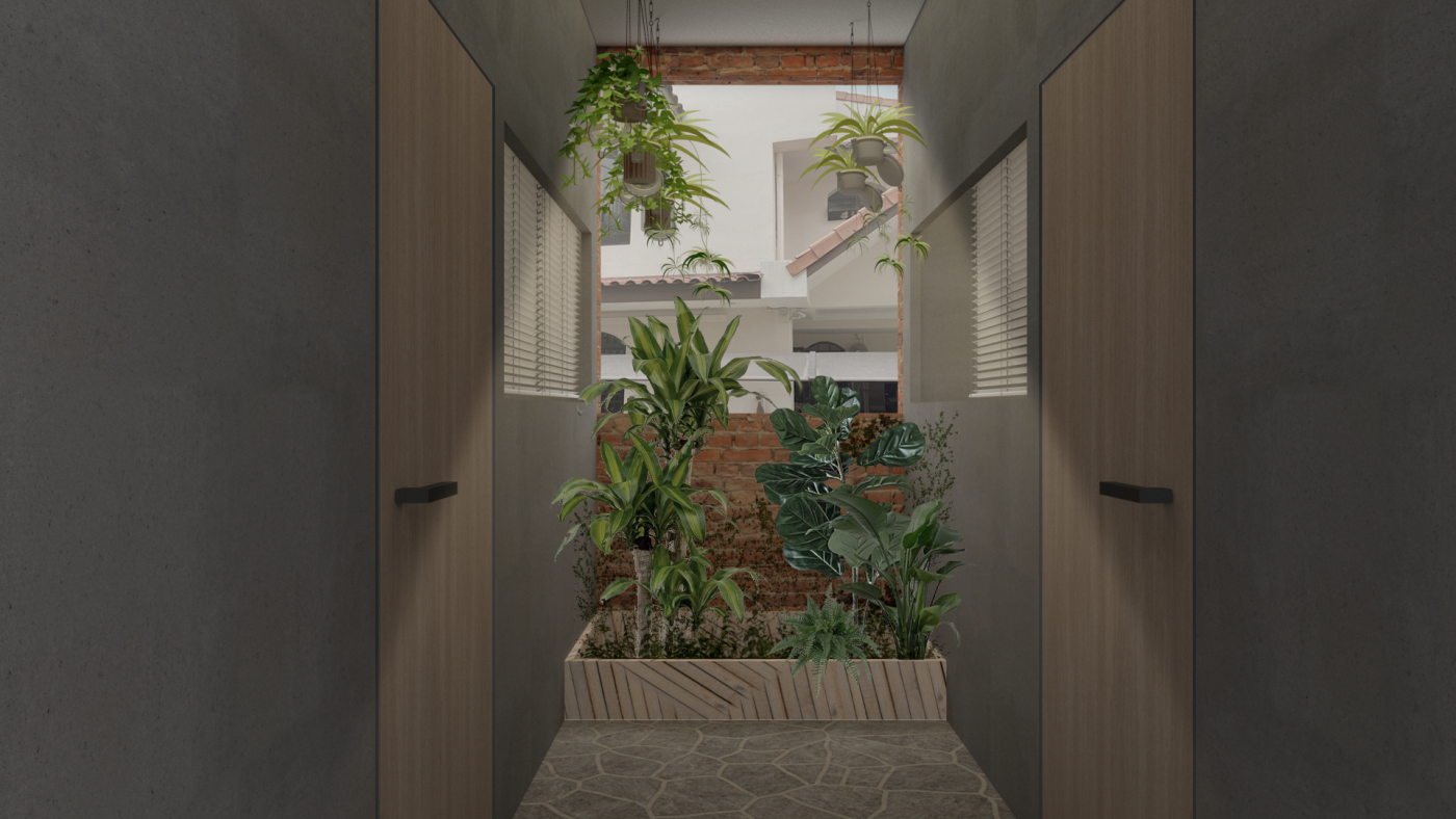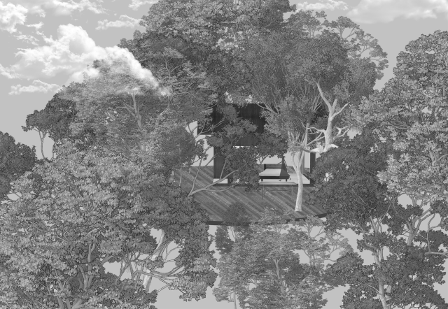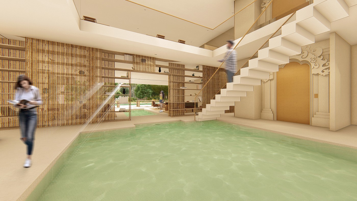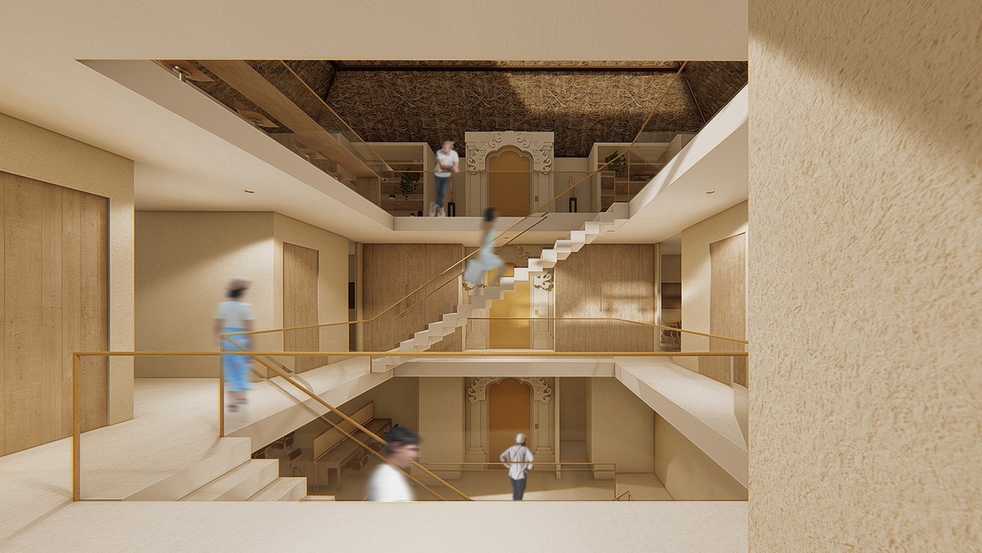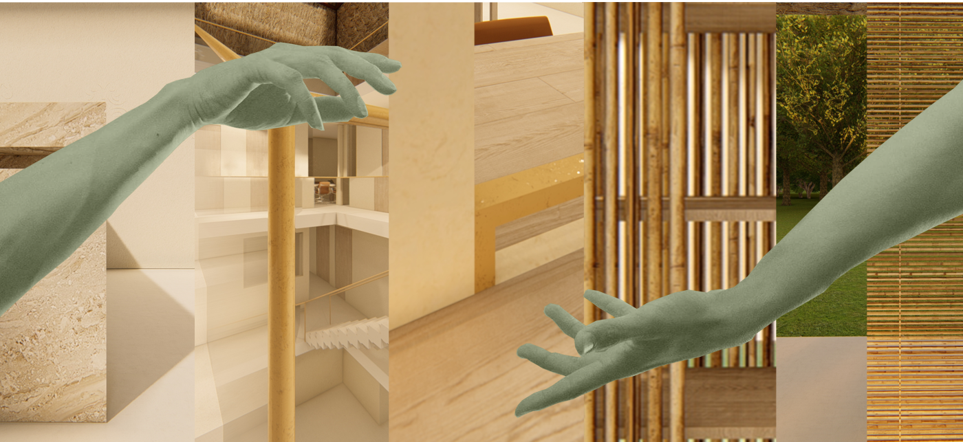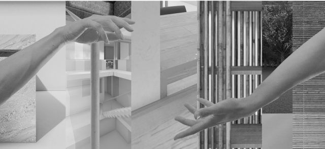 Beyond the (I) is a research project exploring the hierarchy of the visual and haptic senses to create a bodily experience. Influenced by Juhani Pallasmaa’s argument of ocularcentrism, this research emphasises the role of design and tactility in creating an awareness of the present moment. Utilising haptic design processes, Beyond the (I) aspires to create a more meaningful shared space for people to perceive, initiate and sustain experiences. This body of research will be a co-working environment called /kəʊ-/ in Ubud Bali. The project will be a way to regenerate the economy of Bali in a post-pandemic climate taking into account the impact of Covid-19. The phonetic of /kəʊ-/ - co outline the design’s co-working collaborative aspects and will use haptic design ideas to provide community and comfort.The means of haptics are categorised into three different touches as an approach for the design outcome. The haptics are: (i) the body touches the ‘objects’ directly, (ii) the ‘objects’ touches the body directly, (iii) the ‘objects’ touches the body indirectly. In this term, ‘objects’ is defined as all matter, tangible and intangible, emphasising materials, temperature and body movement. The methodologies applied in this project will vary from having significant texture and form, body engagement through modularity and movement, and contrasting elements. The techniques used in this proposal were developed from experiments conducted in a hospitality setting in Melbourne that sought to interrogate, collaborate, and intervene the body and ‘objects’. This project forms a journey that is interchangeable to the inhabitants needs to respond as a way of experiencing the site to move, touch and feel through their skin. Thus, making the experience of the inhabitants more present in the space.