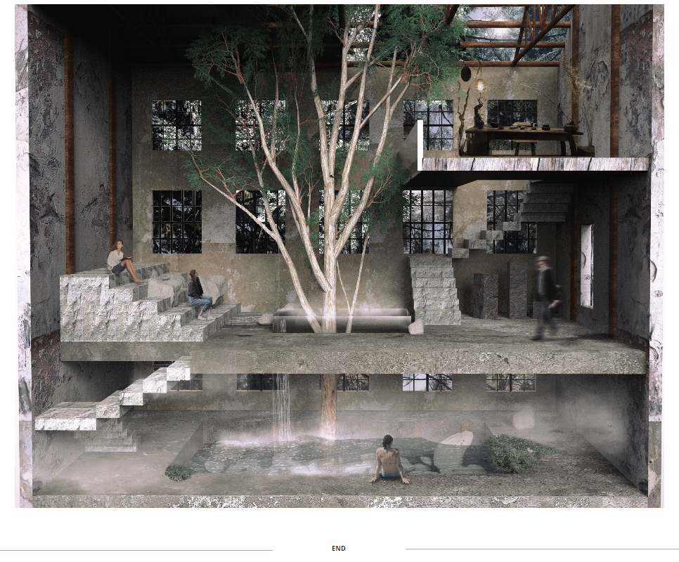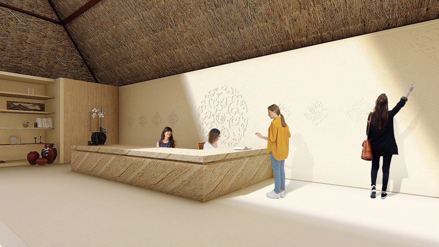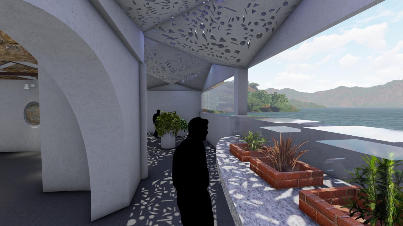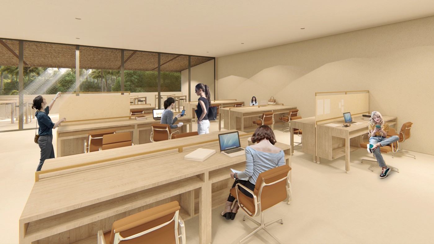 Beyond the (I) is a research project exploring the hierarchy of the visual and haptic senses to create a bodily experience. Influenced by Juhani Pallasmaa’s argument of ocularcentrism, this research emphasises the role of design and tactility in creating an awareness of the present moment. Utilising haptic design processes, Beyond the (I) aspires to create a more meaningful shared space for people to perceive, initiate and sustain experiences. This body of research will be a co-working environment called /kəʊ-/ in Ubud Bali. The project will be a way to regenerate the economy of Bali in a post-pandemic climate taking into account the impact of Covid-19. The phonetic of /kəʊ-/ - co outline the design’s co-working collaborative aspects and will use haptic design ideas to provide community and comfort.The means of haptics are categorised into three different touches as an approach for the design outcome. The haptics are: (i) the body touches the ‘objects’ directly, (ii) the ‘objects’ touches the body directly, (iii) the ‘objects’ touches the body indirectly. In this term, ‘objects’ is defined as all matter, tangible and intangible, emphasising materials, temperature and body movement. The methodologies applied in this project will vary from having significant texture and form, body engagement through modularity and movement, and contrasting elements. The techniques used in this proposal were developed from experiments conducted in a hospitality setting in Melbourne that sought to interrogate, collaborate, and intervene the body and ‘objects’. This project forms a journey that is interchangeable to the inhabitants needs to respond as a way of experiencing the site to move, touch and feel through their skin. Thus, making the experience of the inhabitants more present in the space.