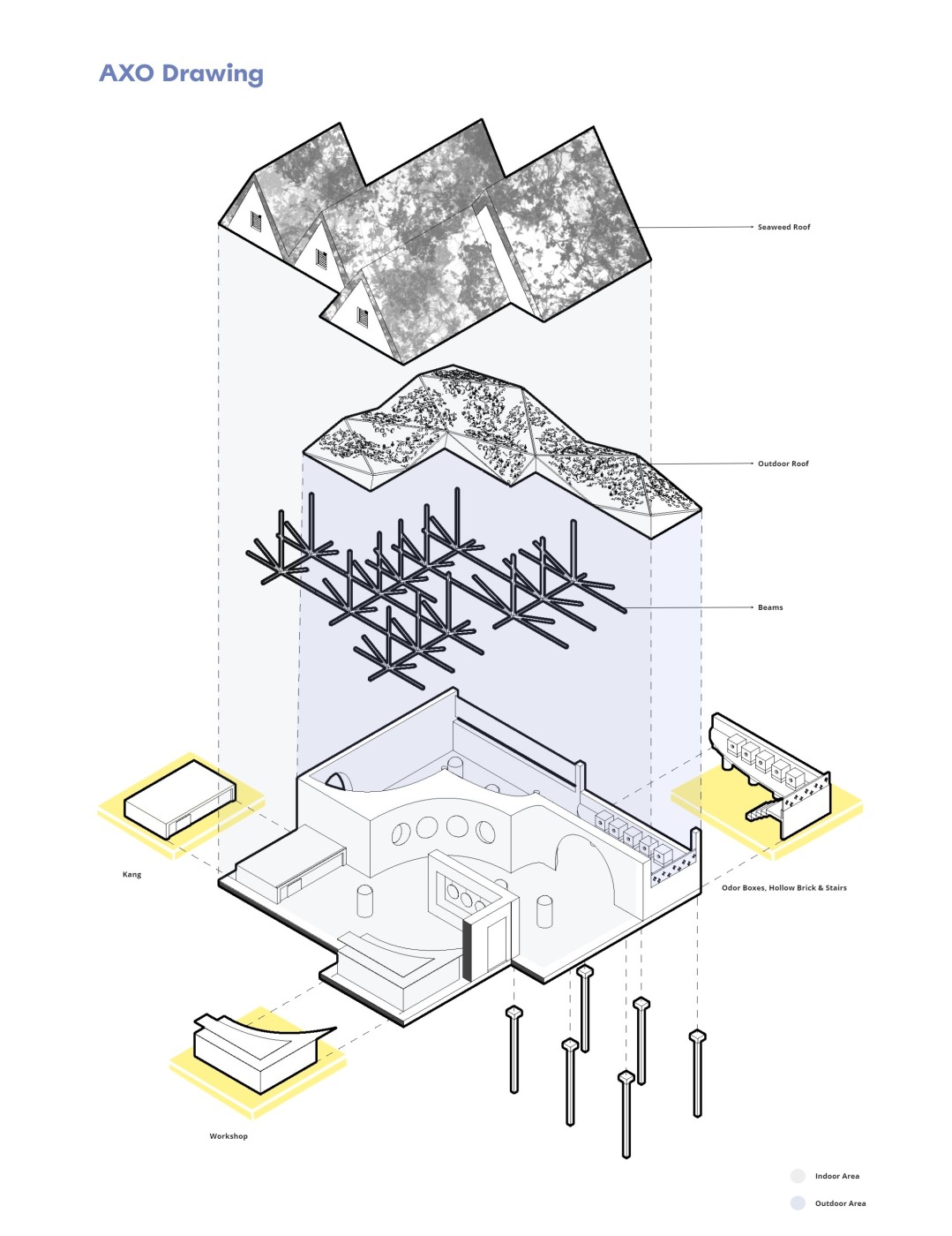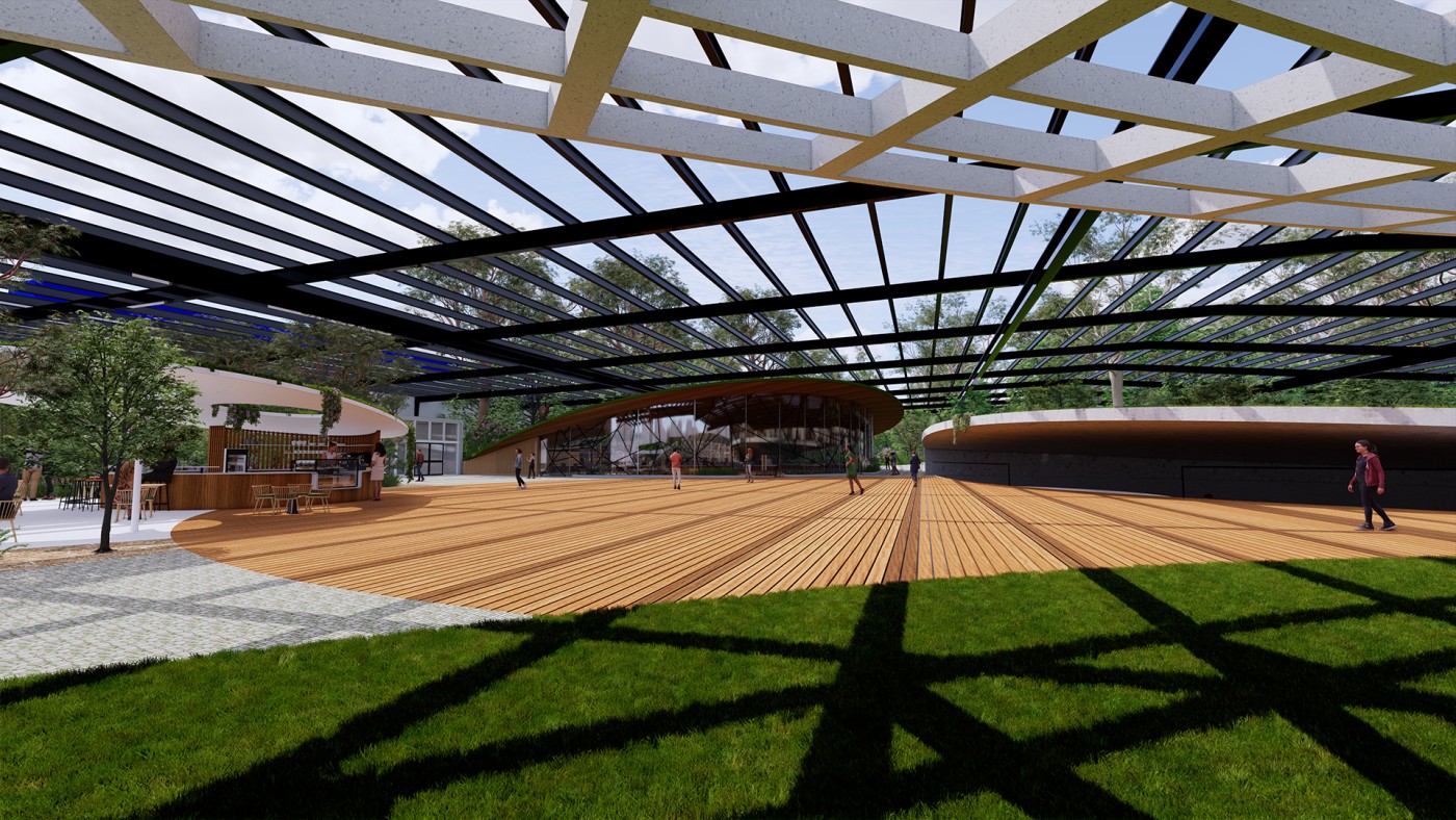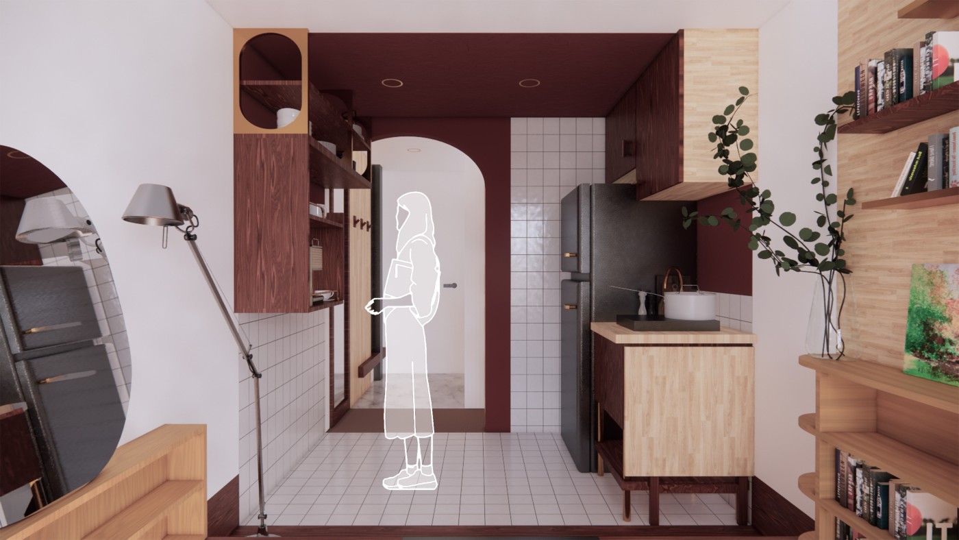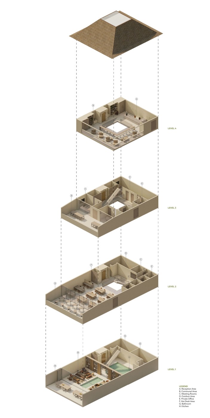 Beyond the (I) is a research project exploring the hierarchy of the visual and haptic senses to create a bodily experience. Influenced by Juhani Pallasmaa’s argument of ocularcentrism, this research emphasises the role of design and tactility in creating an awareness of the present moment. Utilising haptic design processes, Beyond the (I) aspires to create a more meaningful shared space for people to perceive, initiate and sustain experiences. This body of research will be a co-working environment called /kəʊ-/ in Ubud Bali. The project will be a way to regenerate the economy of Bali in a post-pandemic climate taking into account the impact of Covid-19. The phonetic of /kəʊ-/ - co outline the design’s co-working collaborative aspects and will use haptic design ideas to provide community and comfort.The means of haptics are categorised into three different touches as an approach for the design outcome. The haptics are: (i) the body touches the ‘objects’ directly, (ii) the ‘objects’ touches the body directly, (iii) the ‘objects’ touches the body indirectly. In this term, ‘objects’ is defined as all matter, tangible and intangible, emphasising materials, temperature and body movement. The methodologies applied in this project will vary from having significant texture and form, body engagement through modularity and movement, and contrasting elements. The techniques used in this proposal were developed from experiments conducted in a hospitality setting in Melbourne that sought to interrogate, collaborate, and intervene the body and ‘objects’. This project forms a journey that is interchangeable to the inhabitants needs to respond as a way of experiencing the site to move, touch and feel through their skin. Thus, making the experience of the inhabitants more present in the space.