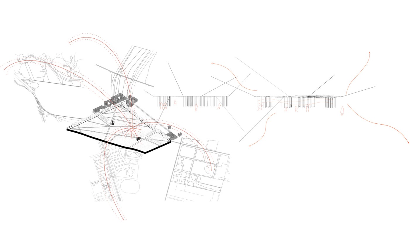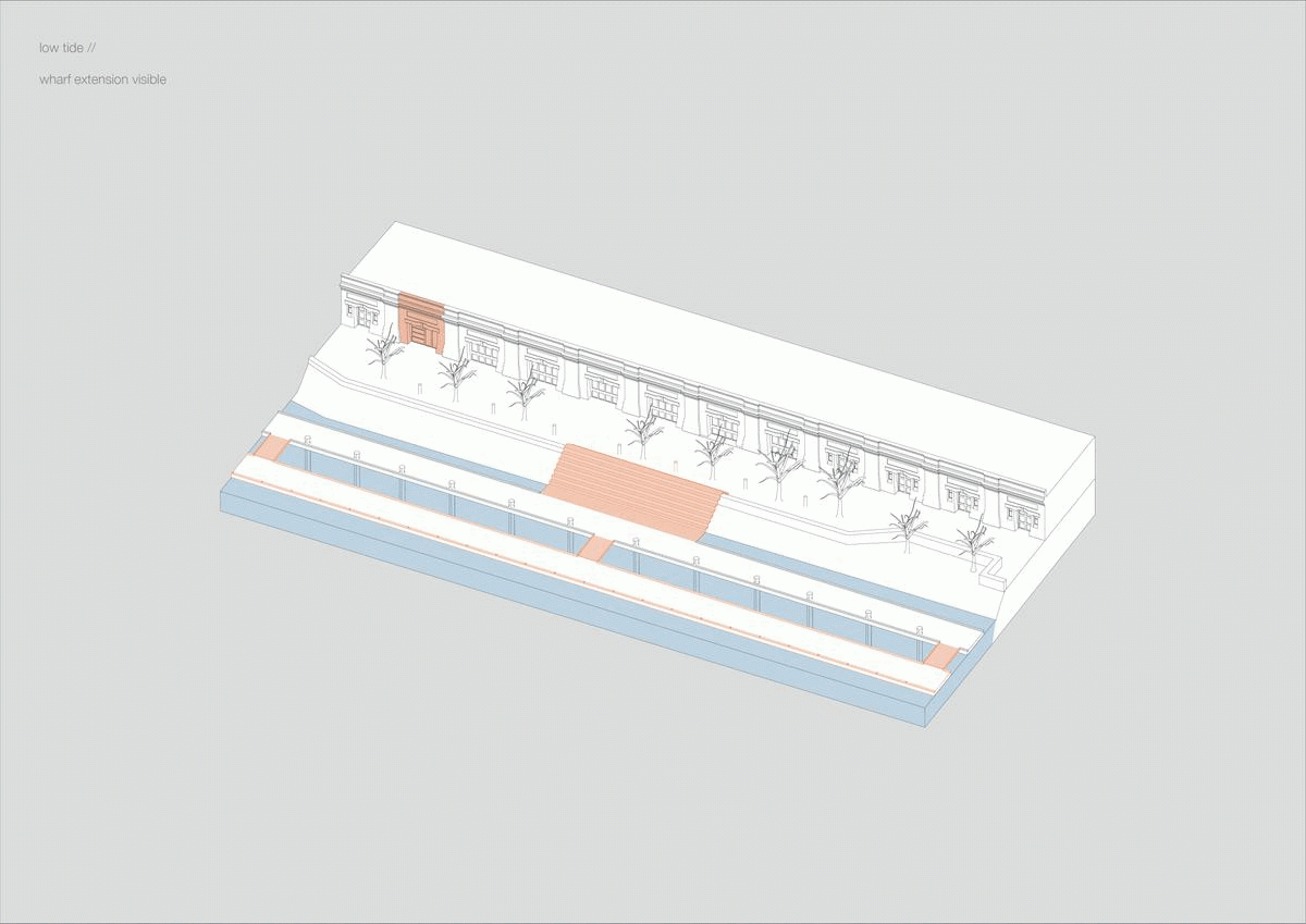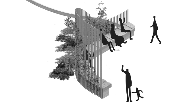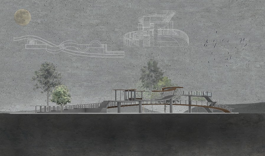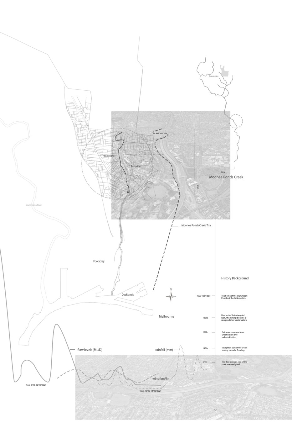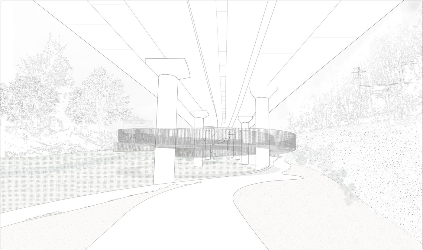 The design proposal is situated at sites along the Moonee Ponds Creek in Flemington which sits between a public housing estate and a freeway overpass. The design explores the possibility of multifunctional nodes to bridge the social division of public housing residents and the wider community. It also draws influence from the temporal nature of the waterway and creates dialogue with its mediated movement with increased urbanisation.