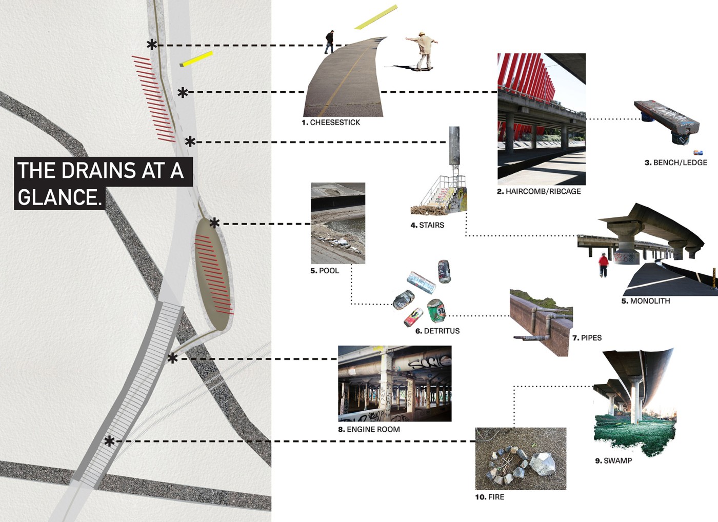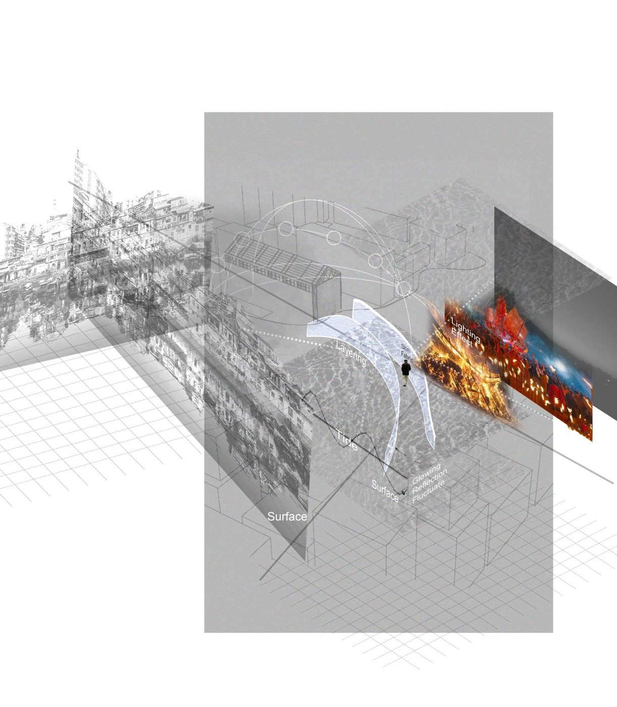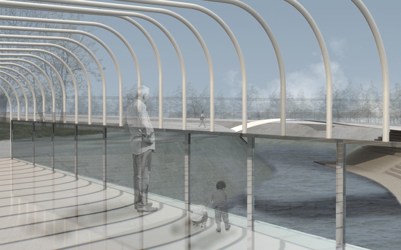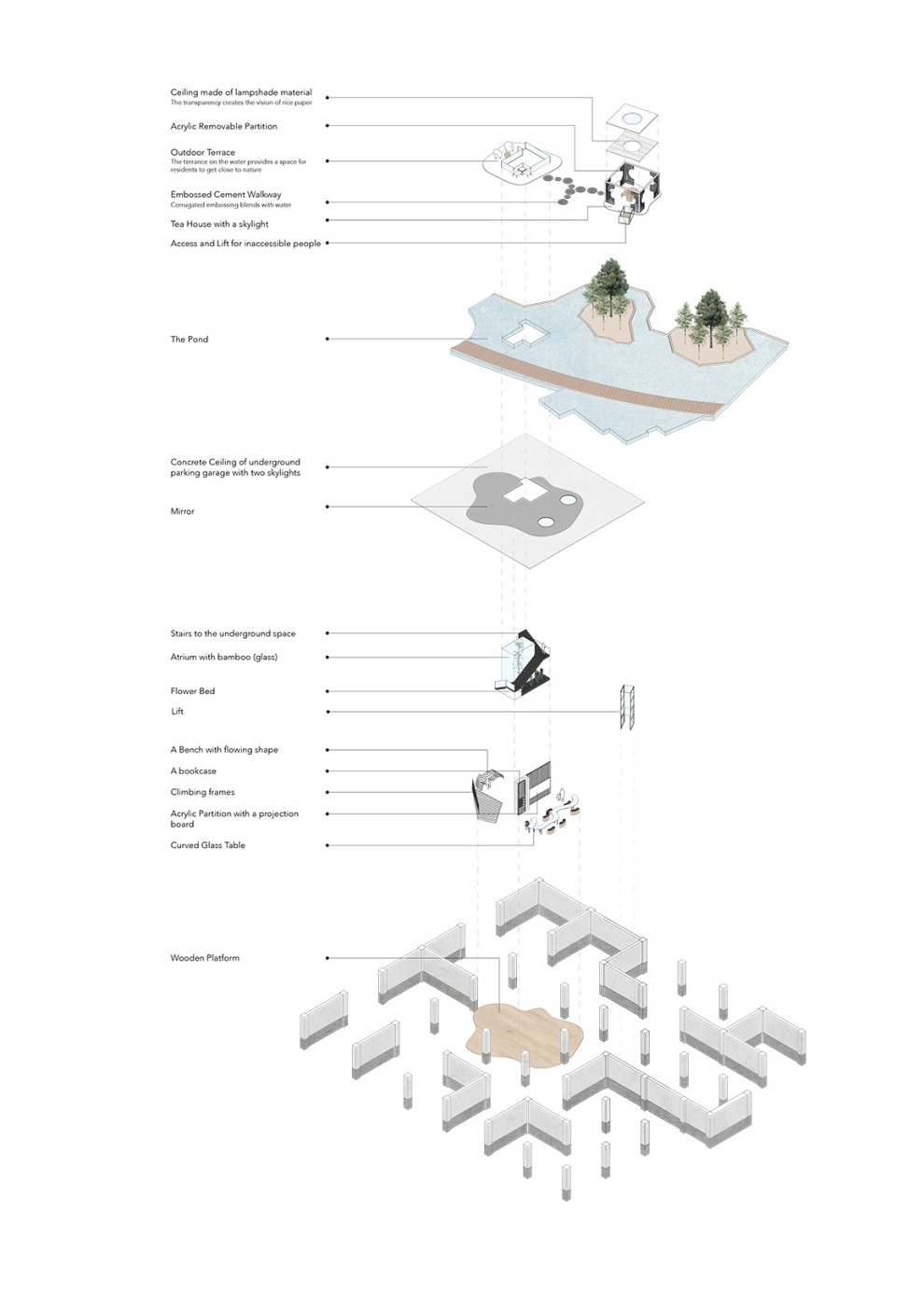 The design proposal is situated at sites along the Moonee Ponds Creek in Flemington which sits between a public housing estate and a freeway overpass. The design explores the possibility of multifunctional nodes to bridge the social division of public housing residents and the wider community. It also draws influence from the temporal nature of the waterway and creates dialogue with its mediated movement with increased urbanisation.