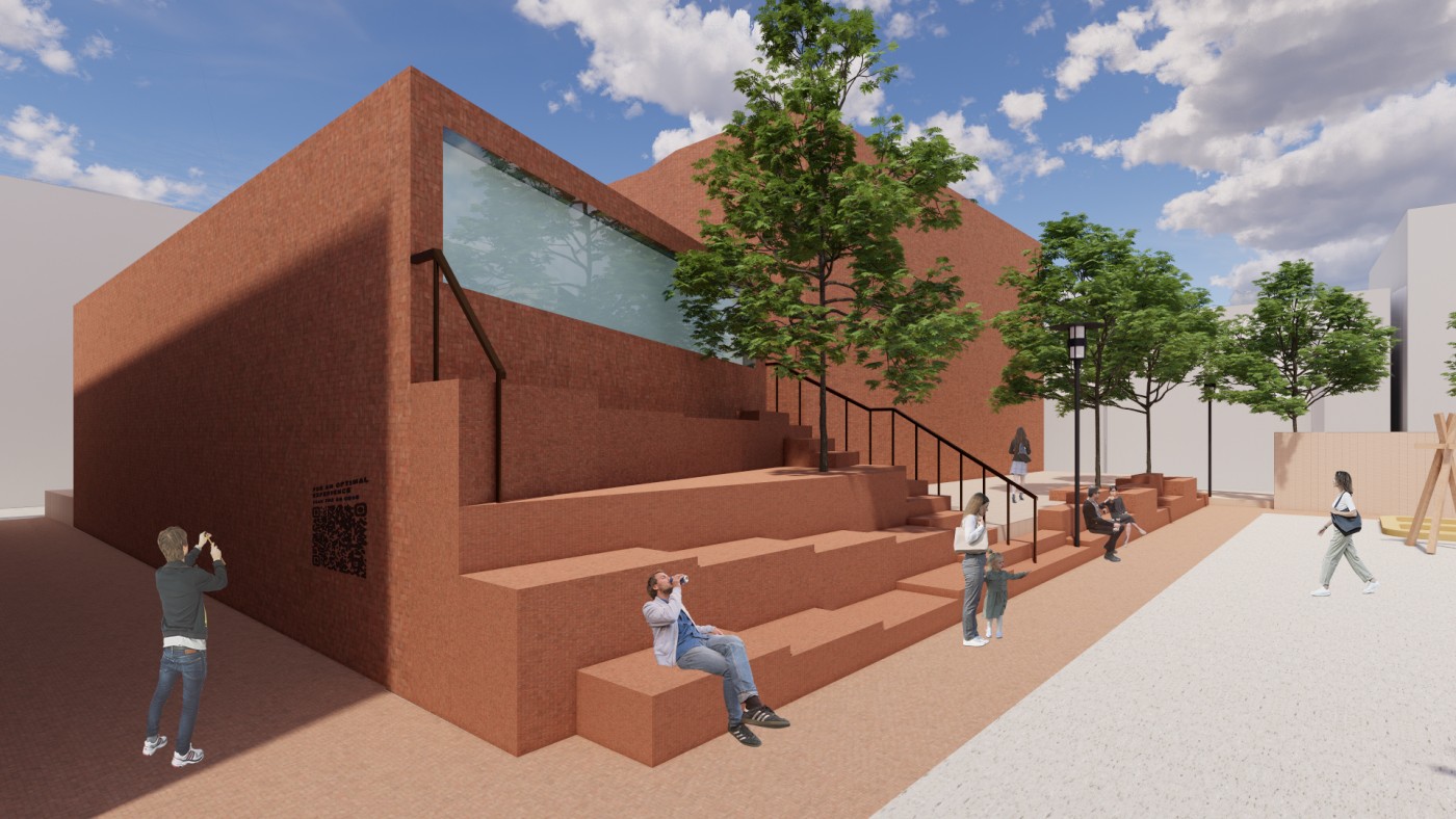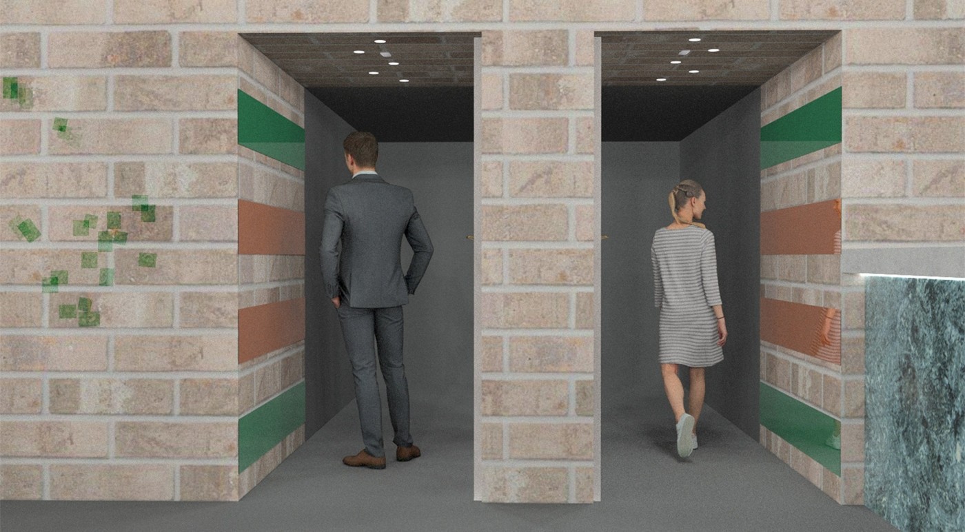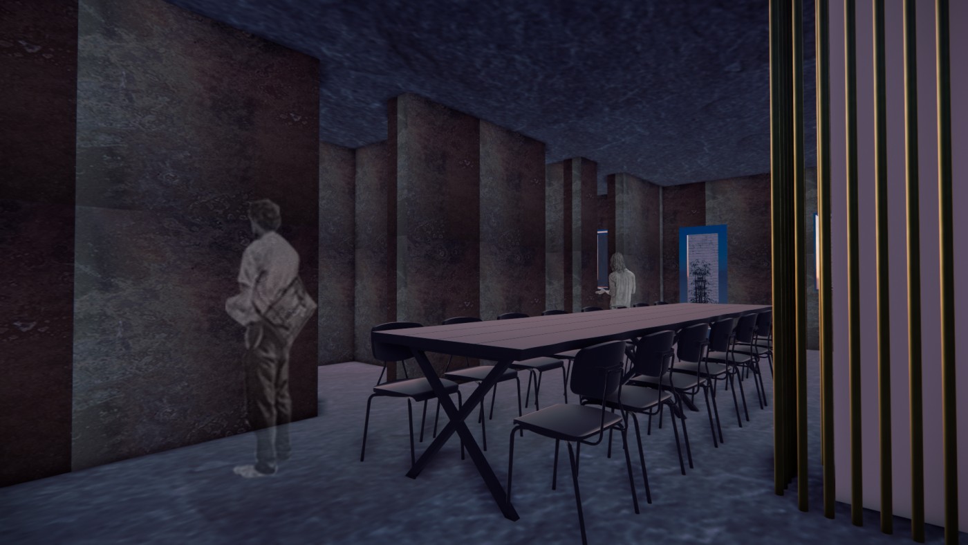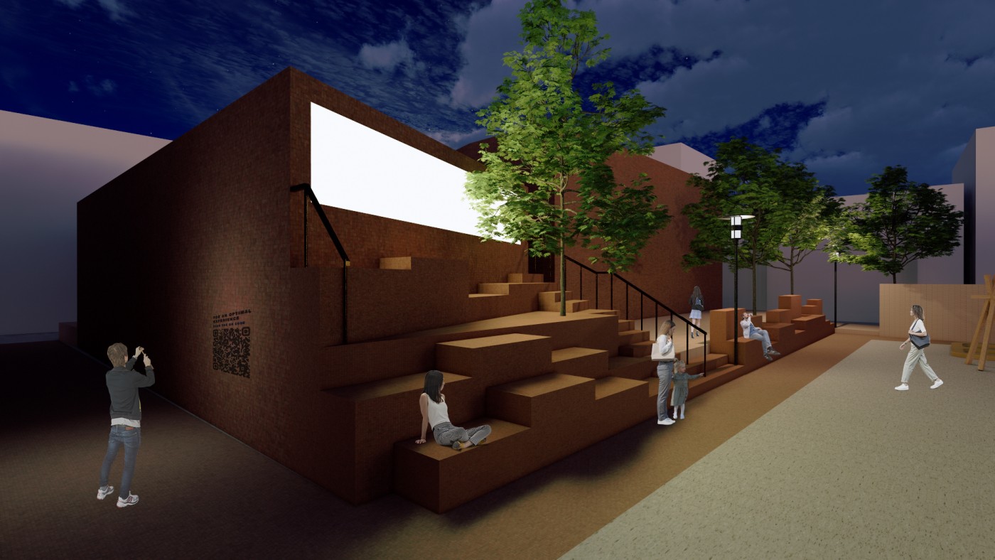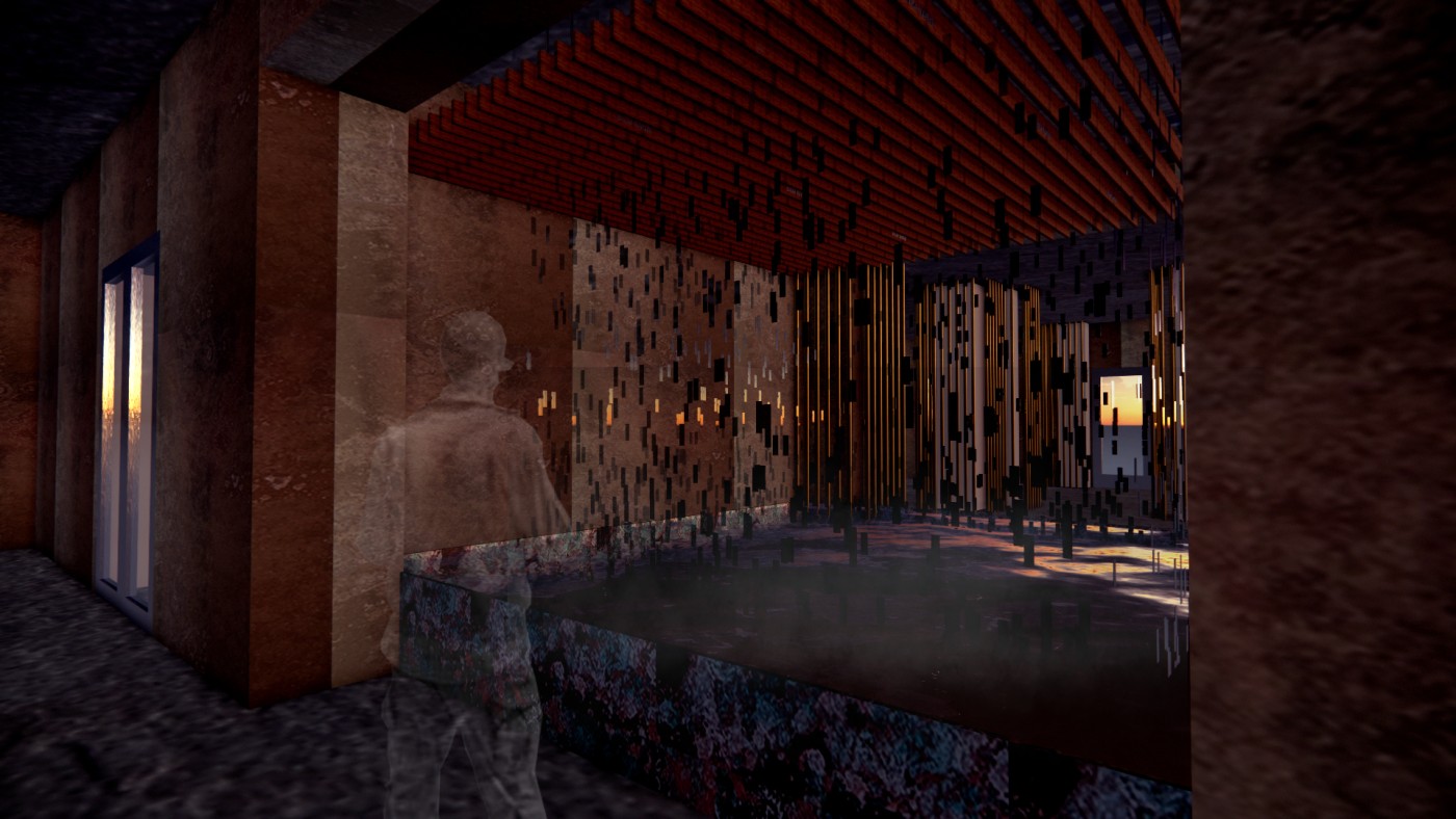 The interventions involve digital screens, mirrors, hidden QR codes that become activated through the visitor's presence. Patterns and information are collected to present back into the site, where a series of immersive spatial experiences then reinforce the visitor's action through their photographic, scanning and viewing modes. A mangling of space-time emerges, as the present and the past become archived and displayed back in the site via the digital screen–an emerging interior is revealed.