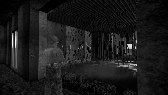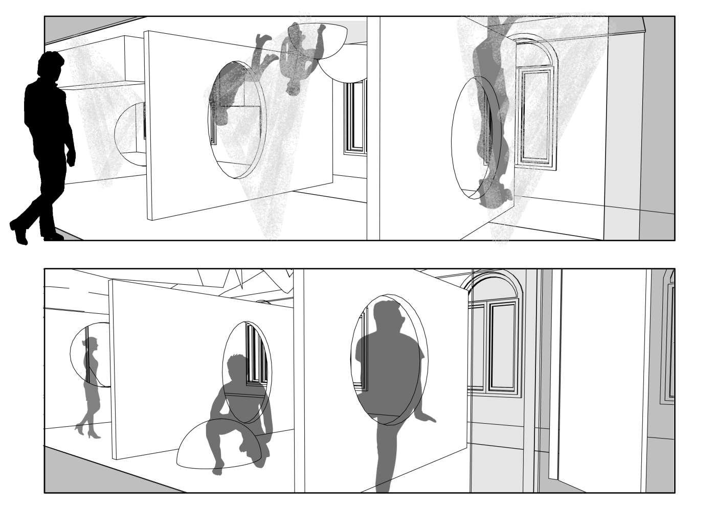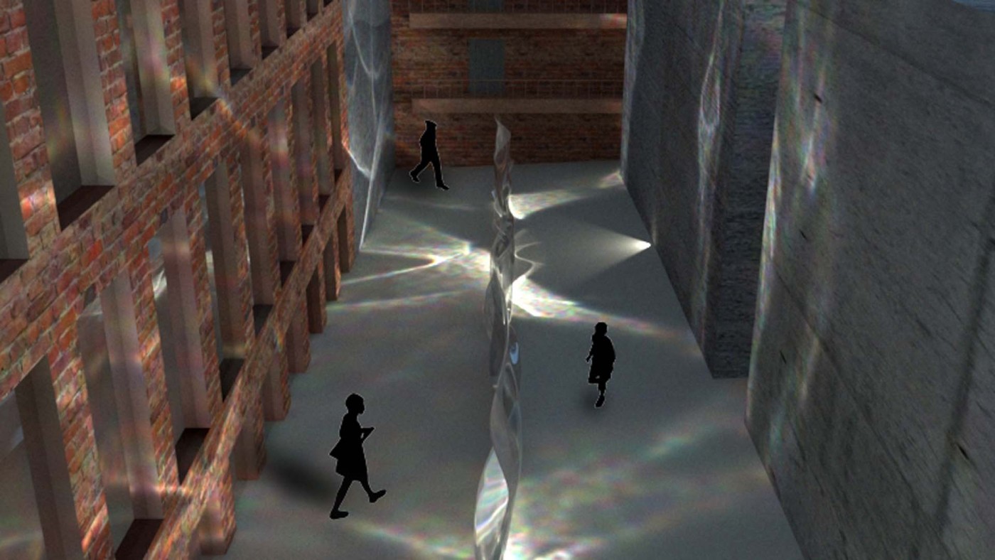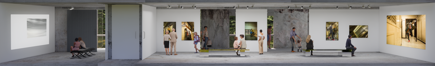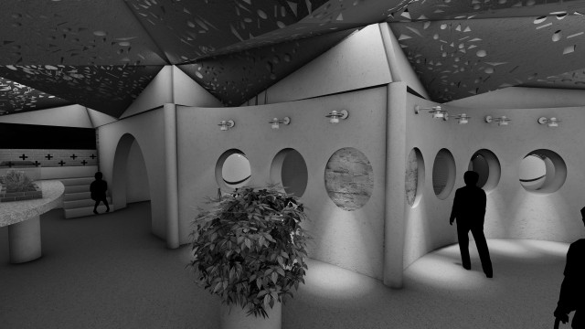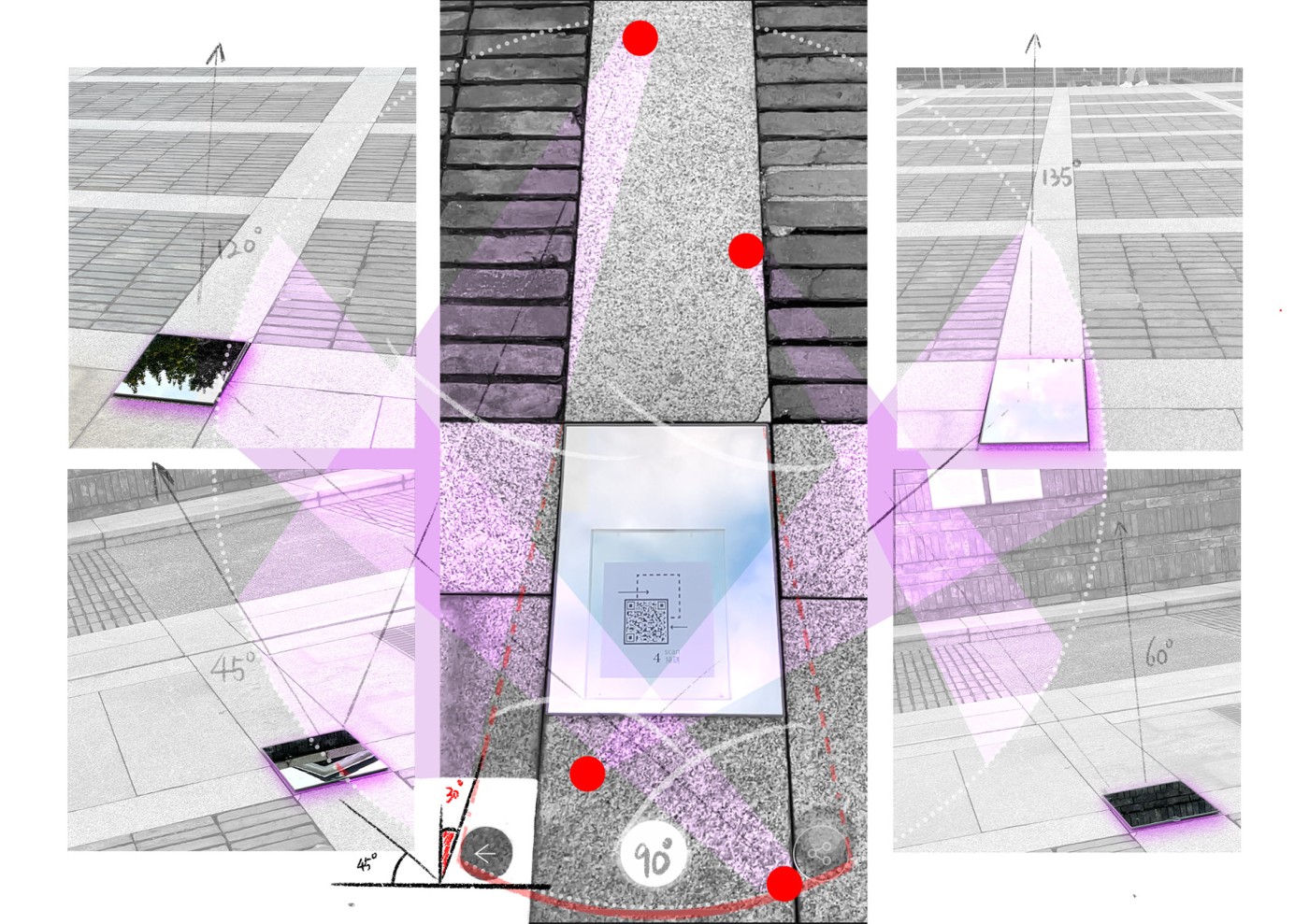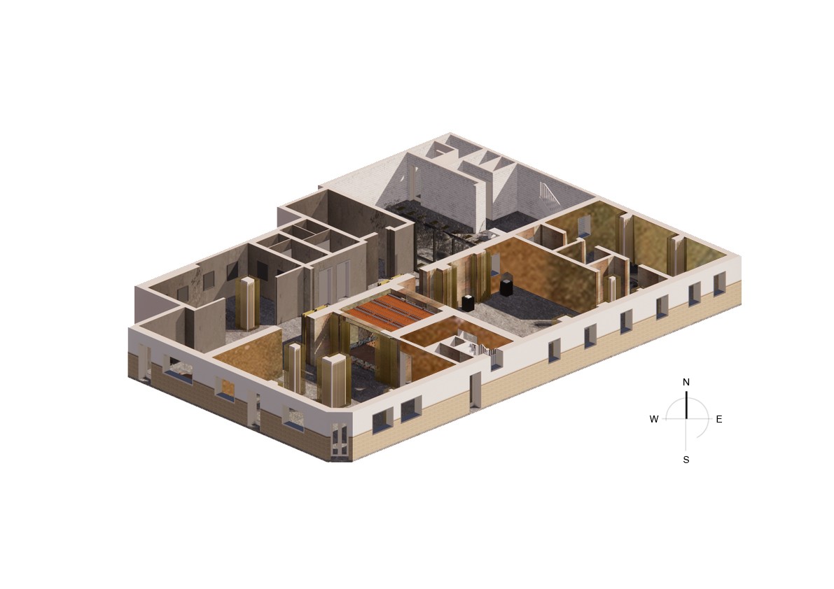 The interventions involve digital screens, mirrors, hidden QR codes that become activated through the visitor's presence. Patterns and information are collected to present back into the site, where a series of immersive spatial experiences then reinforce the visitor's action through their photographic, scanning and viewing modes. A mangling of space-time emerges, as the present and the past become archived and displayed back in the site via the digital screen–an emerging interior is revealed.