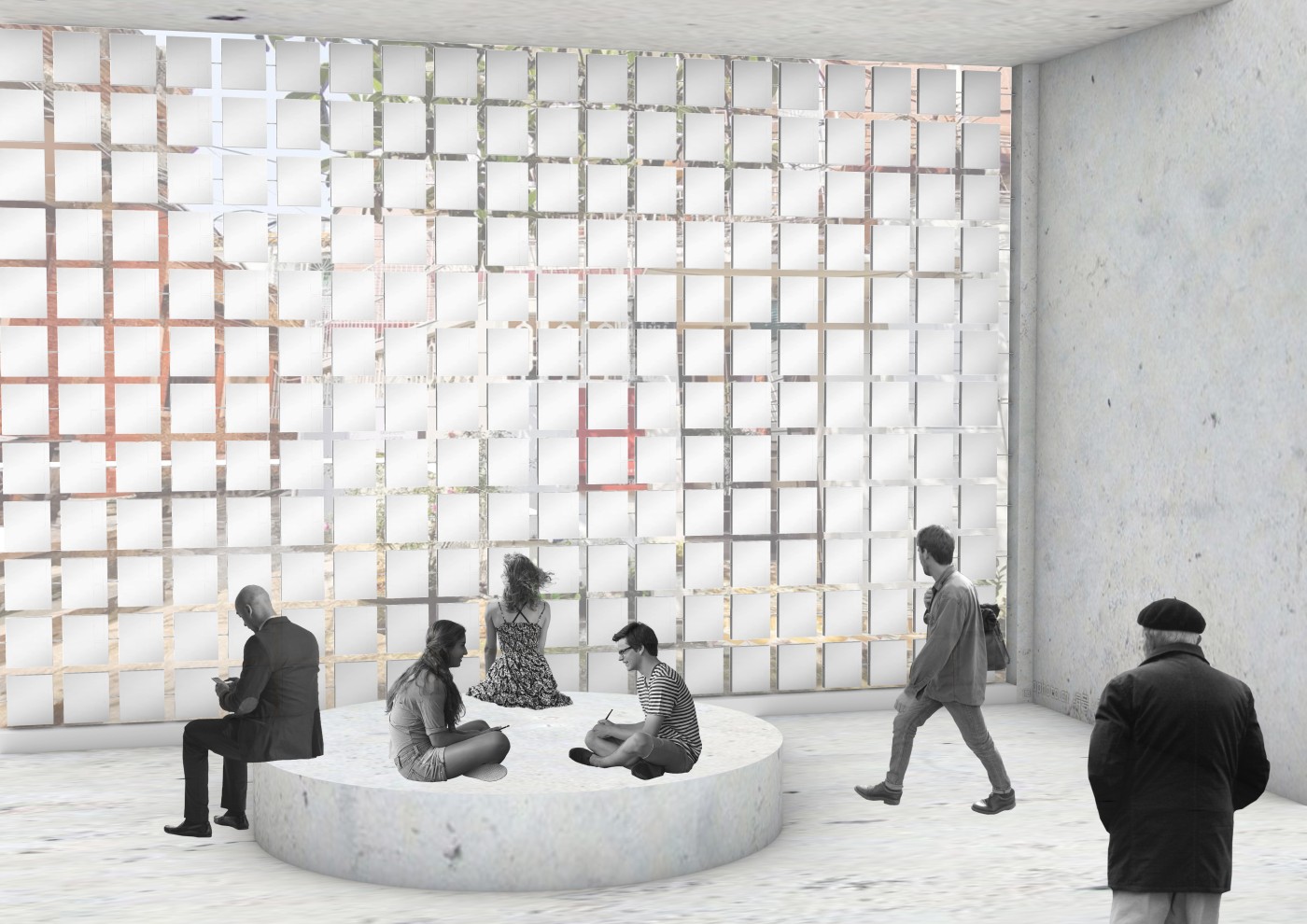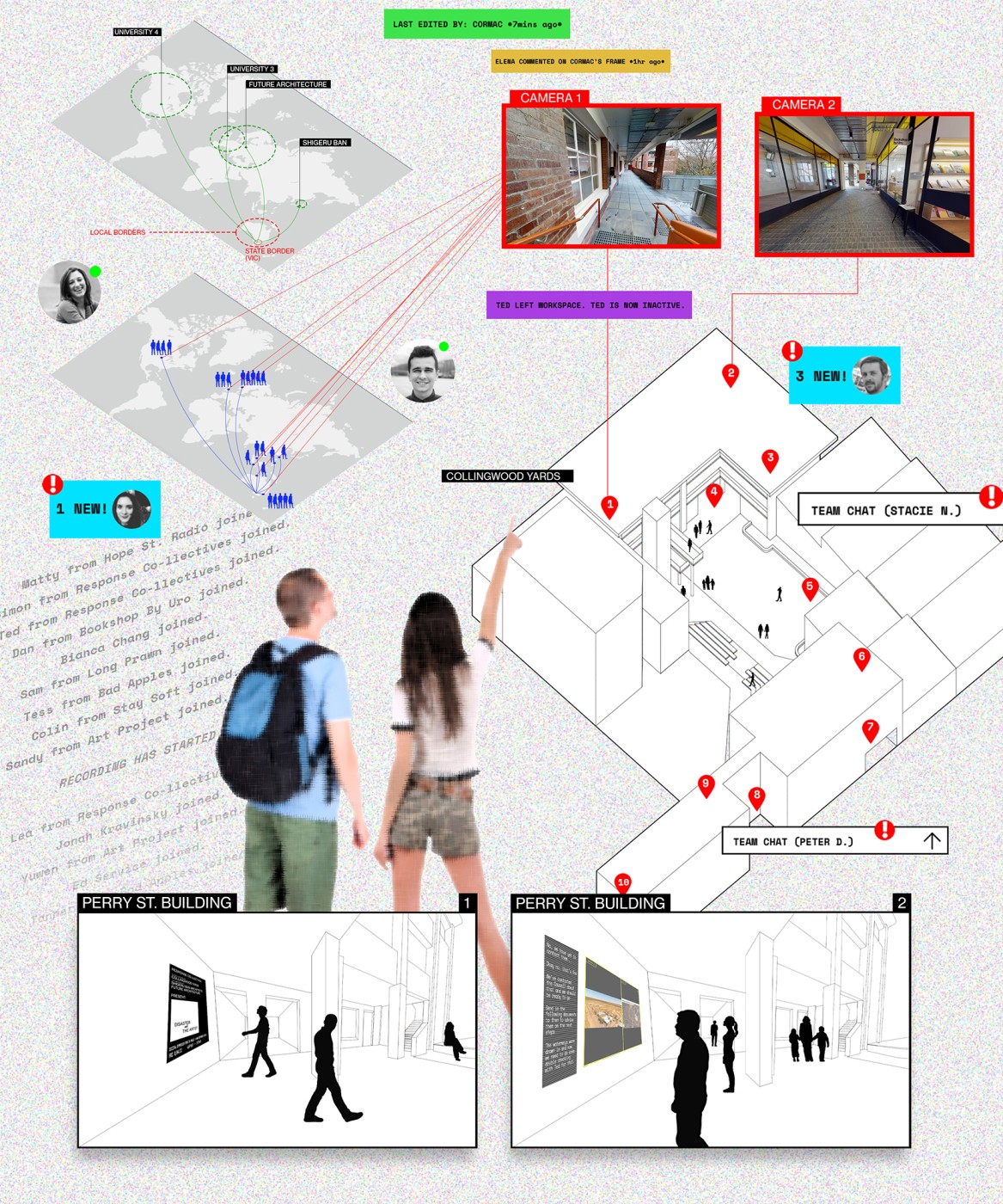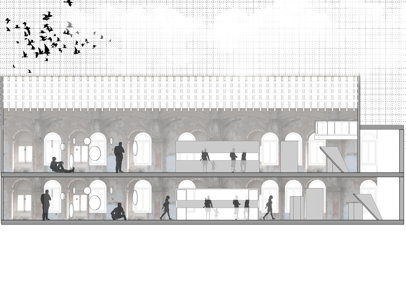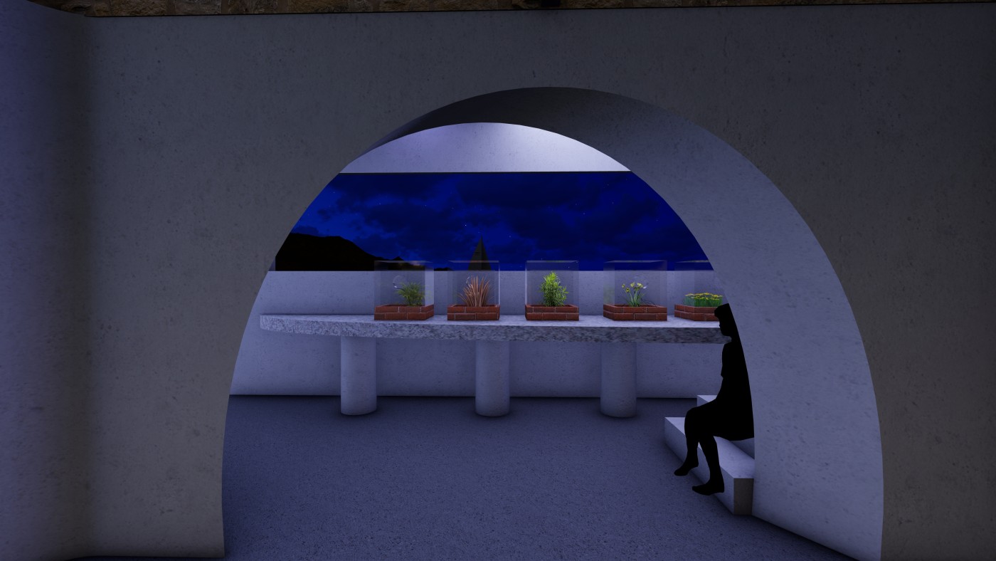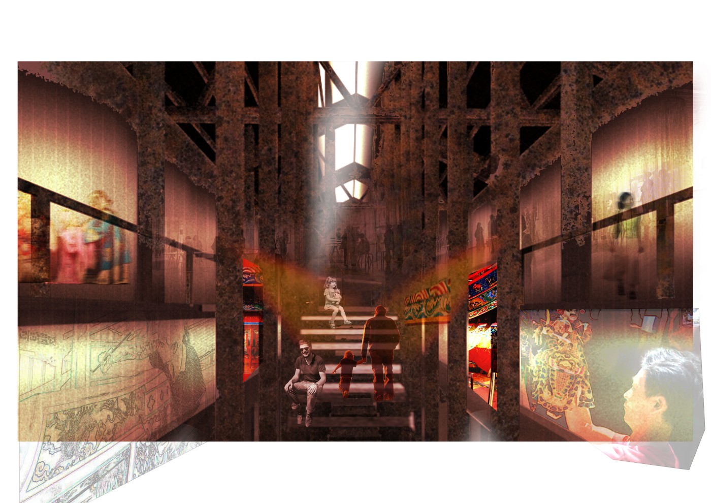 The interventions involve digital screens, mirrors, hidden QR codes that become activated through the visitor's presence. Patterns and information are collected to present back into the site, where a series of immersive spatial experiences then reinforce the visitor's action through their photographic, scanning and viewing modes. A mangling of space-time emerges, as the present and the past become archived and displayed back in the site via the digital screen–an emerging interior is revealed.