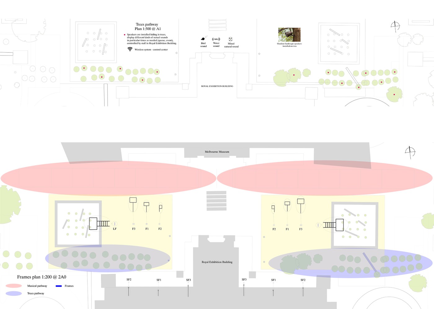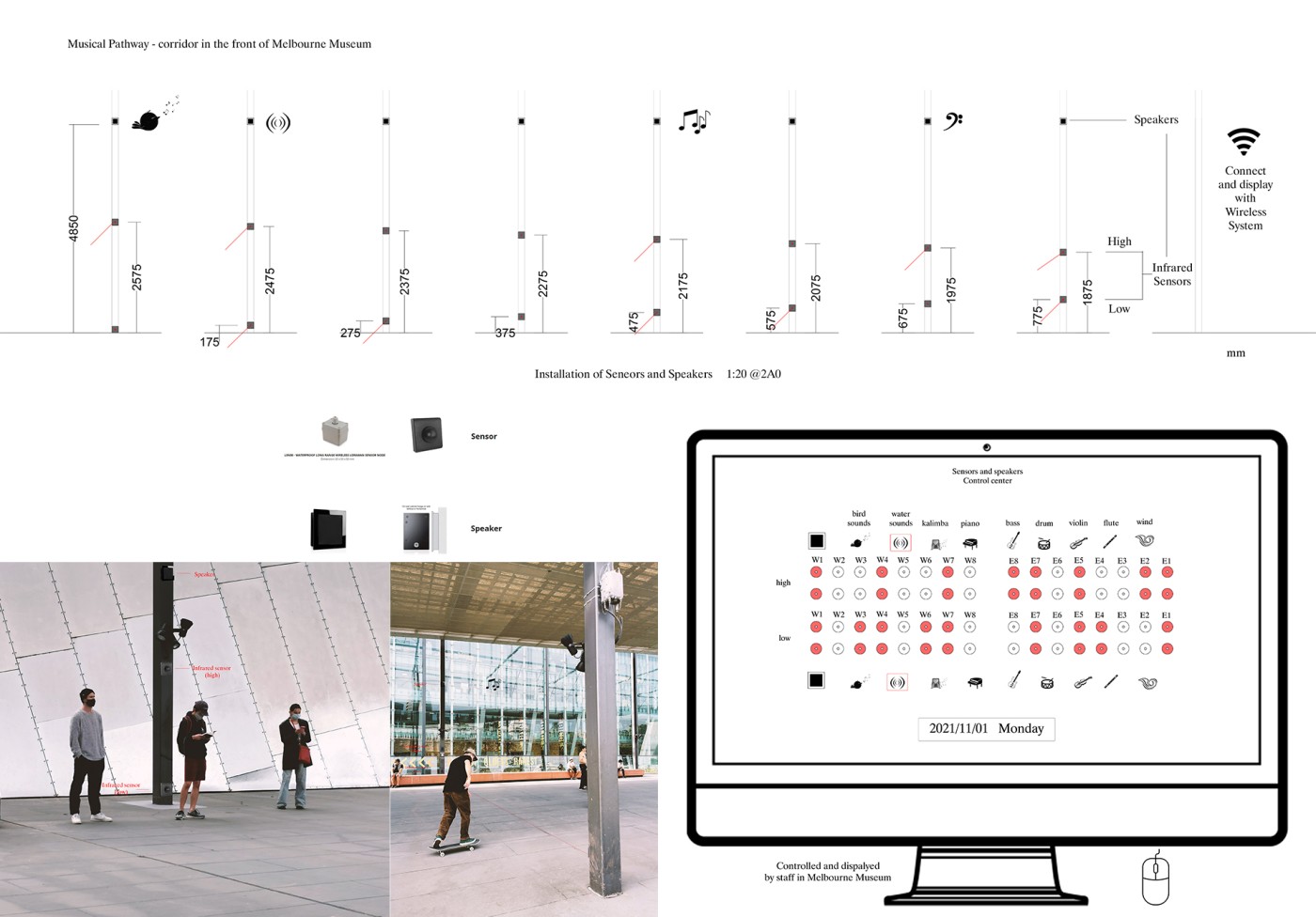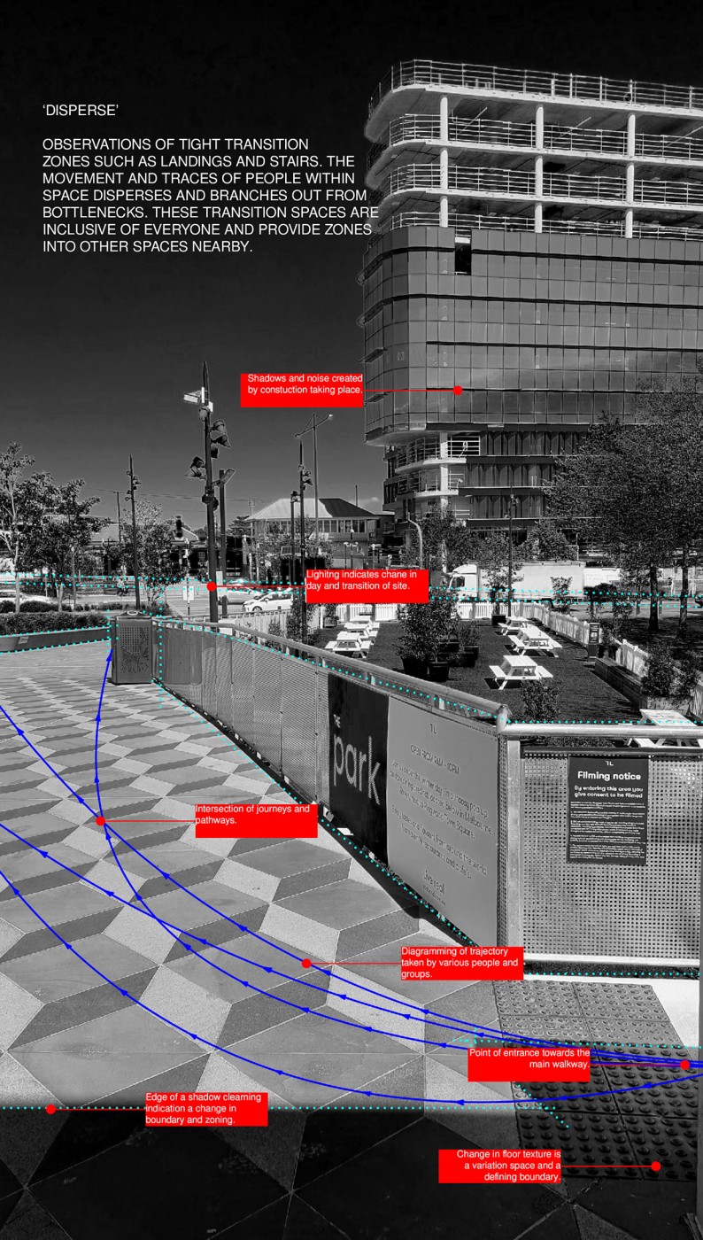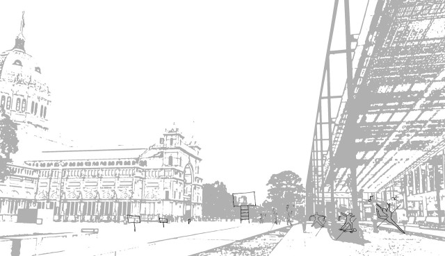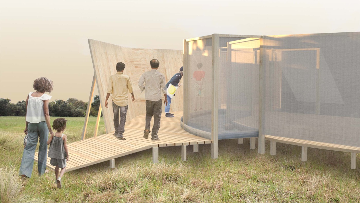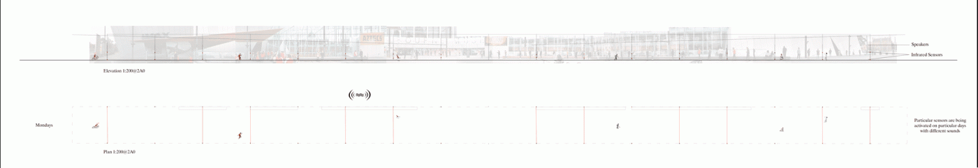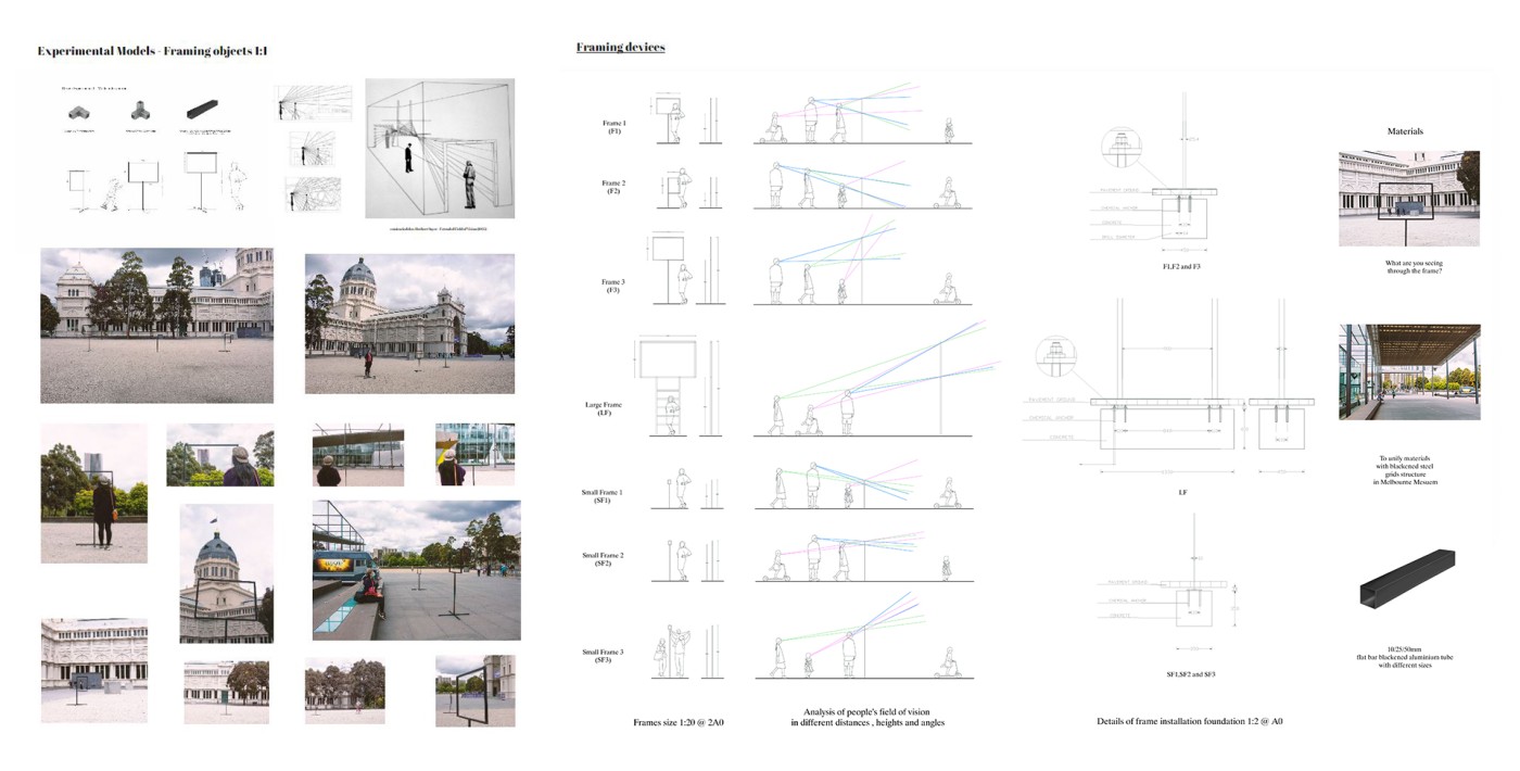 This project has aimed to design a sensorial system that links to a solution for waiting in the large forecourt between the Royal Exhibition Building and Melbourne Museum. Although the design process is developing with the storyline of Victorian people combatting the virus and getting vaccinated, it is a permanent visual and aural intervention into the site. Experimenting with, and responding to different types of waiting, this Major Project integrates into different places, scales, times, adaptations, and uses with two main elements: a sonic installation with sensors and speakers, and framing devices which make people encounter new experiences within the site.