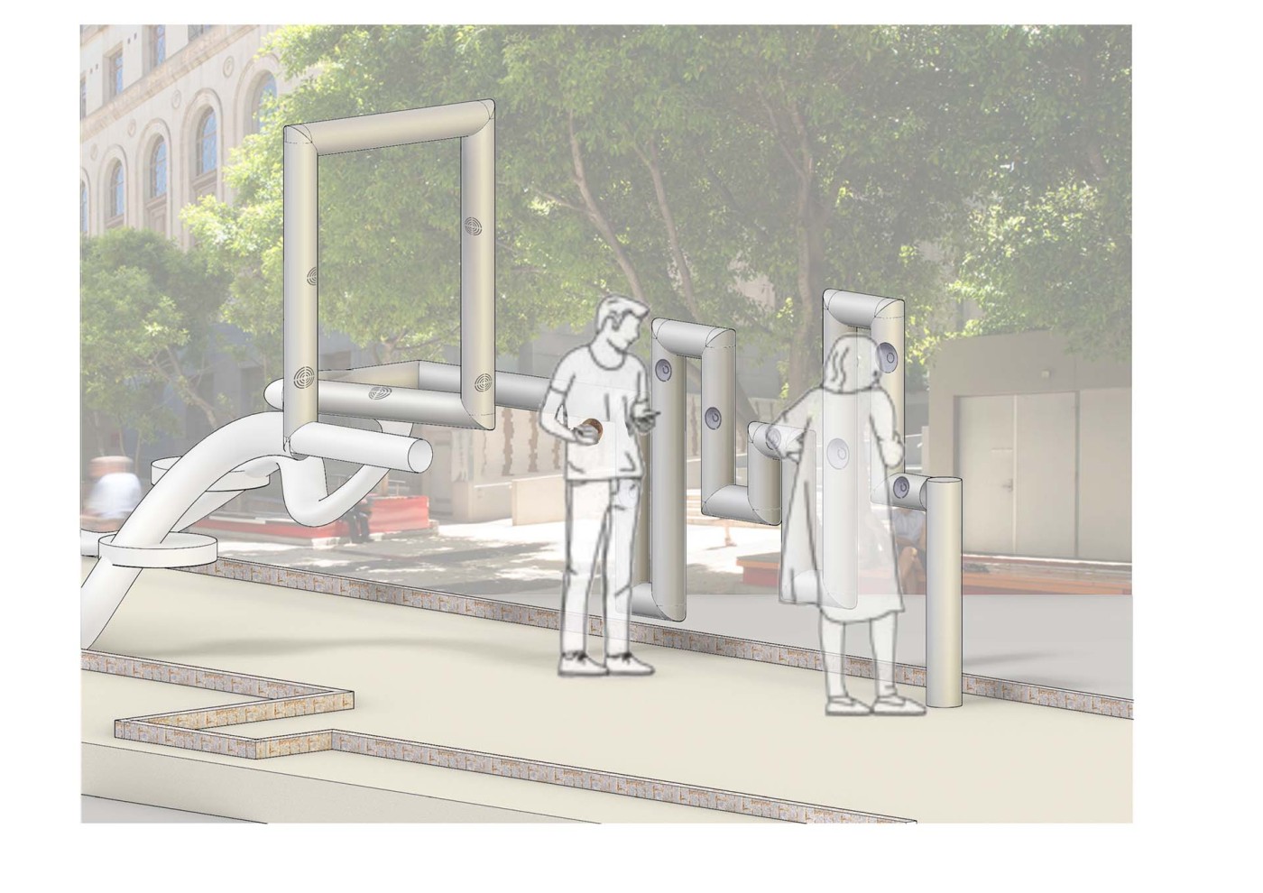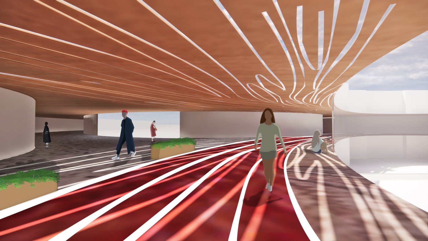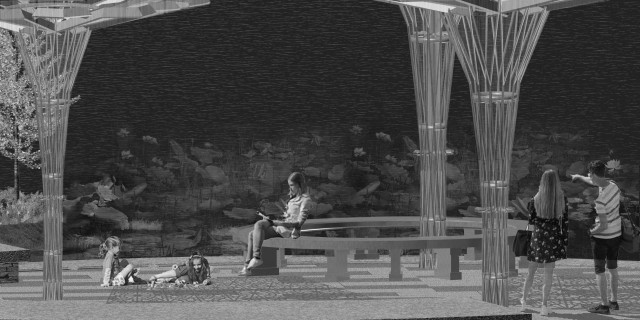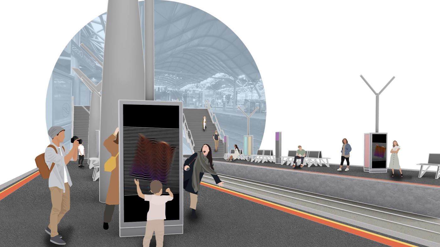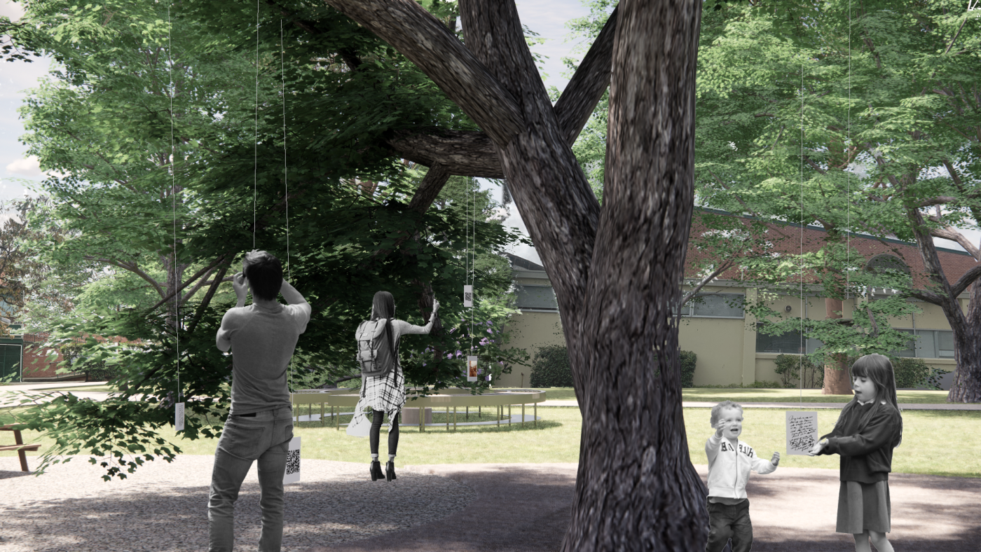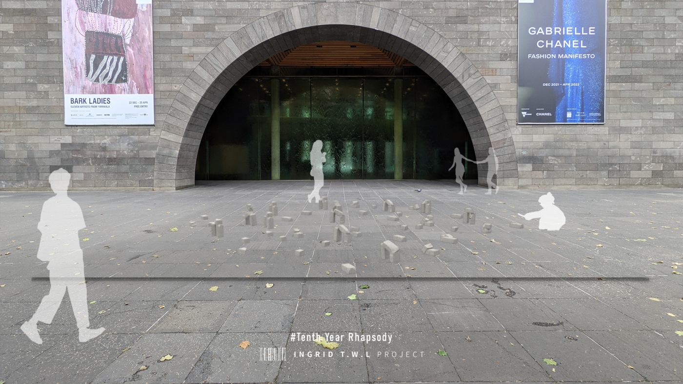 This project has aimed to design a sensorial system that links to a solution for waiting in the large forecourt between the Royal Exhibition Building and Melbourne Museum. Although the design process is developing with the storyline of Victorian people combatting the virus and getting vaccinated, it is a permanent visual and aural intervention into the site. Experimenting with, and responding to different types of waiting, this Major Project integrates into different places, scales, times, adaptations, and uses with two main elements: a sonic installation with sensors and speakers, and framing devices which make people encounter new experiences within the site.