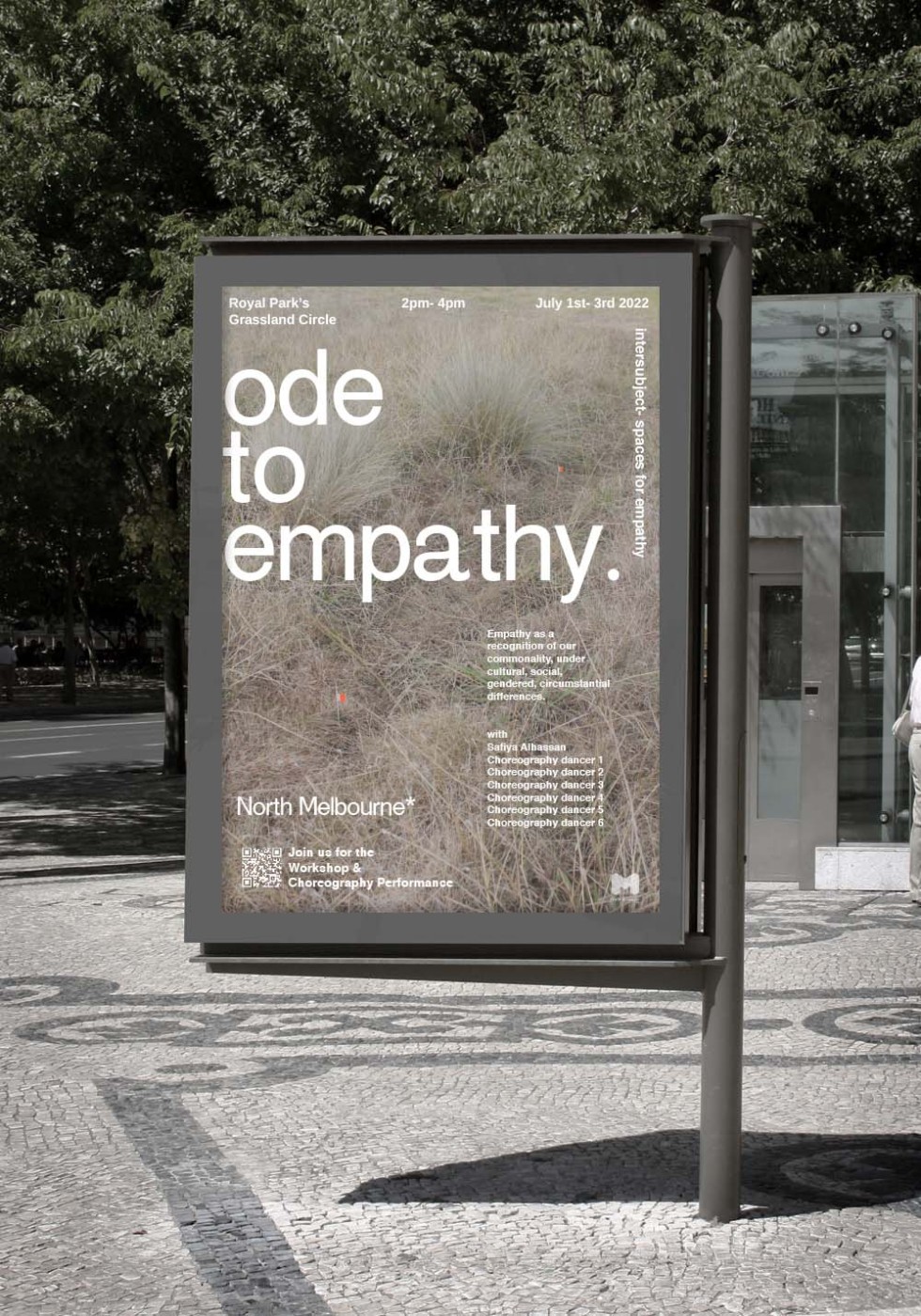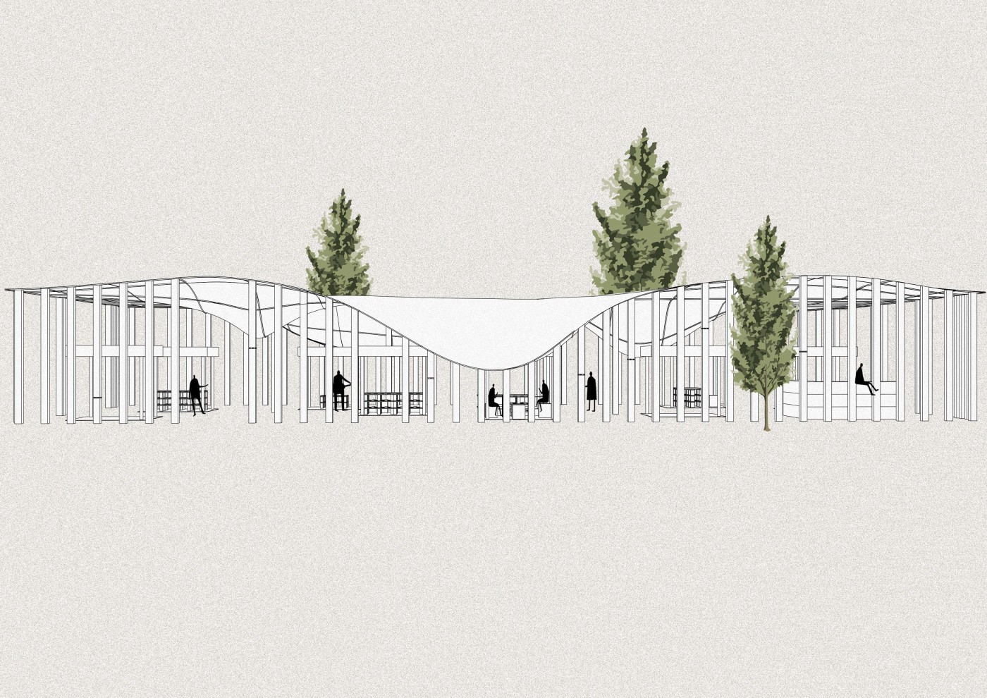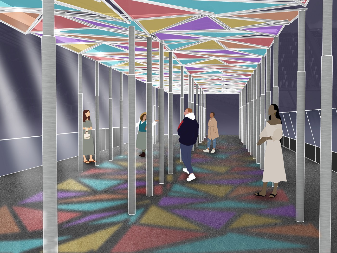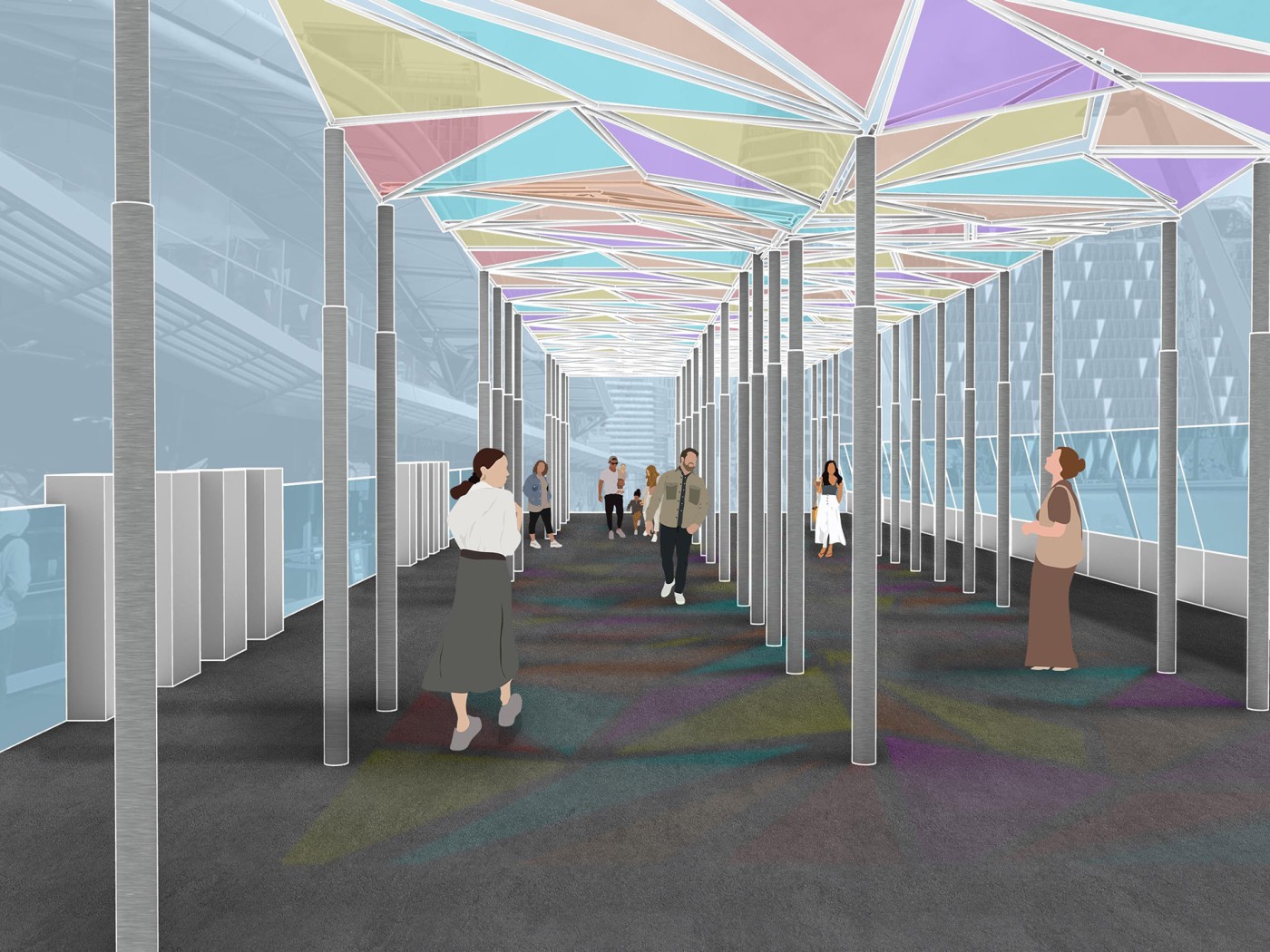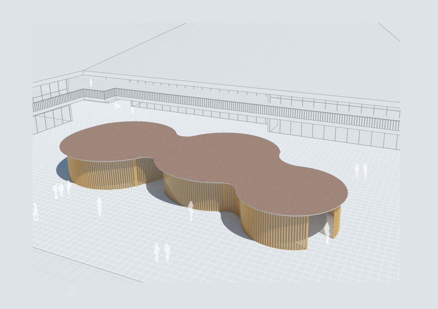 This project has aimed to design a sensorial system that links to a solution for waiting in the large forecourt between the Royal Exhibition Building and Melbourne Museum. Although the design process is developing with the storyline of Victorian people combatting the virus and getting vaccinated, it is a permanent visual and aural intervention into the site. Experimenting with, and responding to different types of waiting, this Major Project integrates into different places, scales, times, adaptations, and uses with two main elements: a sonic installation with sensors and speakers, and framing devices which make people encounter new experiences within the site.