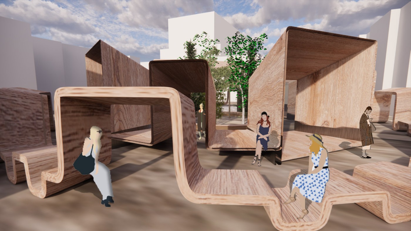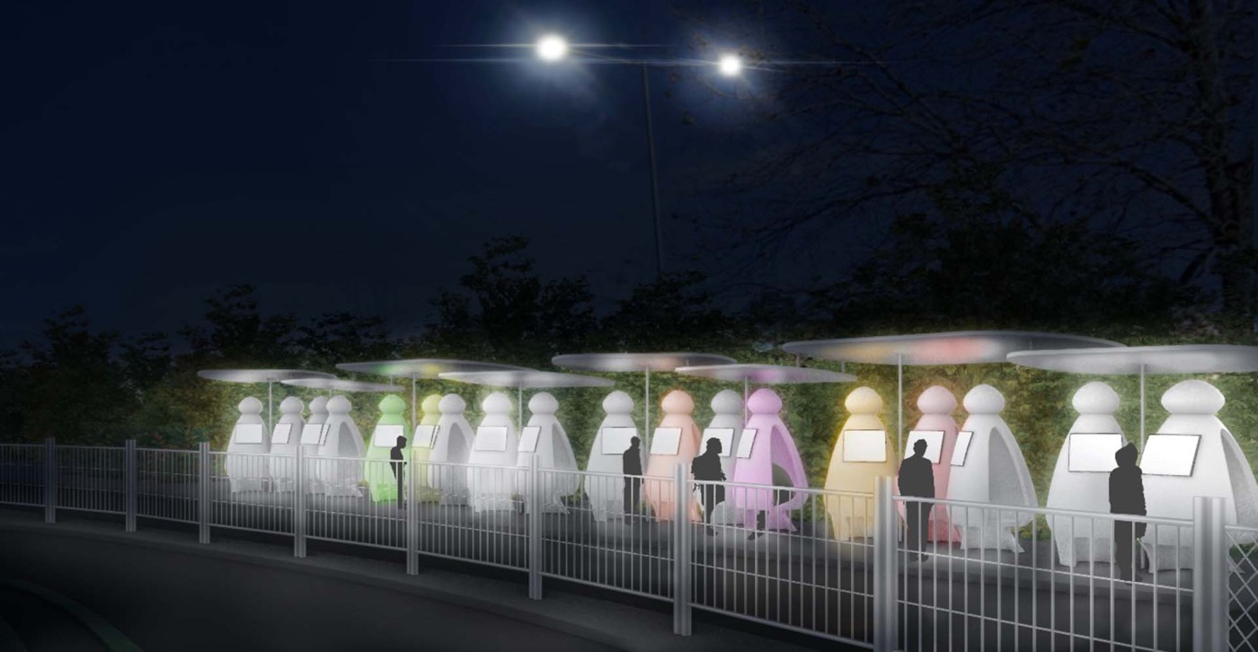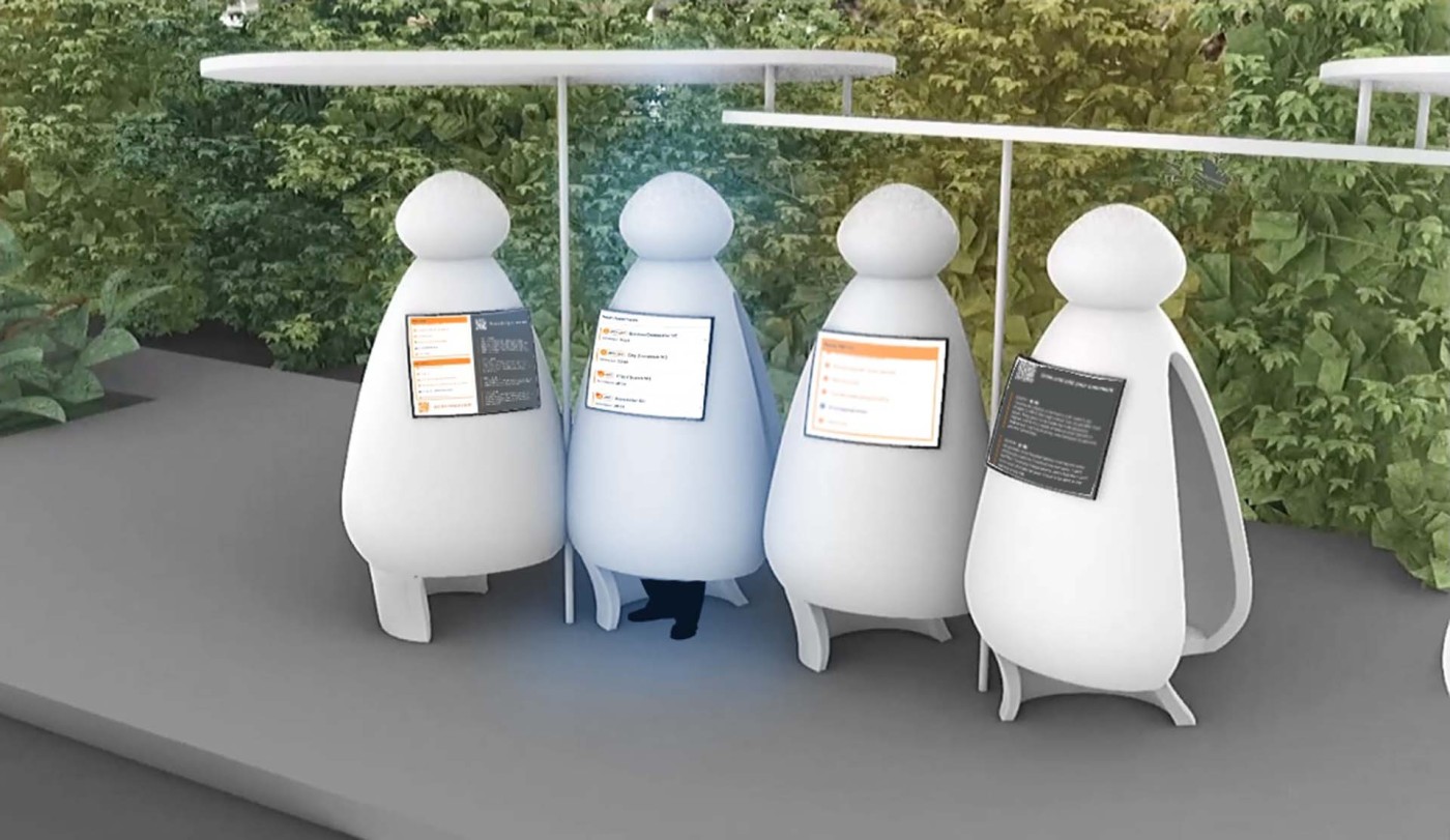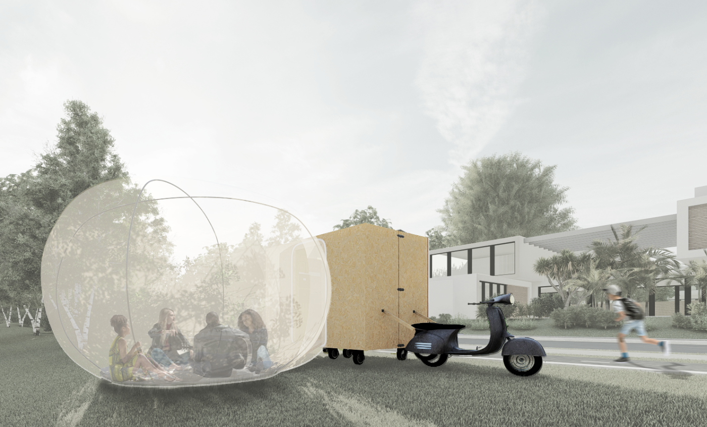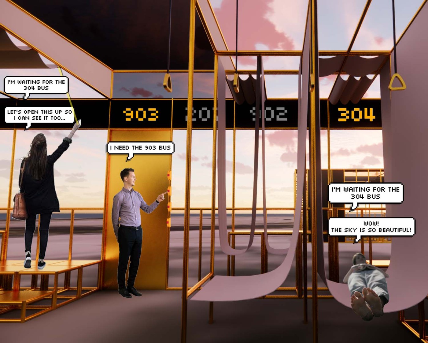 This project aims to create a semi-private communication space in the public domain. The site is in the Doncaster bus interchange, a transitional space between the domestic and public realms. It is a transfer station when we leave home or back home, which also is a space that can affect our emotions. The design stems from visualisation experiments conducted to outline the personal space of individuals. Through these processes, a body bubble was identified, a comfortable distance between people. This research aims to materialise this personal bubble space as a bus shelter to provide socially distanced comfort to individuals and the opportunity to engage in dialogue with others through digital message boards. These bubbles are connected through an app interface. Message boards allow real-time or delayed dialogue where conversations begin as participants share experiences, give advice, listen, and connect.