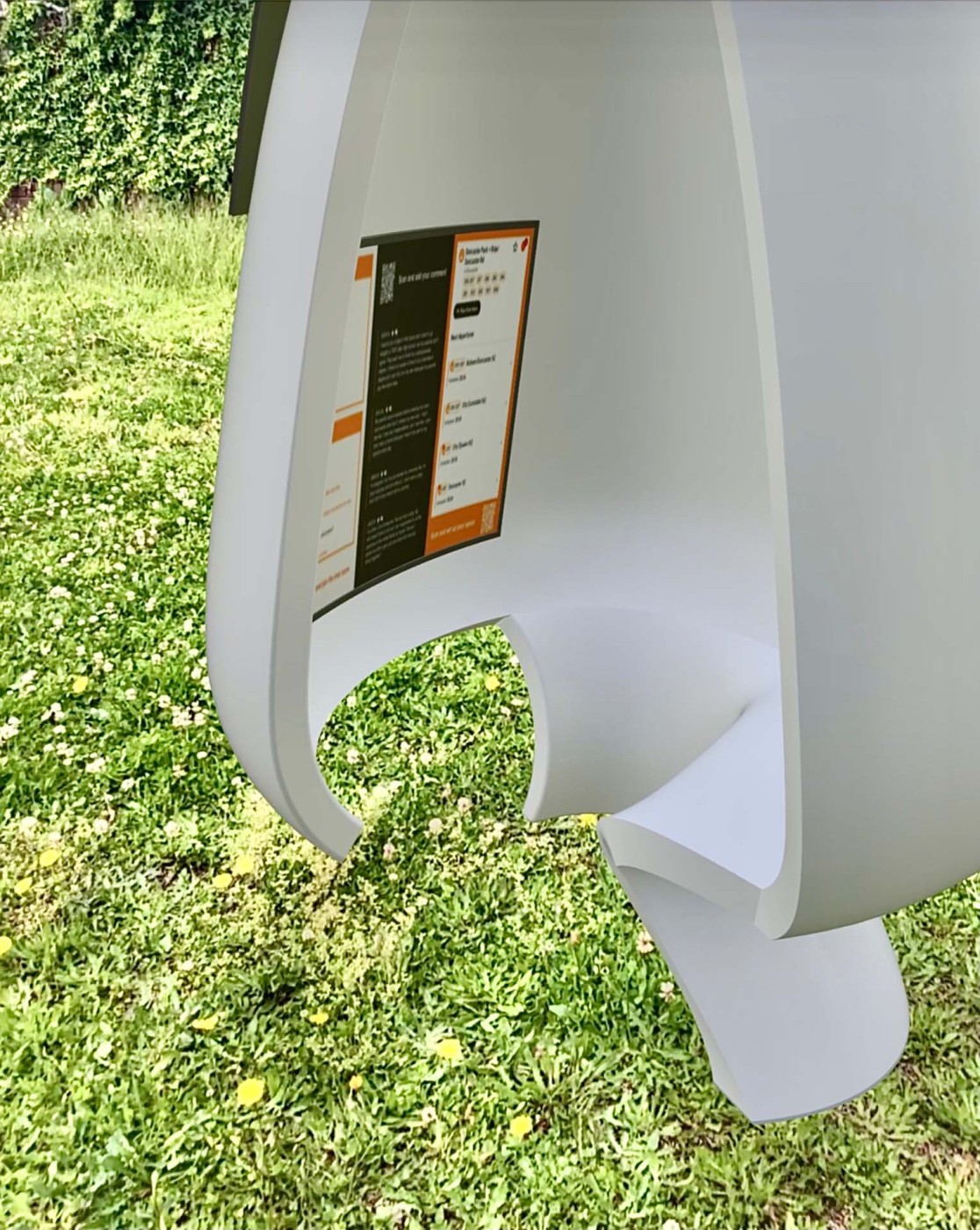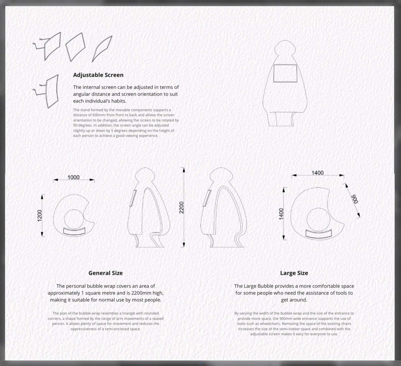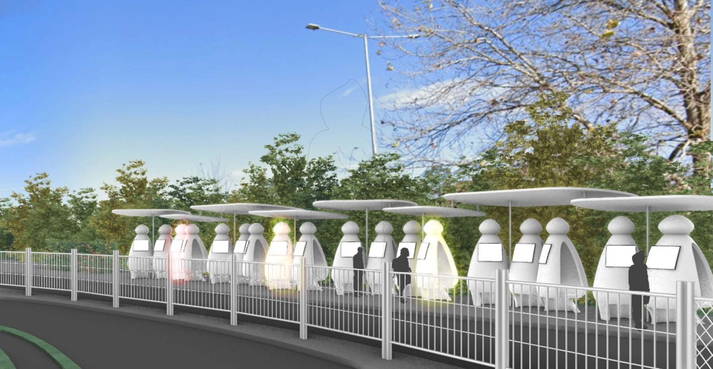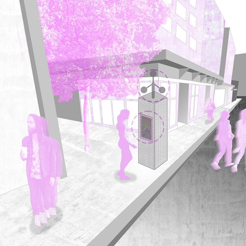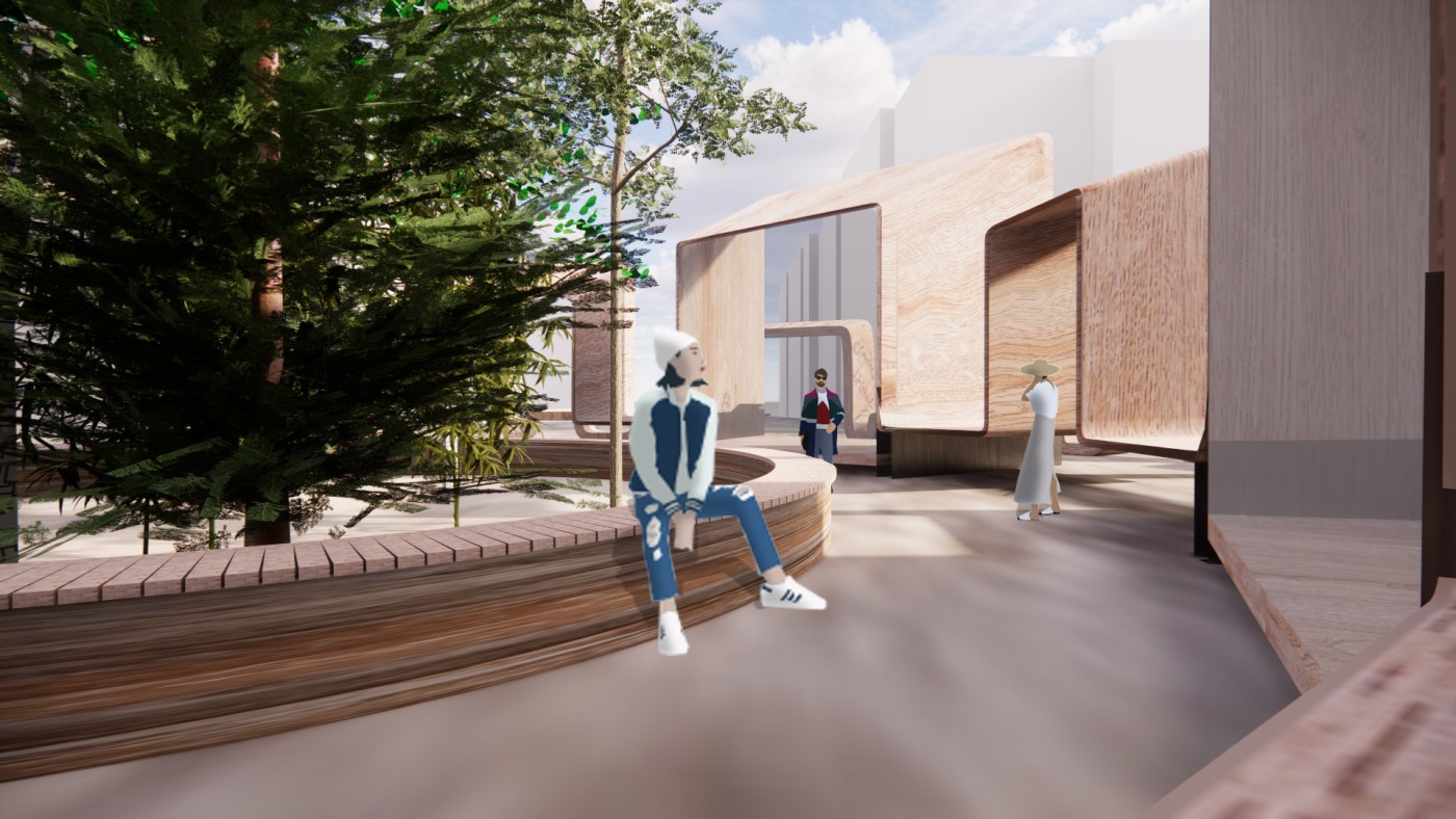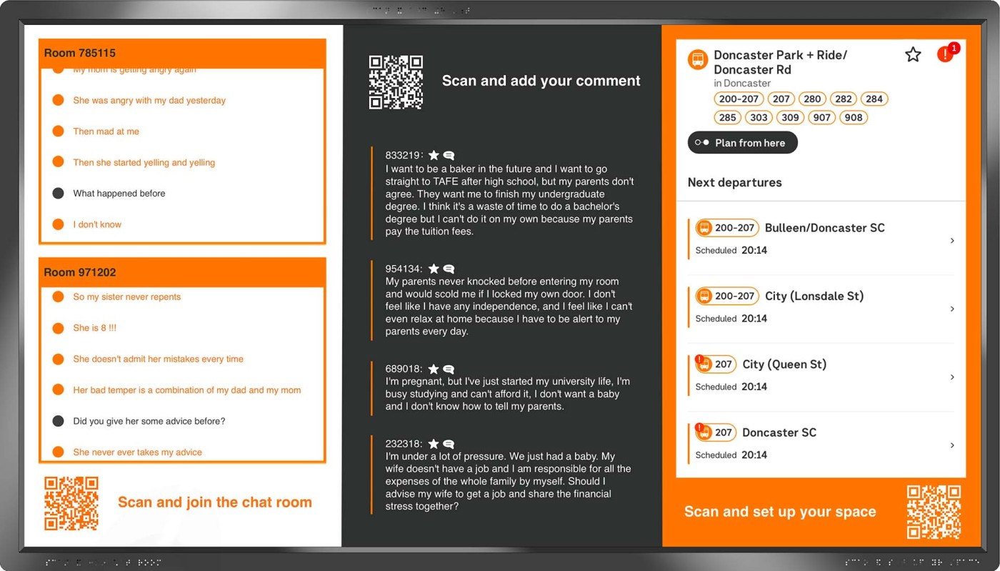 This project aims to create a semi-private communication space in the public domain. The site is in the Doncaster bus interchange, a transitional space between the domestic and public realms. It is a transfer station when we leave home or back home, which also is a space that can affect our emotions. The design stems from visualisation experiments conducted to outline the personal space of individuals. Through these processes, a body bubble was identified, a comfortable distance between people. This research aims to materialise this personal bubble space as a bus shelter to provide socially distanced comfort to individuals and the opportunity to engage in dialogue with others through digital message boards. These bubbles are connected through an app interface. Message boards allow real-time or delayed dialogue where conversations begin as participants share experiences, give advice, listen, and connect.