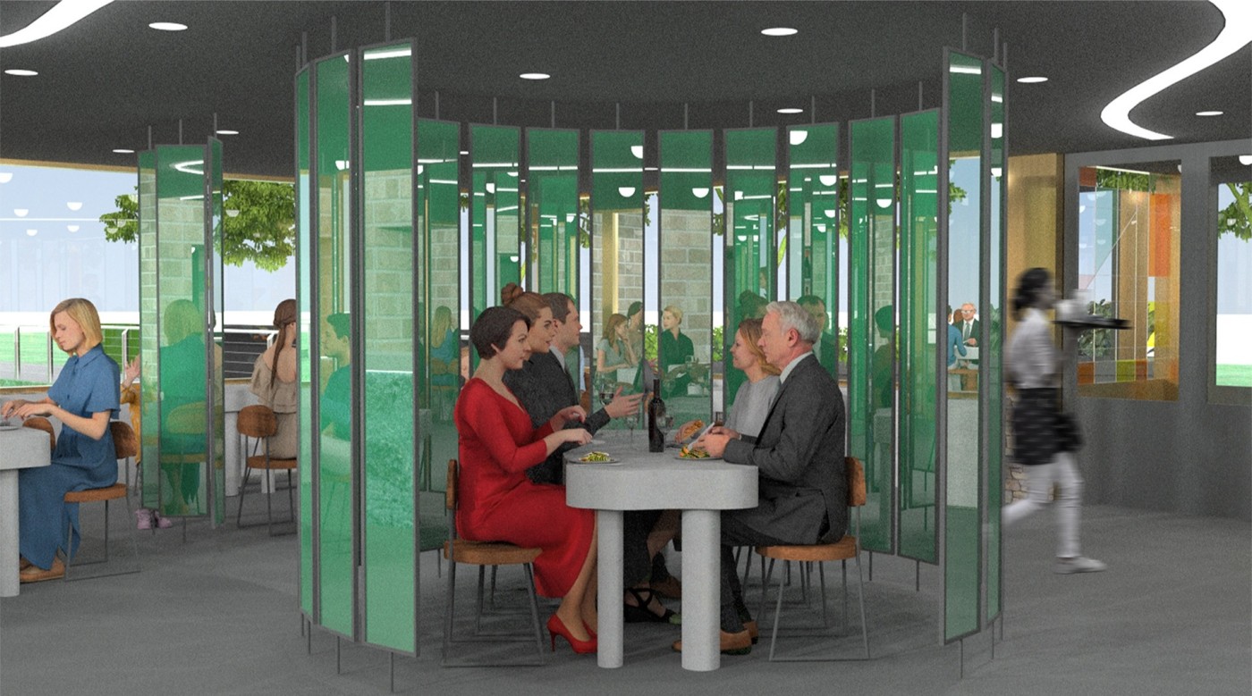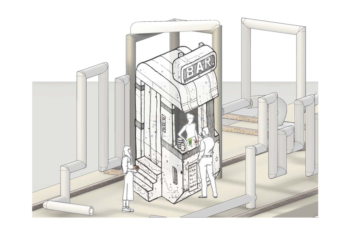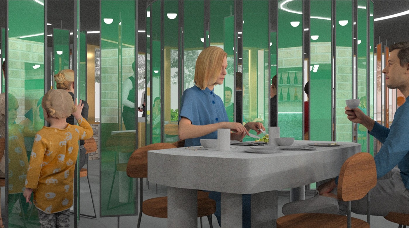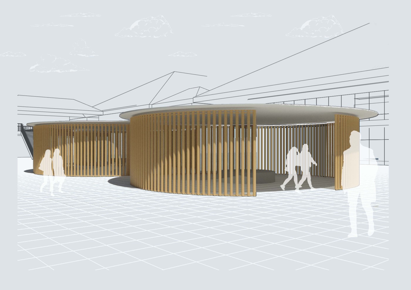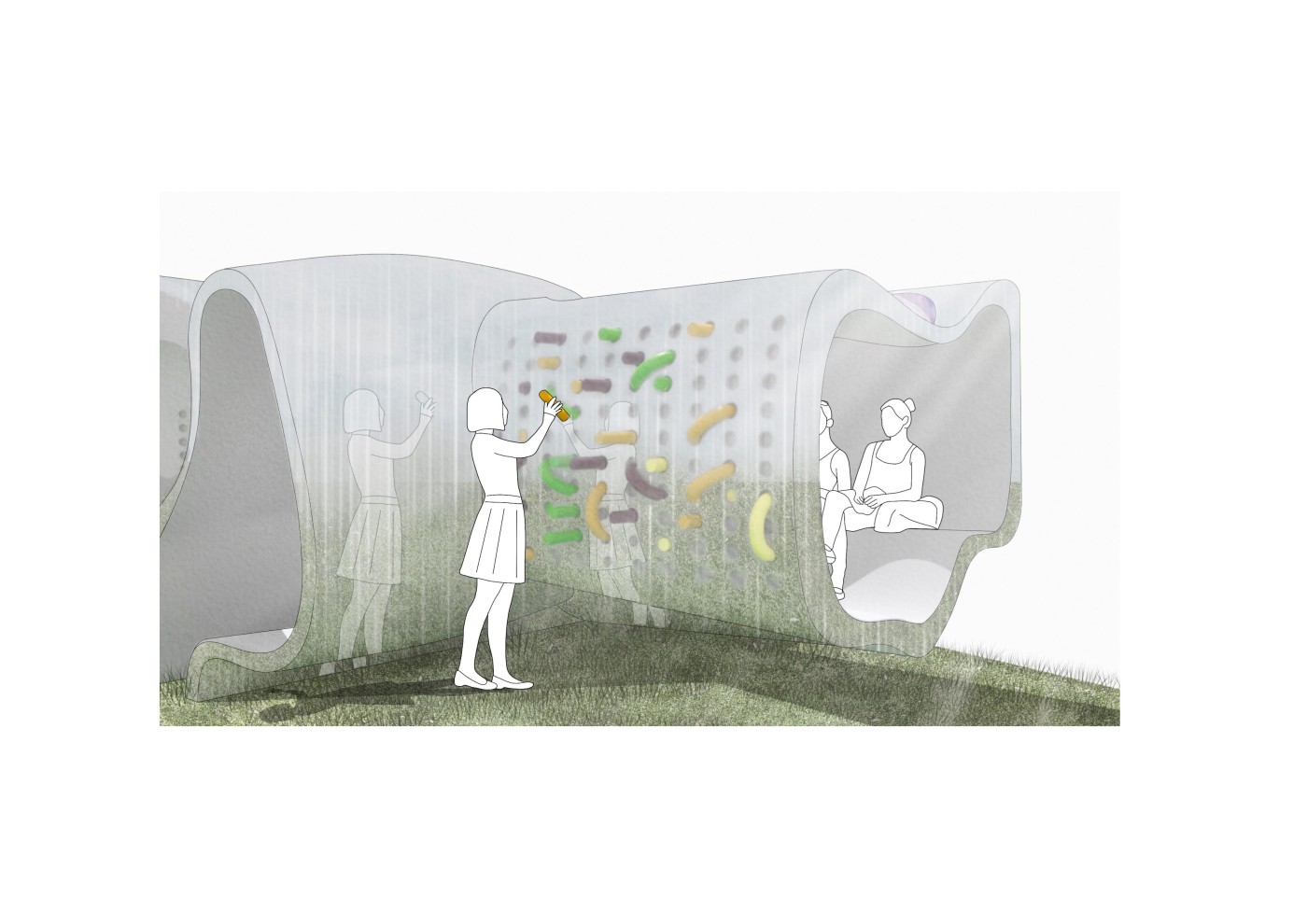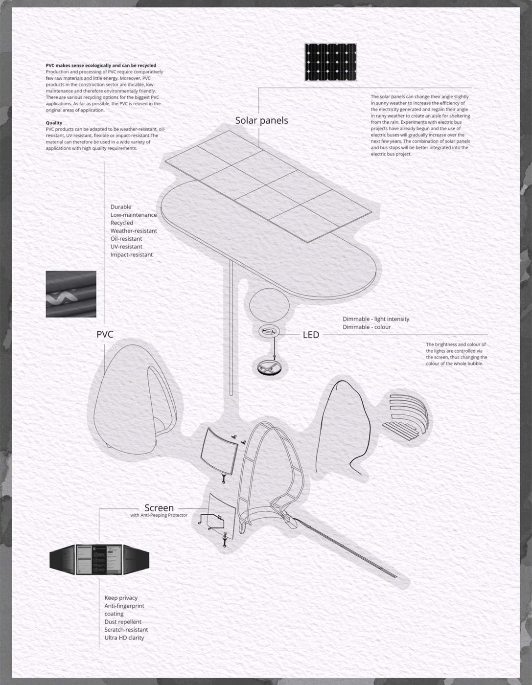 This project aims to create a semi-private communication space in the public domain. The site is in the Doncaster bus interchange, a transitional space between the domestic and public realms. It is a transfer station when we leave home or back home, which also is a space that can affect our emotions. The design stems from visualisation experiments conducted to outline the personal space of individuals. Through these processes, a body bubble was identified, a comfortable distance between people. This research aims to materialise this personal bubble space as a bus shelter to provide socially distanced comfort to individuals and the opportunity to engage in dialogue with others through digital message boards. These bubbles are connected through an app interface. Message boards allow real-time or delayed dialogue where conversations begin as participants share experiences, give advice, listen, and connect.