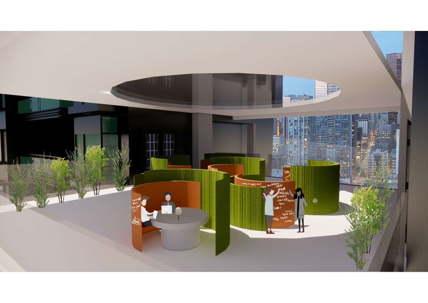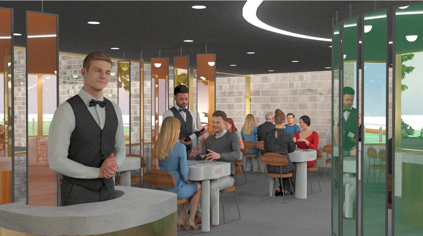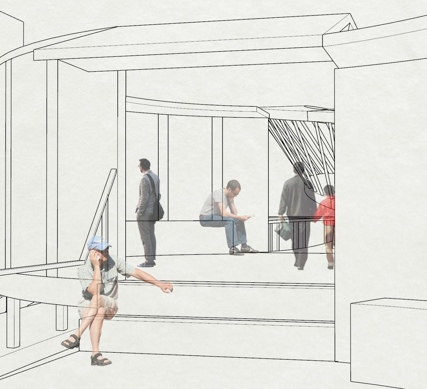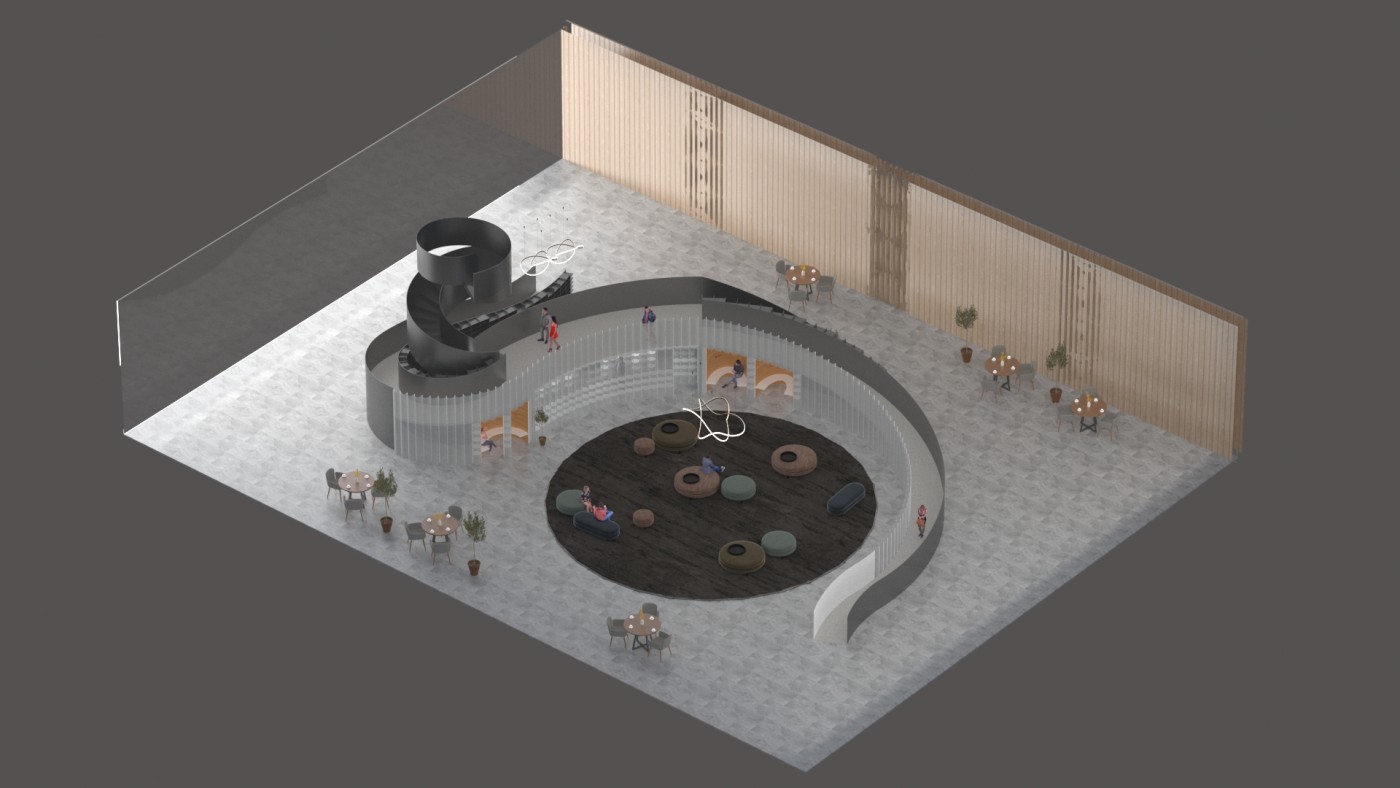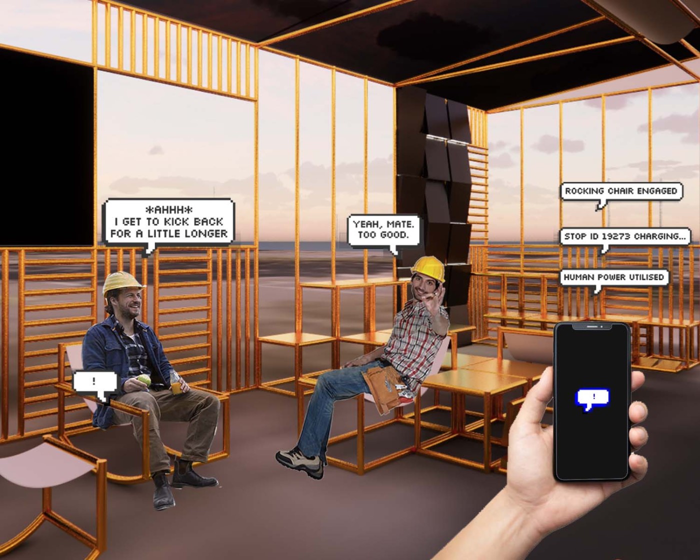 This project aims to create a semi-private communication space in the public domain. The site is in the Doncaster bus interchange, a transitional space between the domestic and public realms. It is a transfer station when we leave home or back home, which also is a space that can affect our emotions. The design stems from visualisation experiments conducted to outline the personal space of individuals. Through these processes, a body bubble was identified, a comfortable distance between people. This research aims to materialise this personal bubble space as a bus shelter to provide socially distanced comfort to individuals and the opportunity to engage in dialogue with others through digital message boards. These bubbles are connected through an app interface. Message boards allow real-time or delayed dialogue where conversations begin as participants share experiences, give advice, listen, and connect.