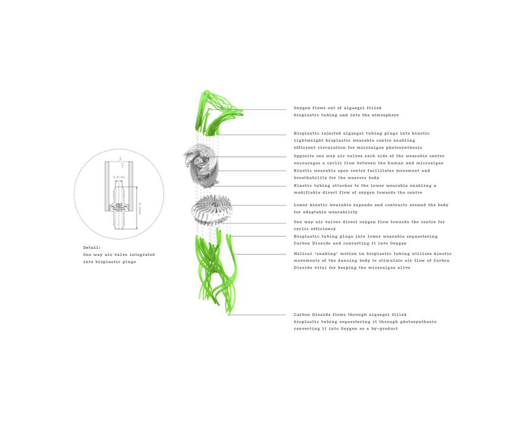 In the current technological era of the 21st century, where anthropogenic climate catastrophes are being fuelled at accelerating rates due to destructive industrial productions and processes within the urbansphere, it is time to reconsider a new mode of reasoning that extends beyond the human centre. Blurring the traditional binaries of interior/exterior, human/non-human, digital/physical and natural/synthetic, becoming [metabolic] responds to the increasing uninhabitability of the biome. Influencing these conditions are anthropogenic atmospheric CO2 emissions, particularly within the energy use and heating sector. Synthetic biological processes of today's world reflect a shift out of the binaries of the past. Underlining this research is an enquiry into the capacity of humans to embody this hybridisation by adapting their bodies to the conditions of the environment drawing upon metabolic processes of the biome. The project speculates upon new ways for the everyday active body to inhabit spaces within the urbansphere. Drawing upon the symbiotic mutually beneficial relationships of photosynthetic eukaryotes of microalgae, the research aims to facilitate new inter-relationships between humans and non-humans. Through hybridising the ancient technology of photosynthesis in microalgae with contemporary techniques of algorithmic modelling, a new speculative inter-sphere was developed in the form of a living wearable. The wearable adaptation offers a new inter-sphere of urbanisation where co-inhabitation and revitalisation becomes the future.