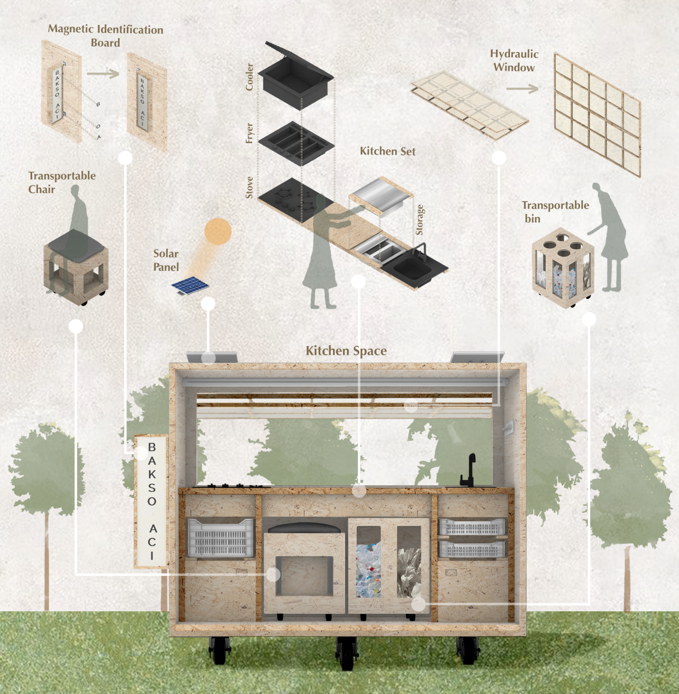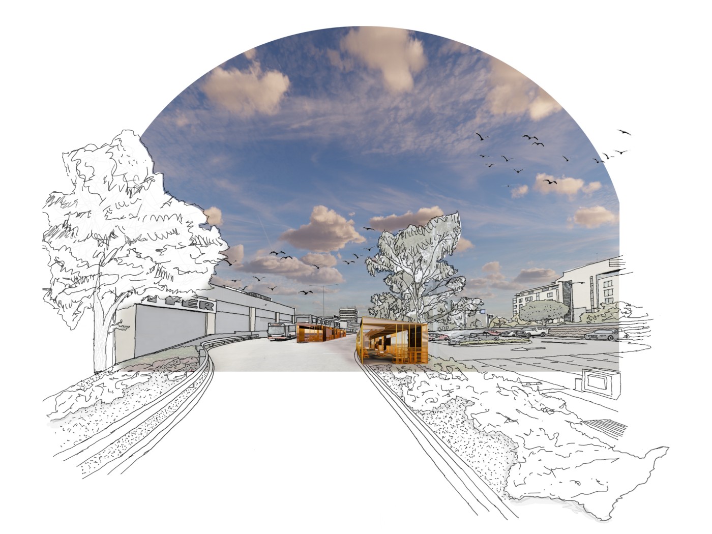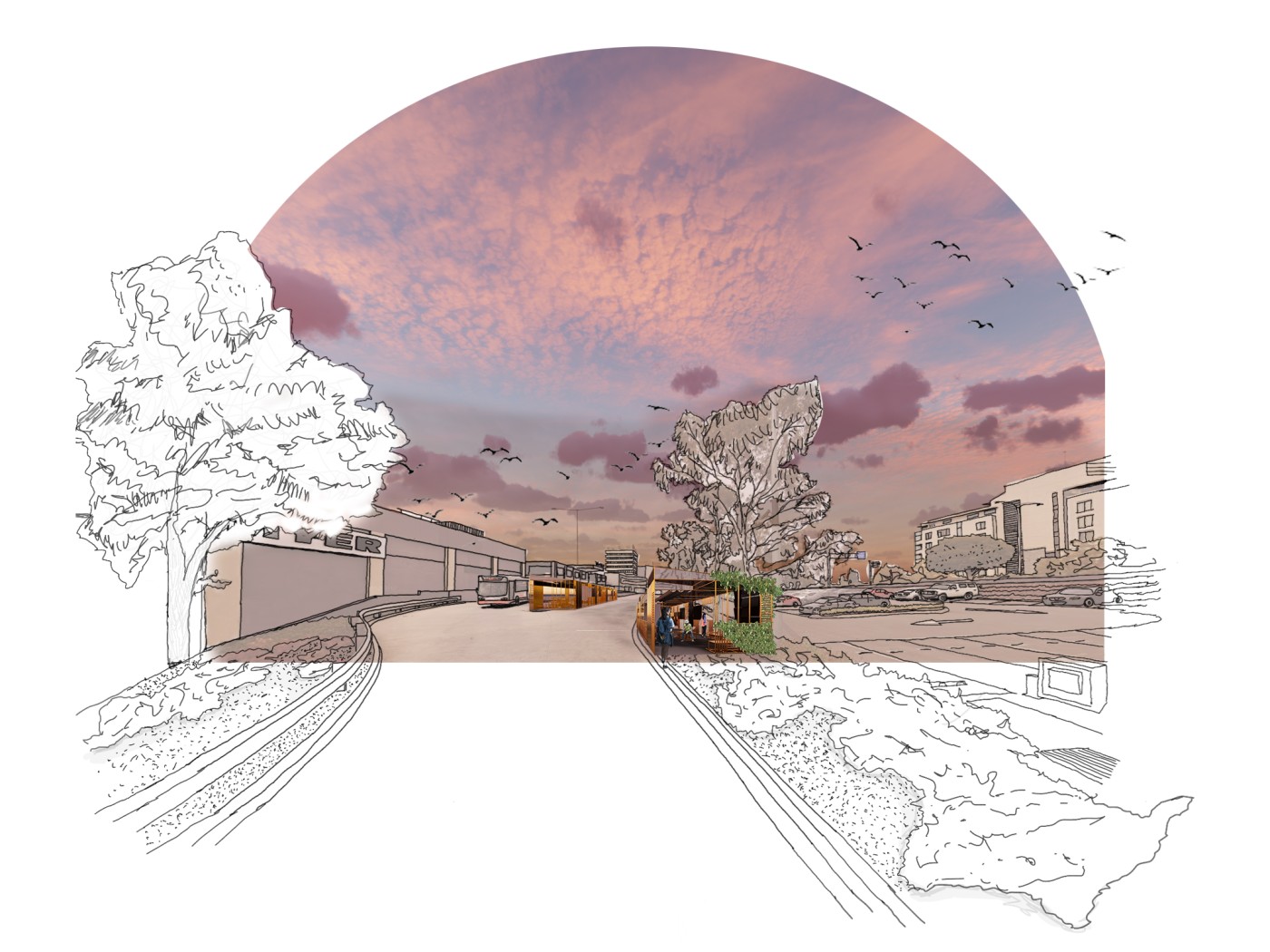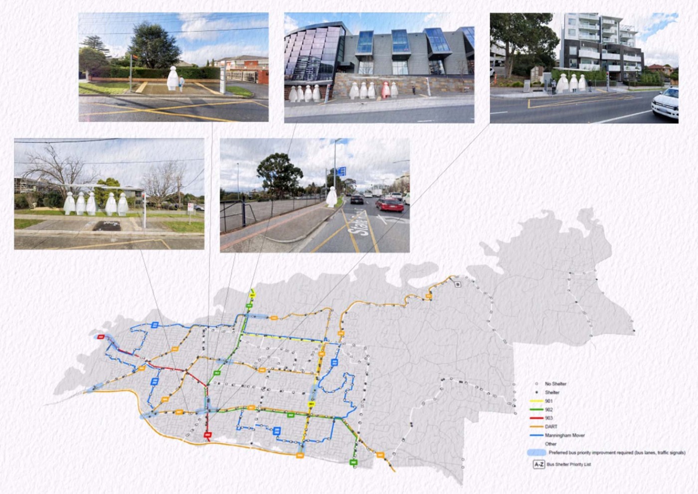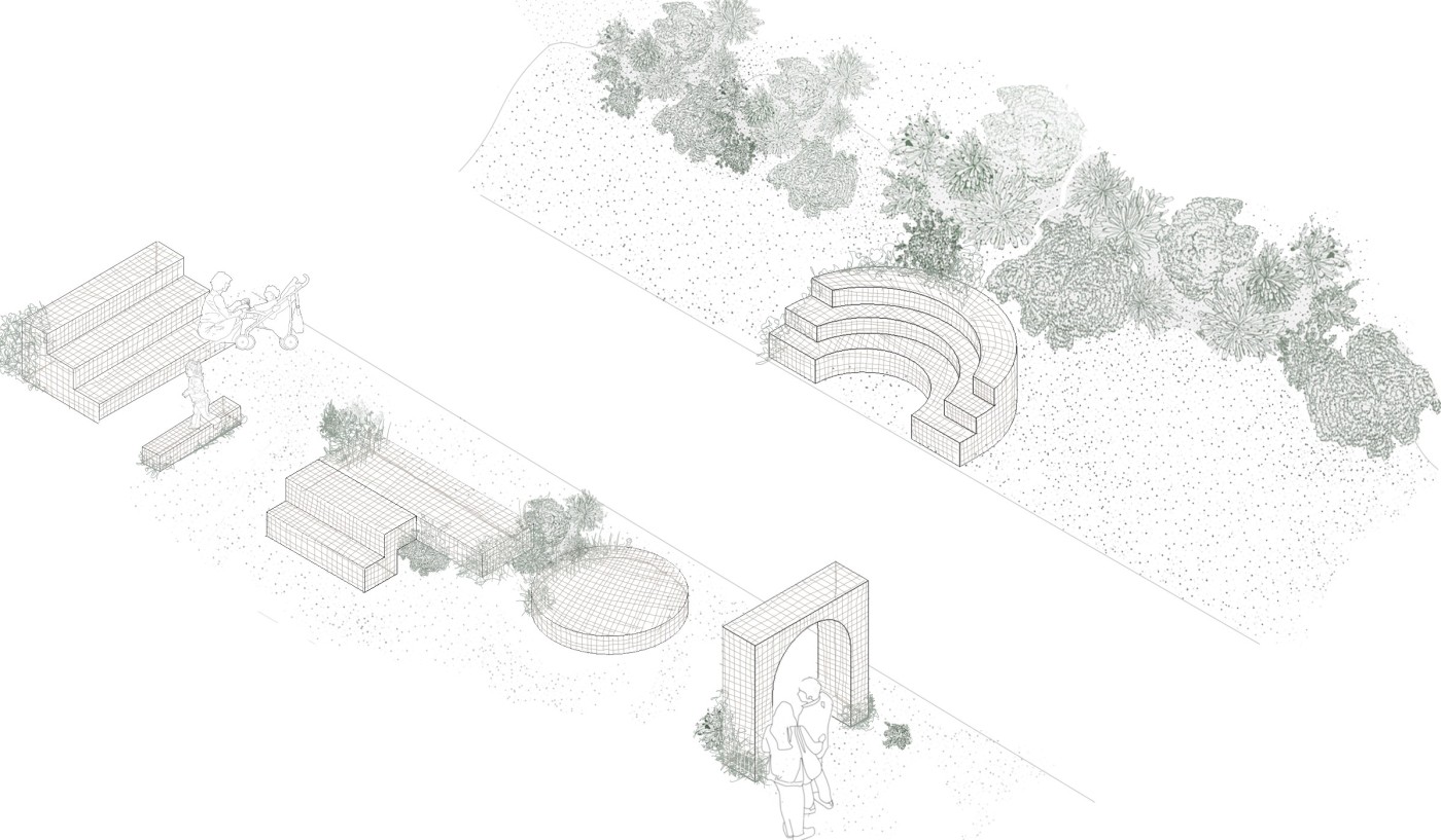 COVID-19 has given us a newfound awareness of each other and the layered everchanging living system that is the world we share. The uncertainty of the pandemic forced us to become adaptable, responsive, and constantly aware of change. This placed us in an unsettling, in-between state. As human nature reaches for a status quo and normality, there is value in spending time in the in-between to reflect. Within this unique context, 'WE: W[o/a]nderous Elements' sees potential in the public transport network and its significant interchanges as sites that epitomise transition and exchange. It questions how their design may positively influence our sense of belonging and wellbeing throughout our life's various transitions. The project learns from the pandemic and looks forward to a new future. It recognises the benefit of the 5km radial lockdown strategy on our awareness and connection with our local communities. This strategy is adopted as a tool for community engagement within, across and between four chosen sites and their adjoining 5km radii, along a suburban bus loop bypassing the city. A kit-of-parts, composed of an armature reflective of the bus interior and infrastructural language, is designed with fitted sub-parts, responsive to specific local needs, uses and characteristics of their sites. As indicated by the title, the polycentric approach of the project acknowledges the value of a collective 'we' whilst embracing the wonder of individuality and also serves the community whilst specifically targeting public transport users by aiding their commute and transitions. It is a place to meet, wait, reconnect, reflect, play, and spend time. The distributed structures grow over time in response to their environmental setting and community connections, creating an everchanging dialogue. This project is an exploratory framework for designing future dynamic, adaptable, and connected public places throughout our living systems.