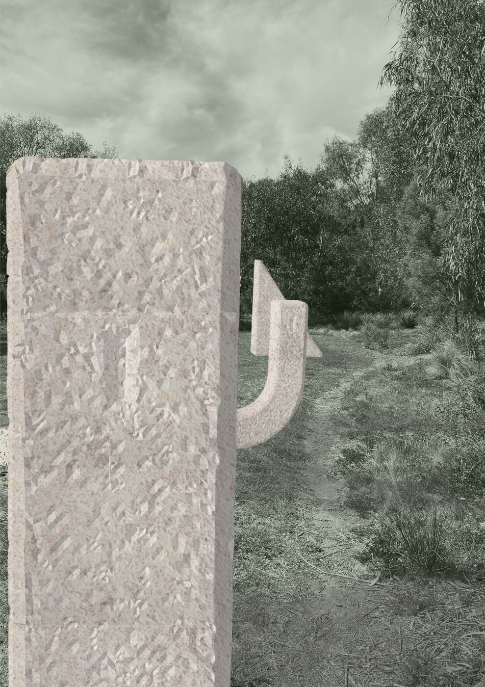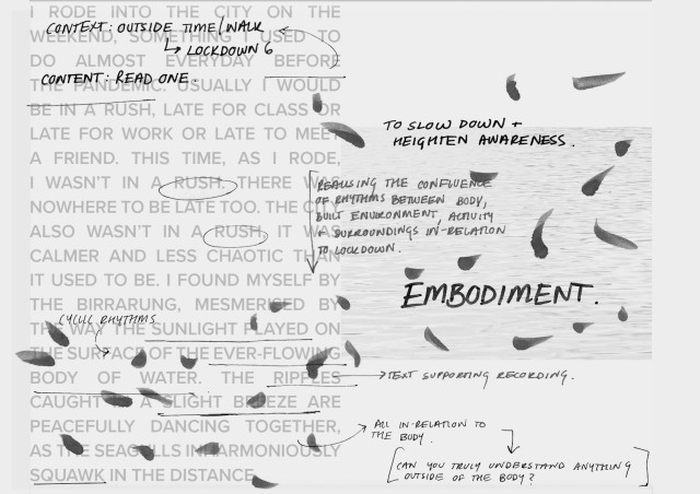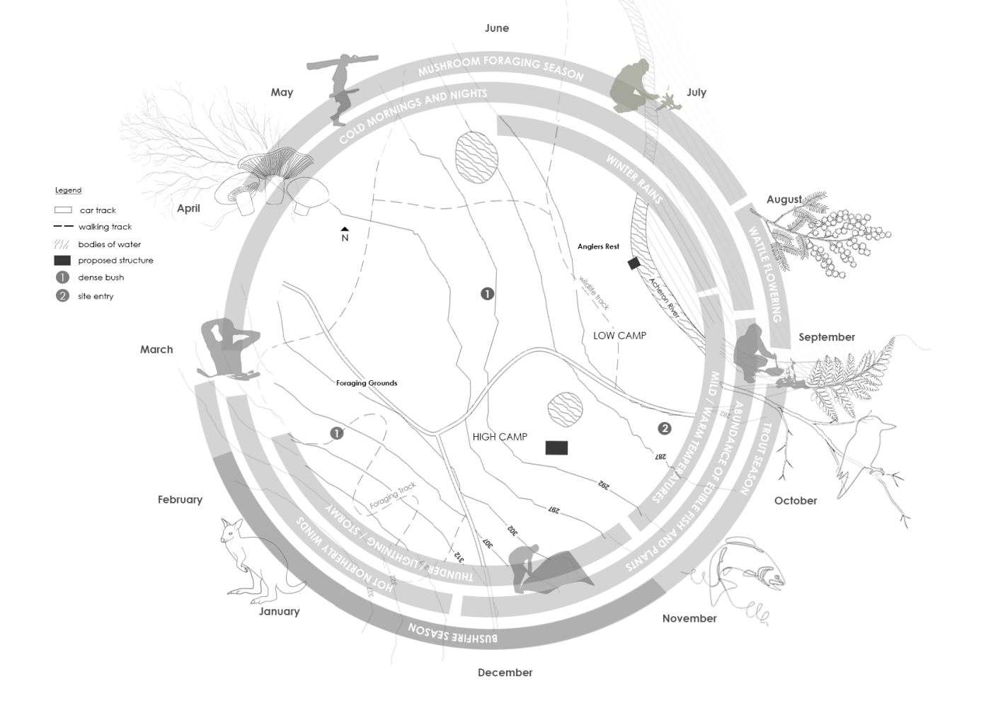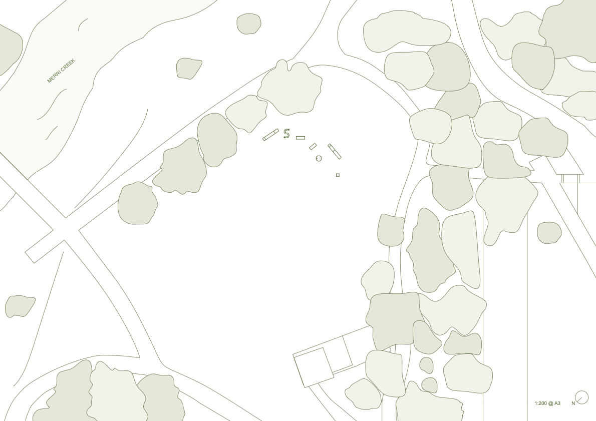 Summarising my project into four systems; rhythm, regeneration, boundary and reconnection, I have designed a durational walkway that encourages the land to heal through human engagement. Although my chosen site is highly ecological sensitive and prone to flooding and bushfires, I have anchored my project around the interwoven blend of boundaries and conflicting rhythms from humans and nature.