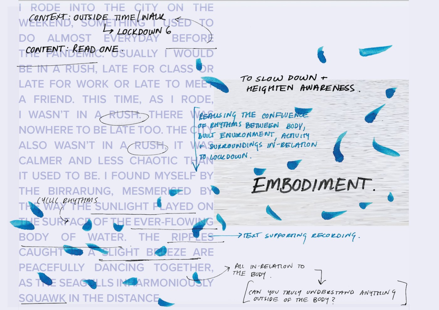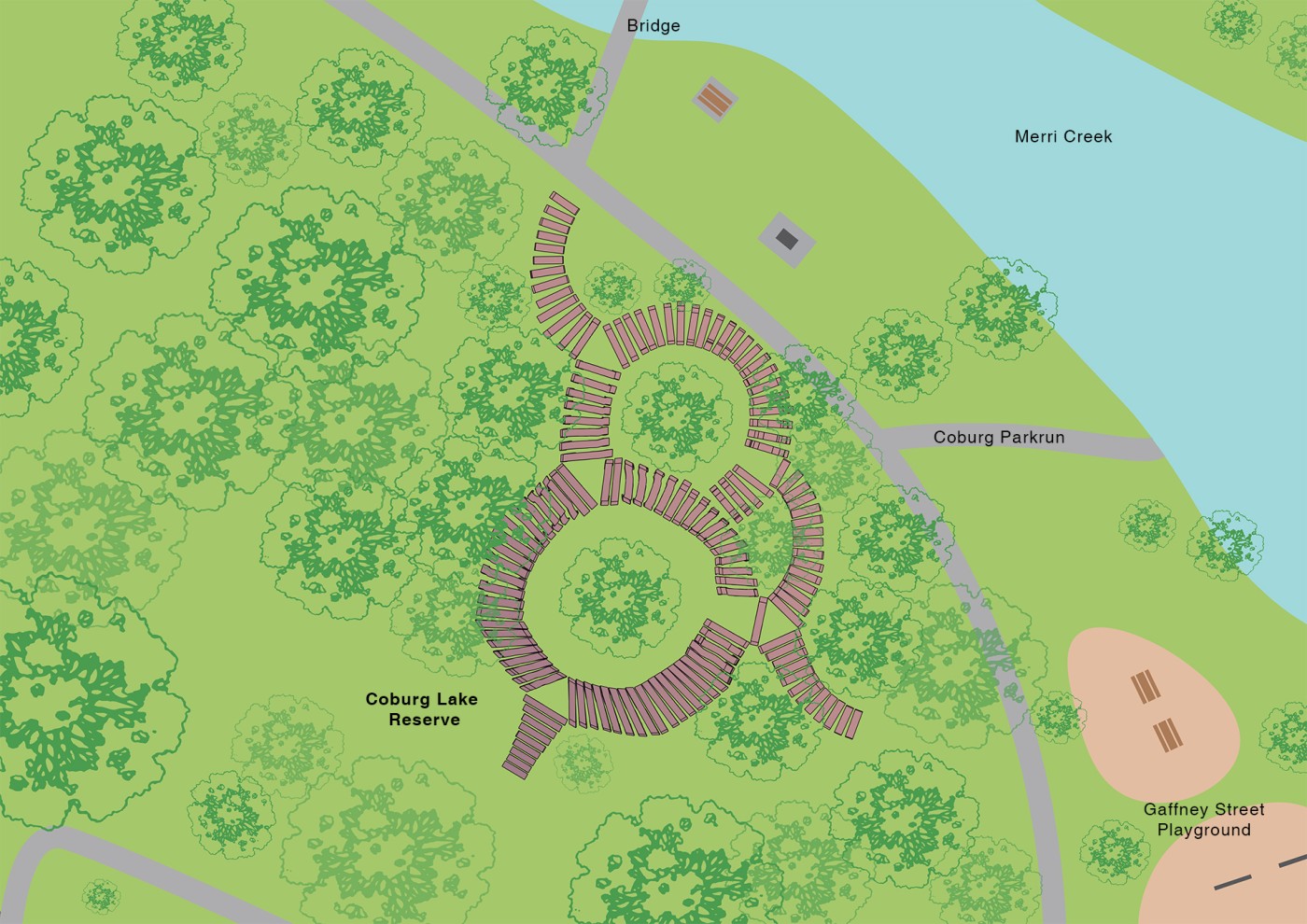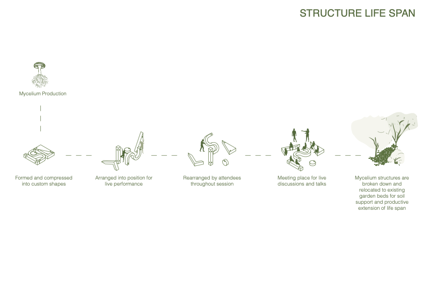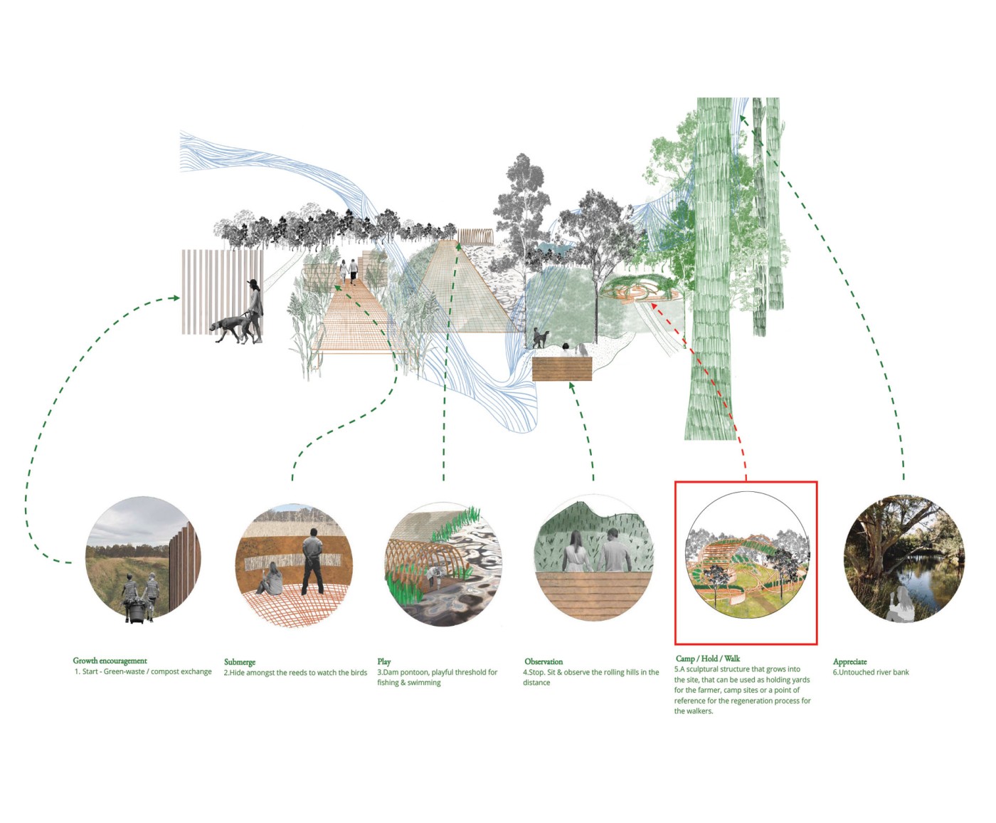 Summarising my project into four systems; rhythm, regeneration, boundary and reconnection, I have designed a durational walkway that encourages the land to heal through human engagement. Although my chosen site is highly ecological sensitive and prone to flooding and bushfires, I have anchored my project around the interwoven blend of boundaries and conflicting rhythms from humans and nature.