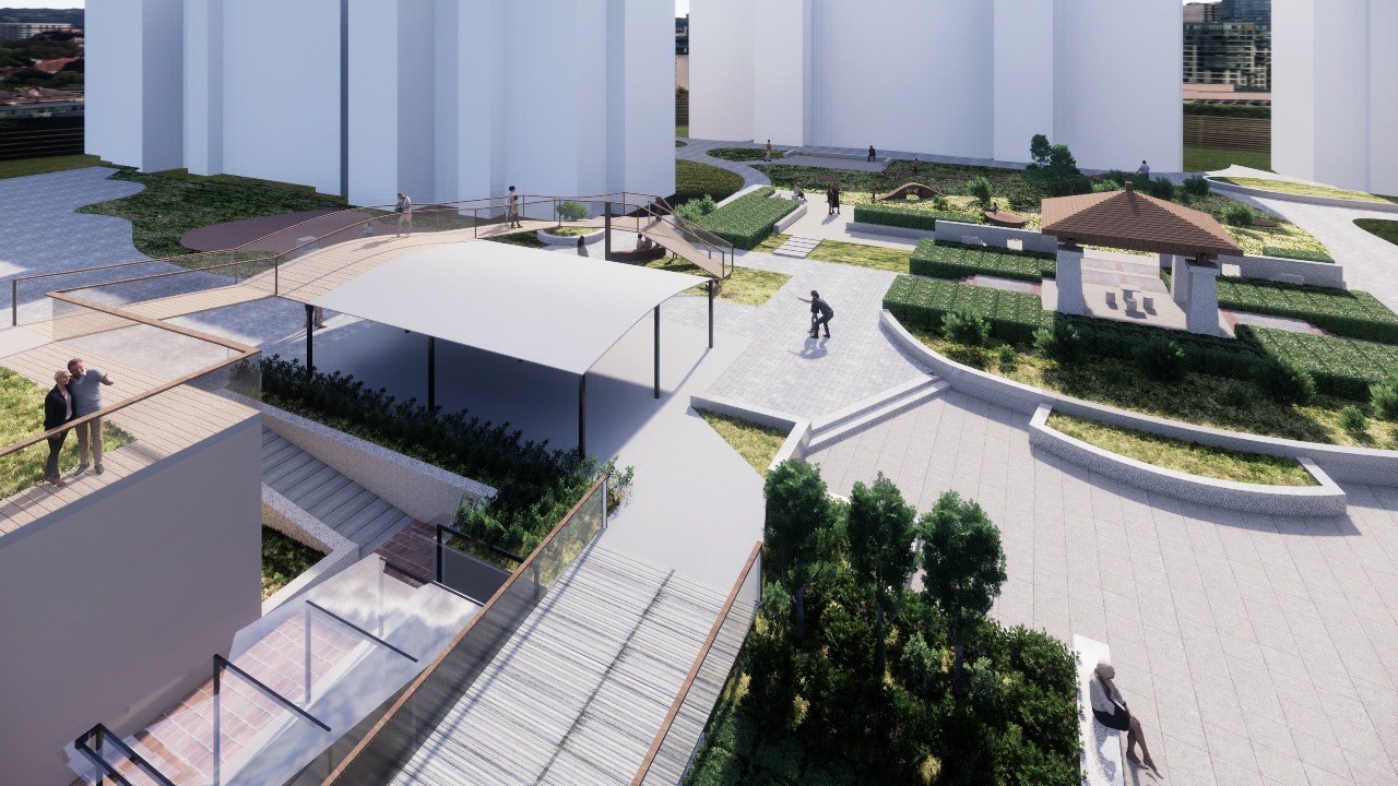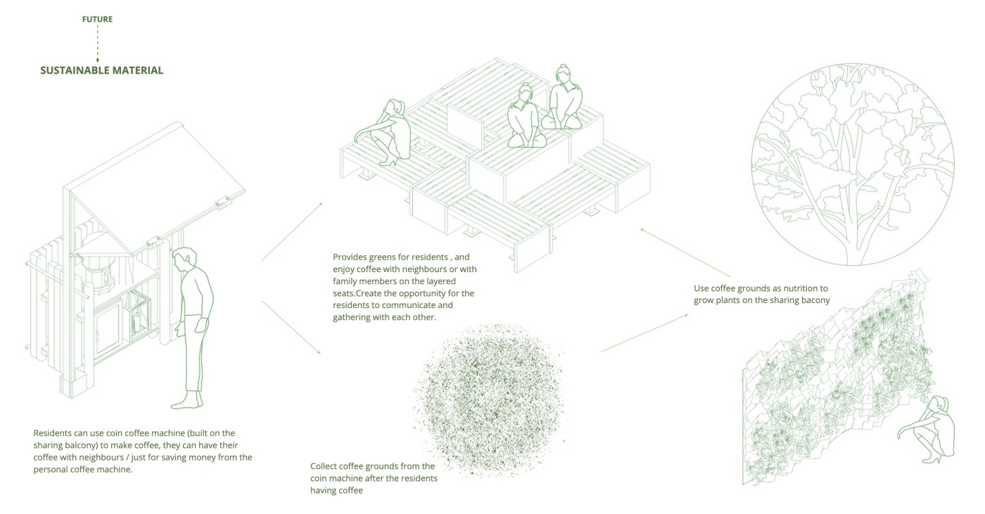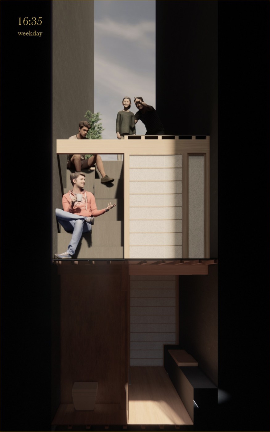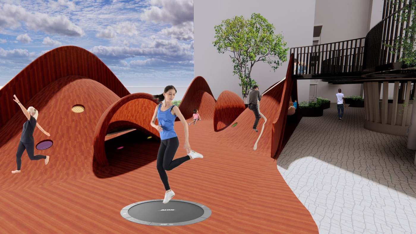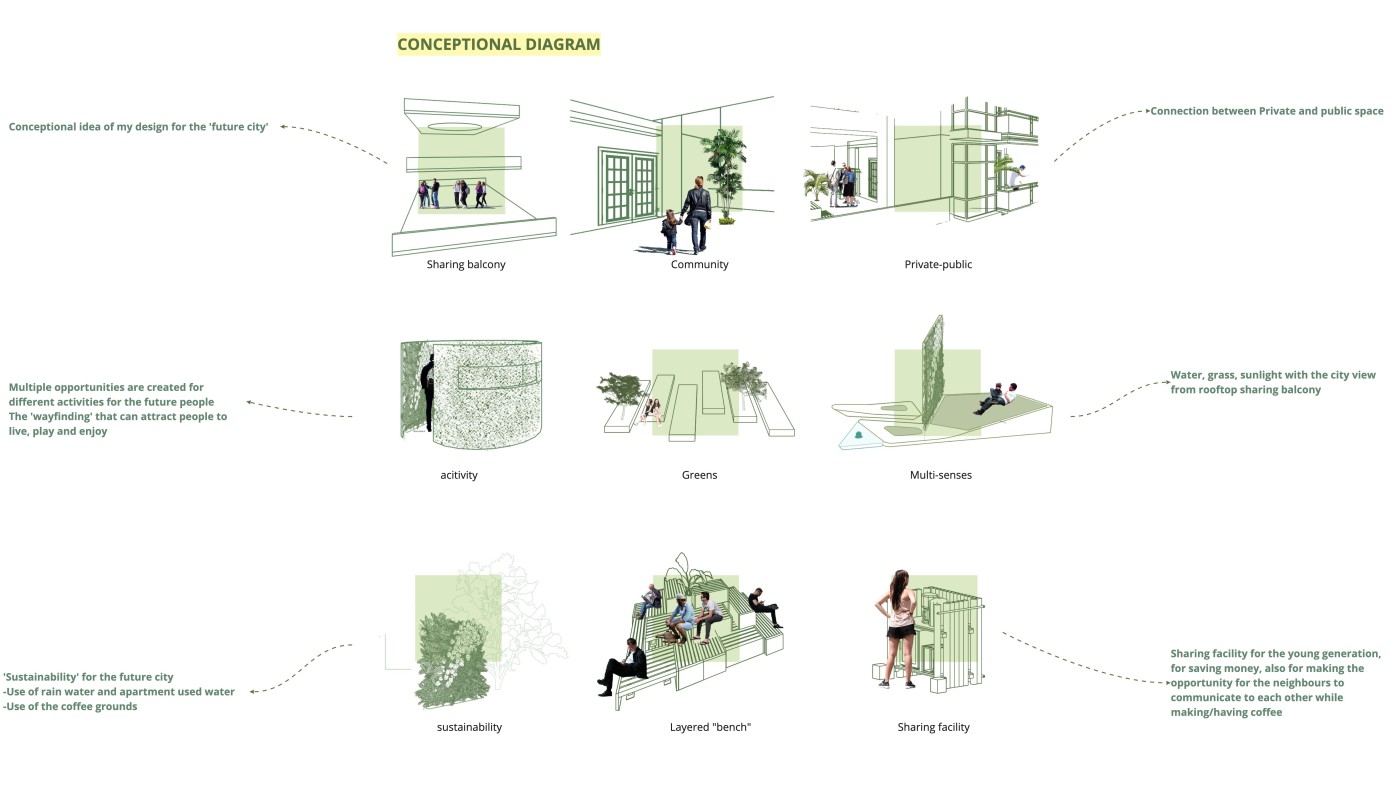 The focus of the Urban 'House' is to create a sense of neighborhood living community on (beside) my apartment. A proposed activation space for the future city is developed by designing common areas that provide a "comfortable home" - environment for residents to live, play and interact.