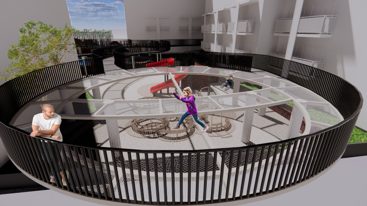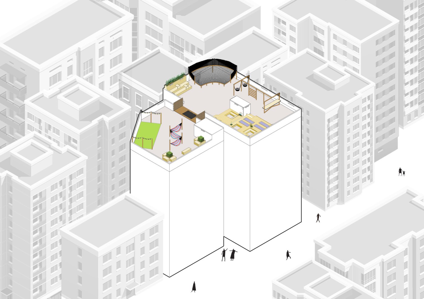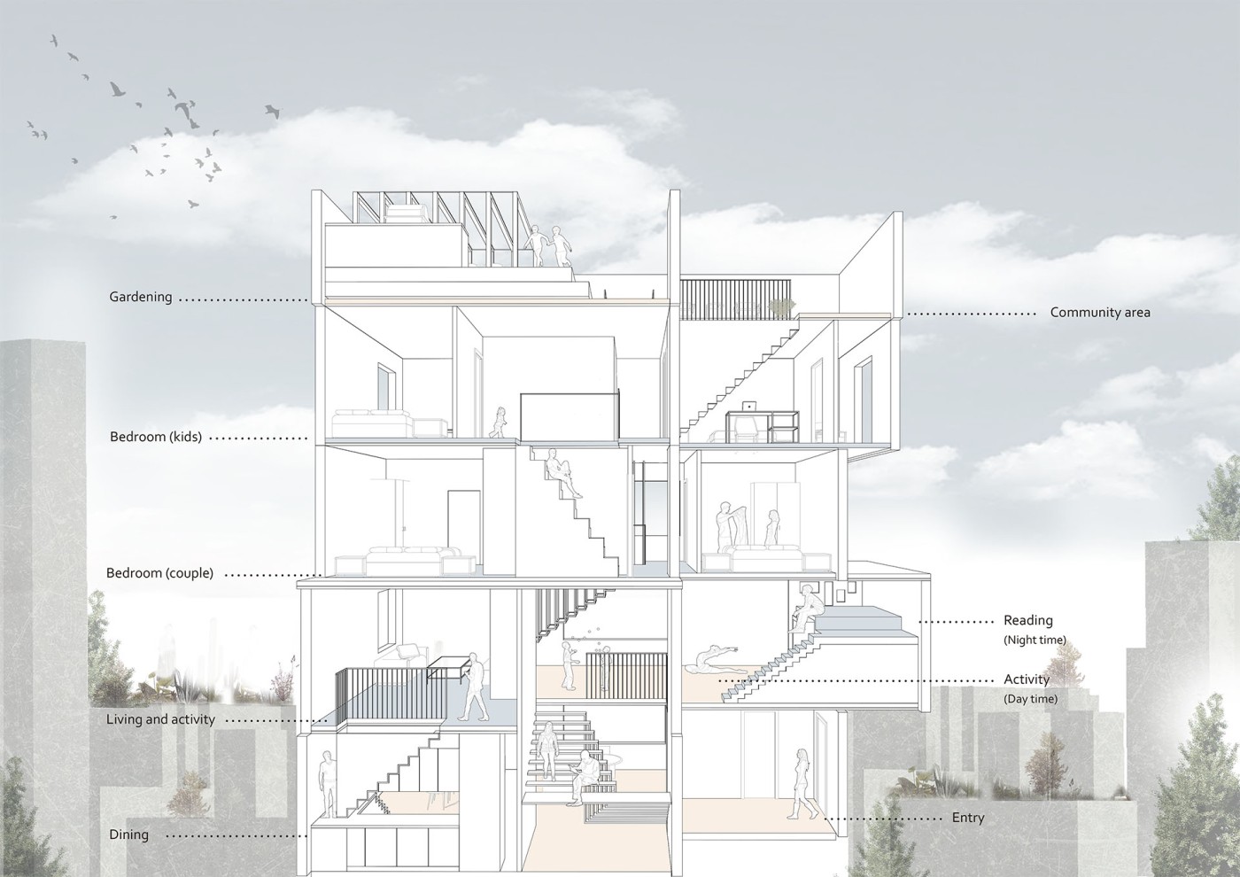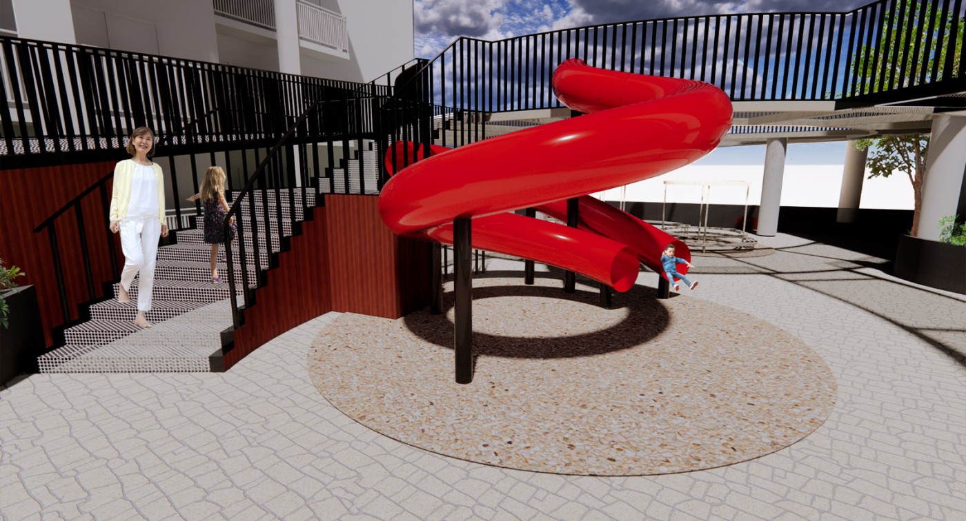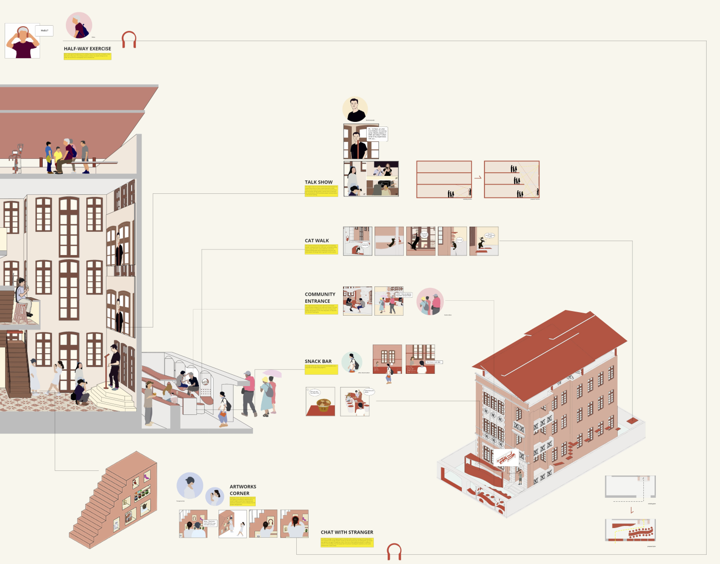 The focus of the Urban 'House' is to create a sense of neighborhood living community on (beside) my apartment. A proposed activation space for the future city is developed by designing common areas that provide a "comfortable home" - environment for residents to live, play and interact.
