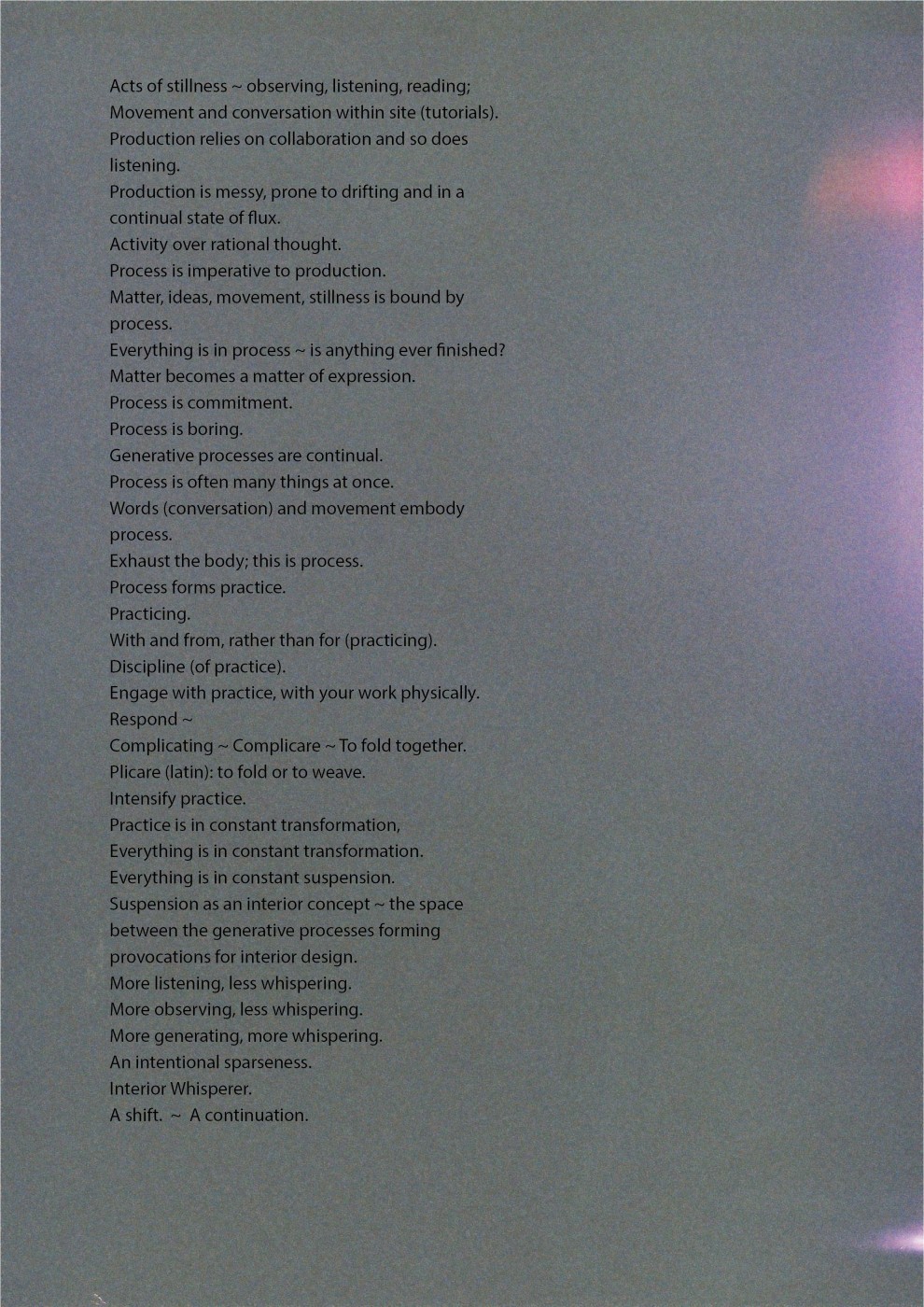 The final year requires students to identify and articulate their own unique motivations and approach to interior design through devising and realising an independent research project. Students work intensively with their tutor and in discussion with peers to shape a research framework informed by a deep interrogation of practice and theoretical precedents and through practice-based methods of investigation. This year long research project undertaken by the students is an enquiry into the dynamic field of interior design and a statement about who they are as emerging designers.