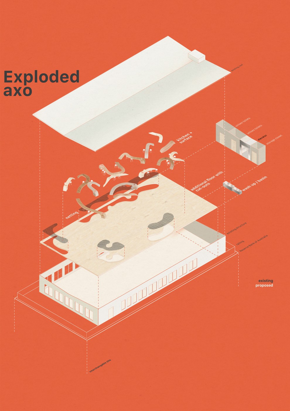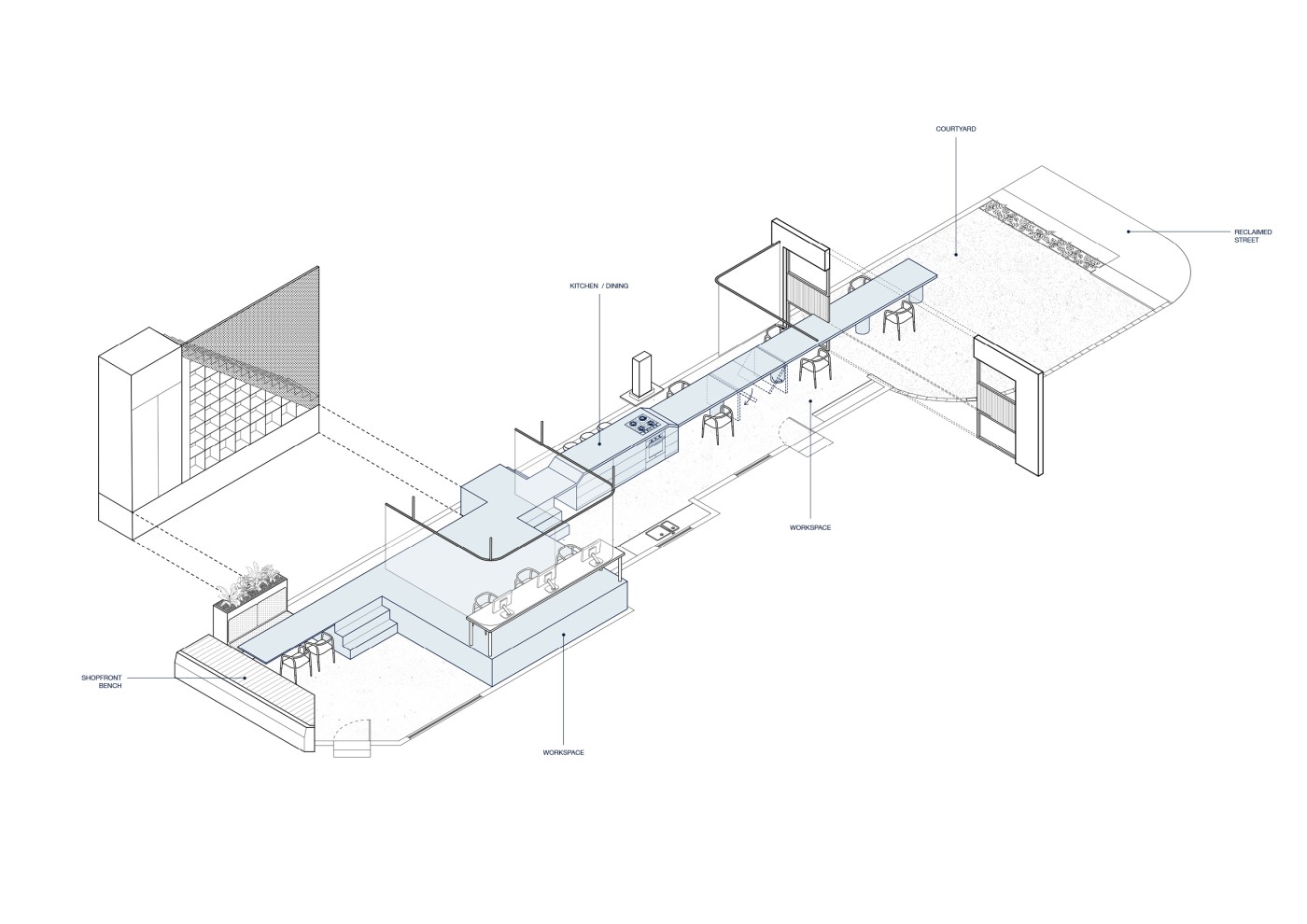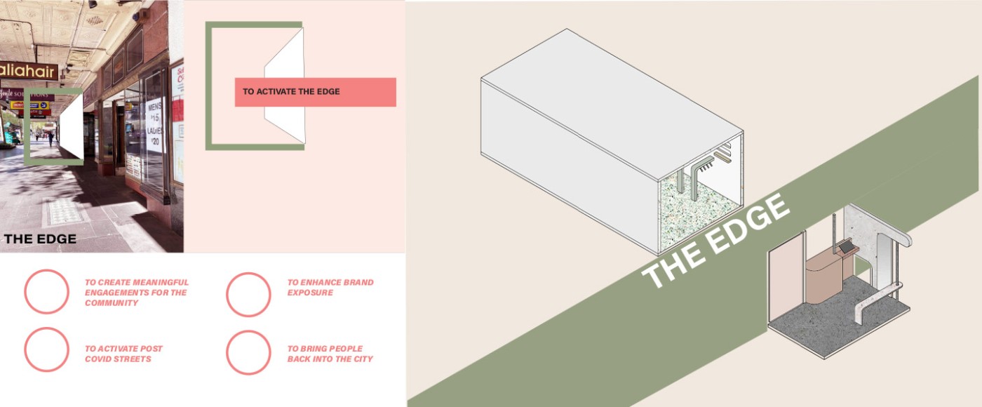 This enquiry unfolds in response to the issue of vacant shopfronts that have emerged since the pandemic by proposing a series of satellite sites for the 2021/22 Mpavilion located beyond Melbourne CBD’s 5km radius. Preservation and transformation of these provisional conditions are tested through various approaches through the assemblage of programmatic concerns, joinery and furniture acting as support structures. Through the distribution of activities and de-centralisation of culture, the project questions how cultural infrastructure can decrease suburban isolation. Foregrounding situations over built form and generating a new becoming of vacancy within their indeterminate in-between.