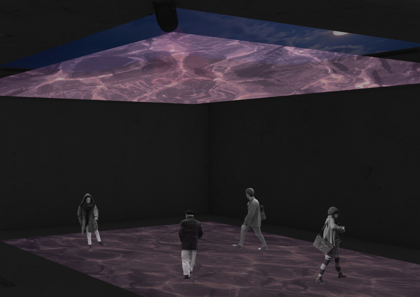 This design uses projection mapping, video, sound and imagery to displace the audience and form contrasts and connections between their physical environments and the surroundings they will experience within the space, encouraging them to visit locations similar to those presented. Projected images become a method of spatial displacement, targeting emotional and sensory attributes of disparate locations. Biophilic Design principles will inform the design of both the space and the movement of the video elements. Predominantly, the design will use concepts of minimalism to allow the ambient qualities to convince the audience that they are somewhere new.
