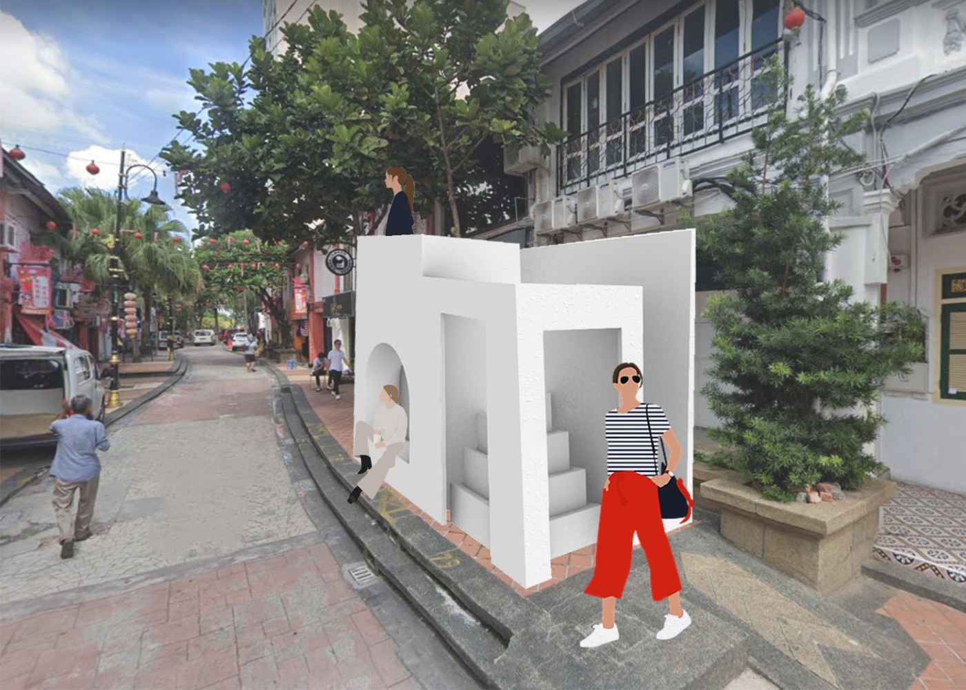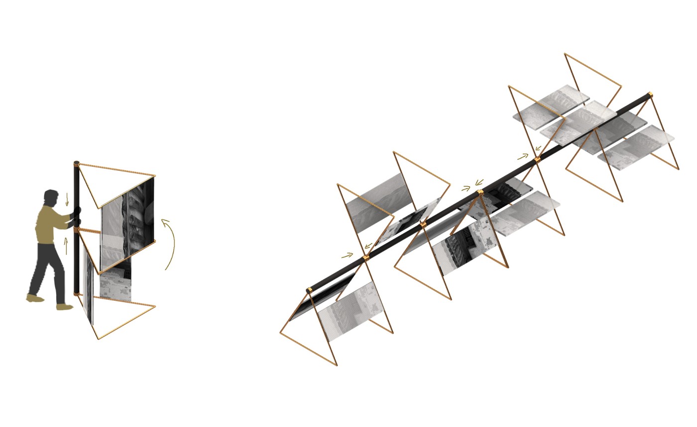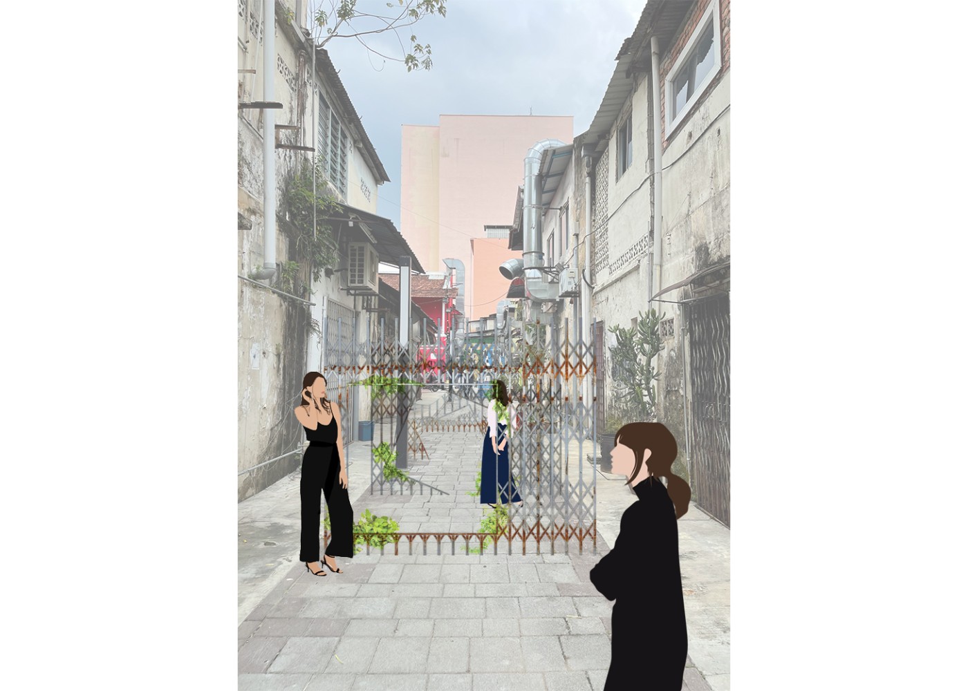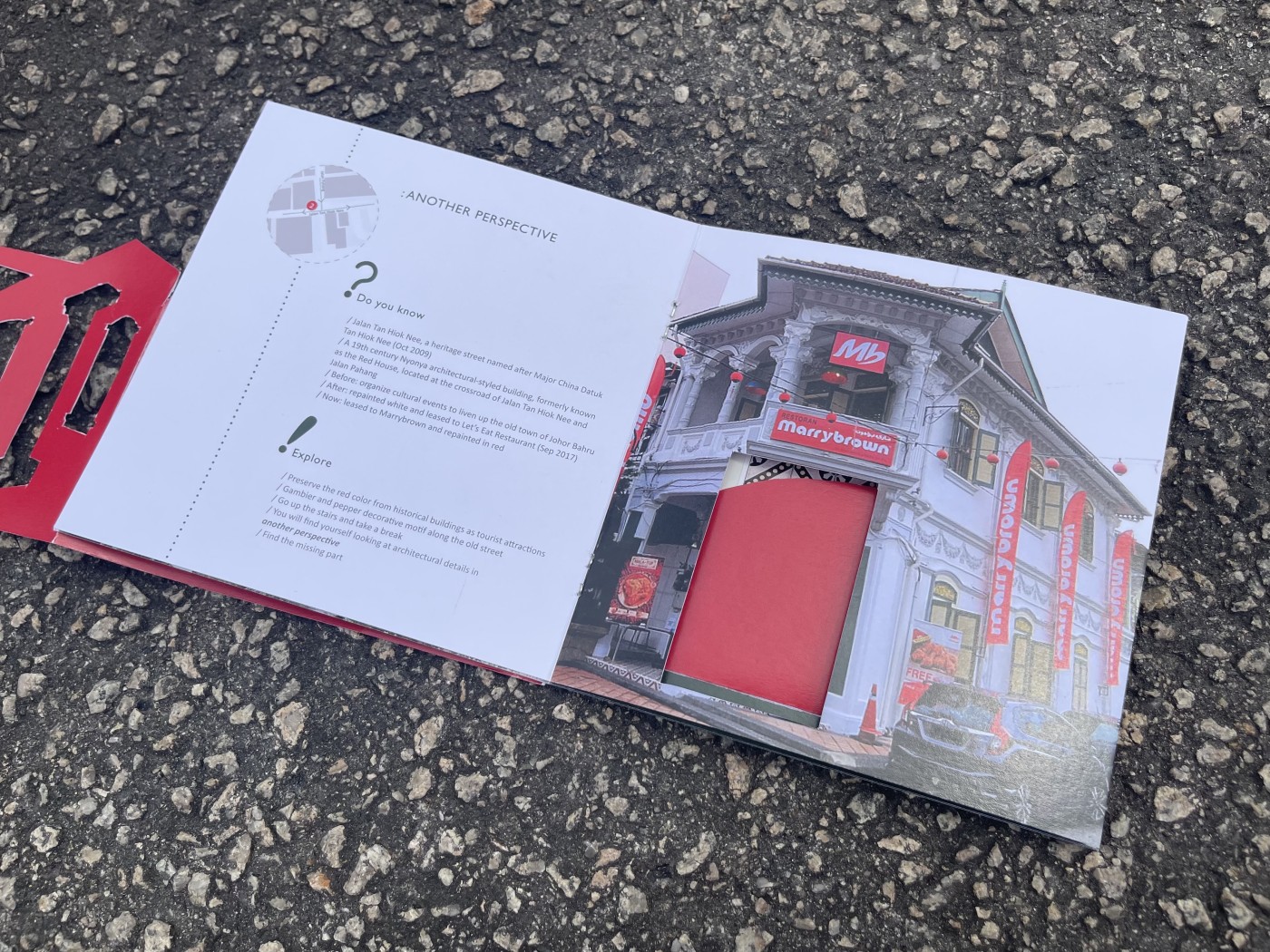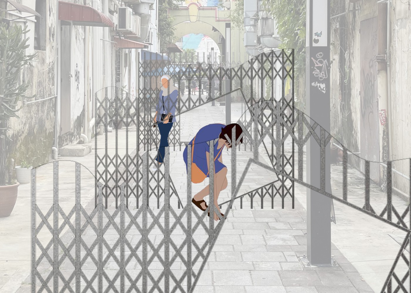 This project proposes a new journey that intervenes in the existing heritage walk in the city centre of Johor Bahru. The interventions act as frames, highlighting surfaces and material conditions to show the area's past significance. The interventions encourage people to move through the frames to recognise these valuable moments. A booklet accompanies the new walking journey and acts as an interactive tool where the audience can leave traces to commemorate their journey.