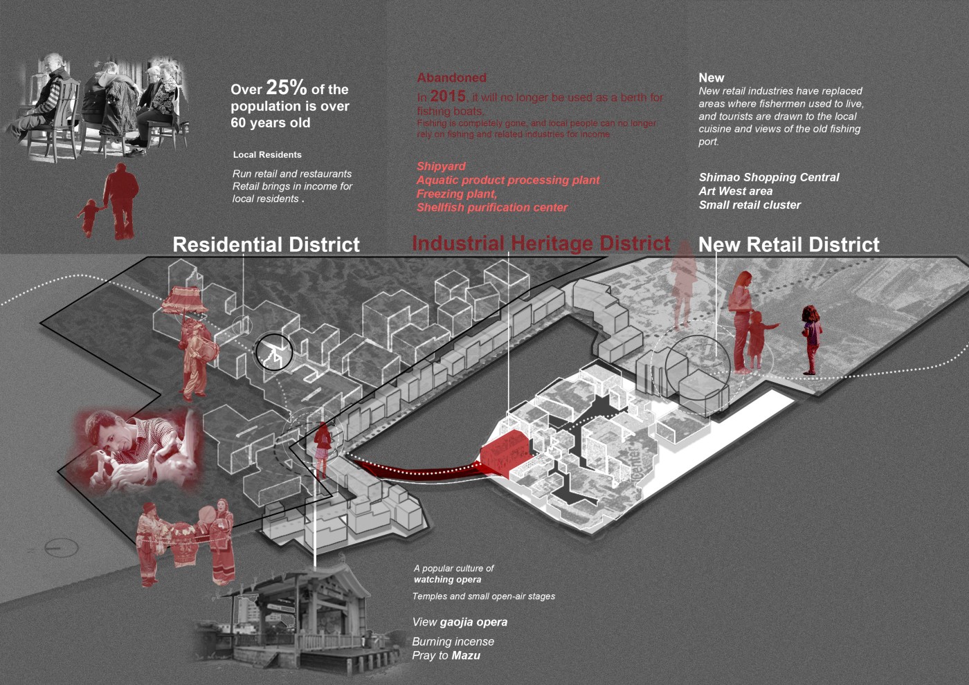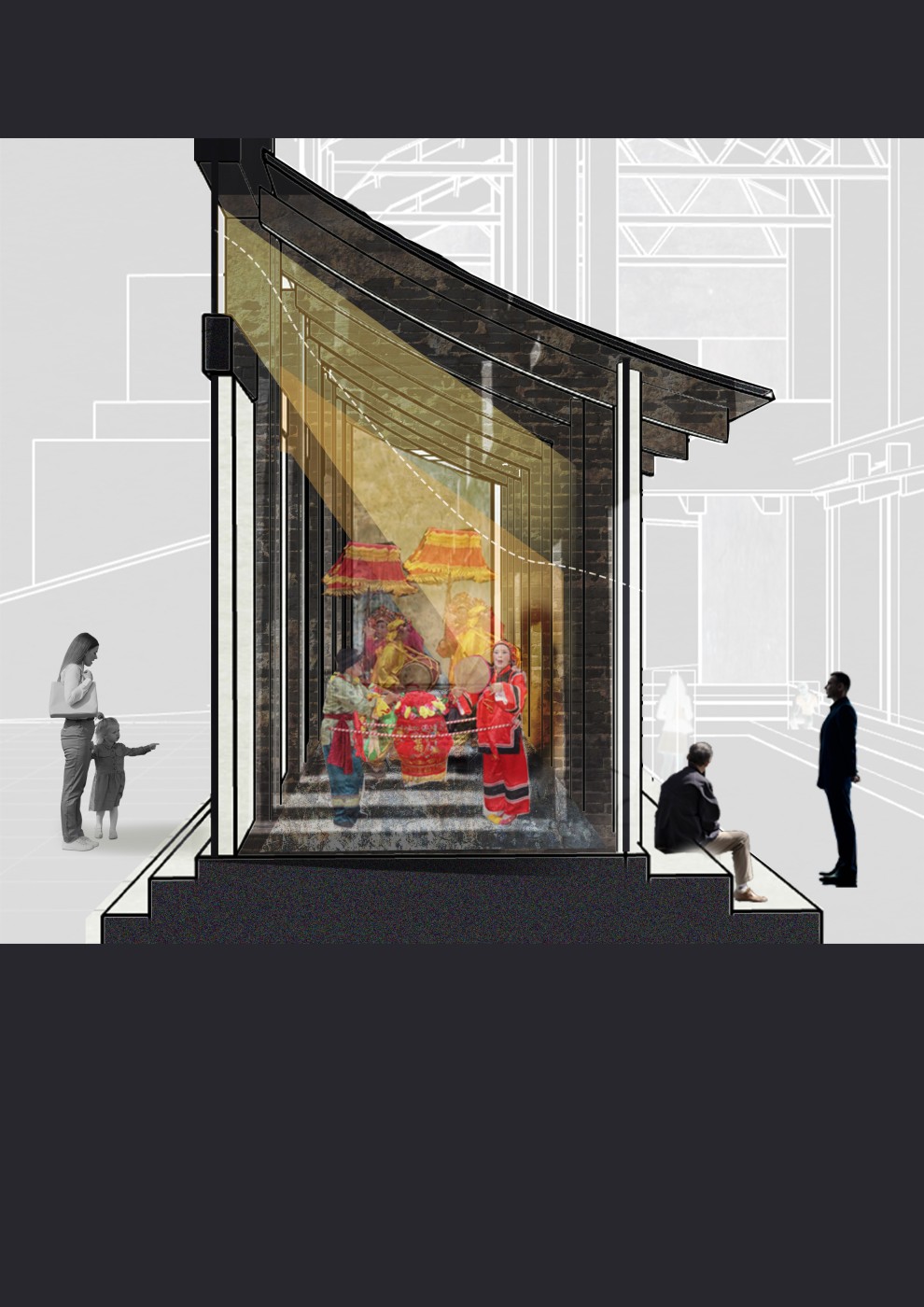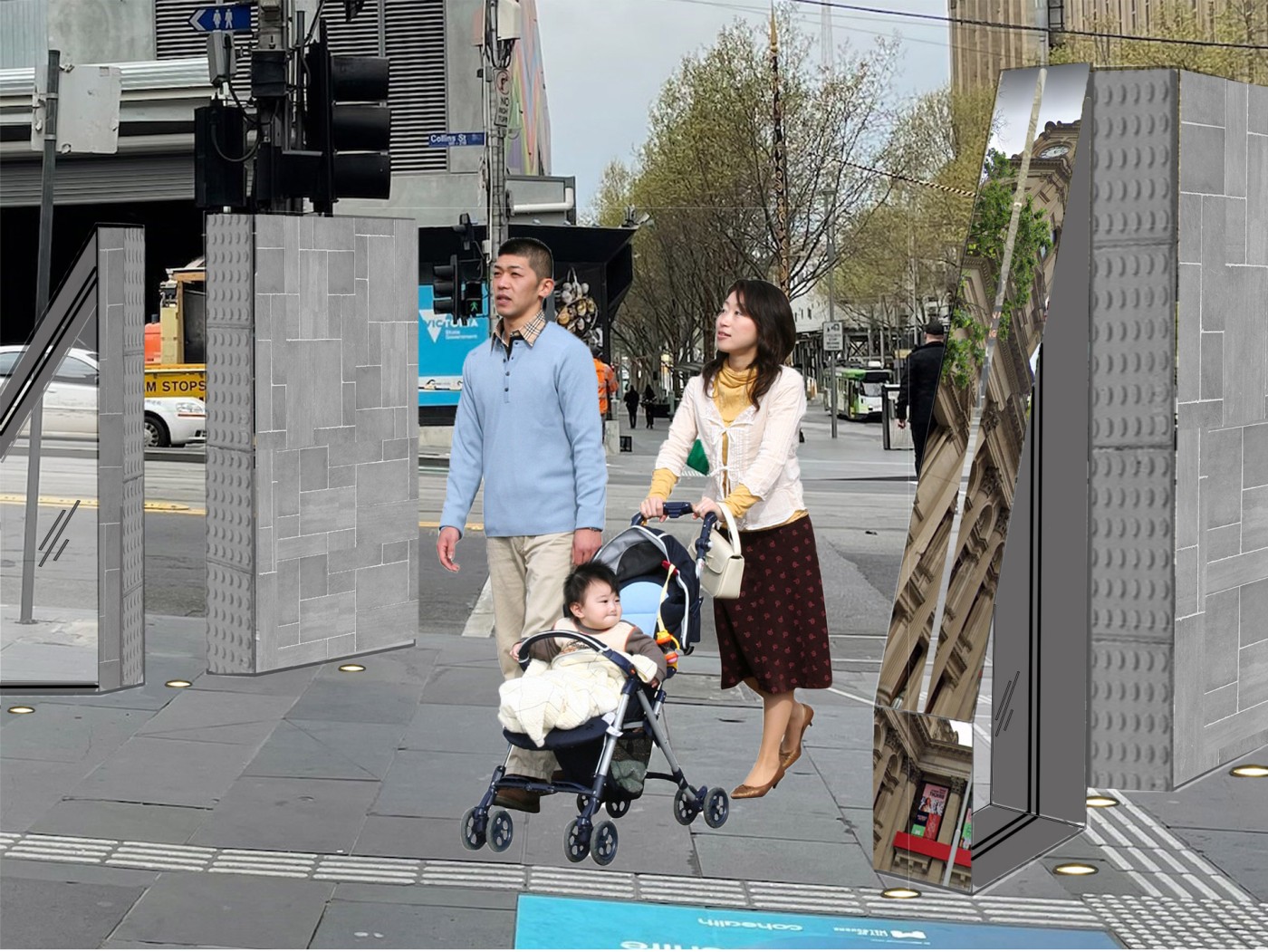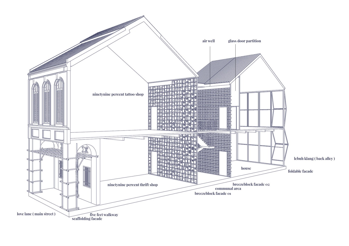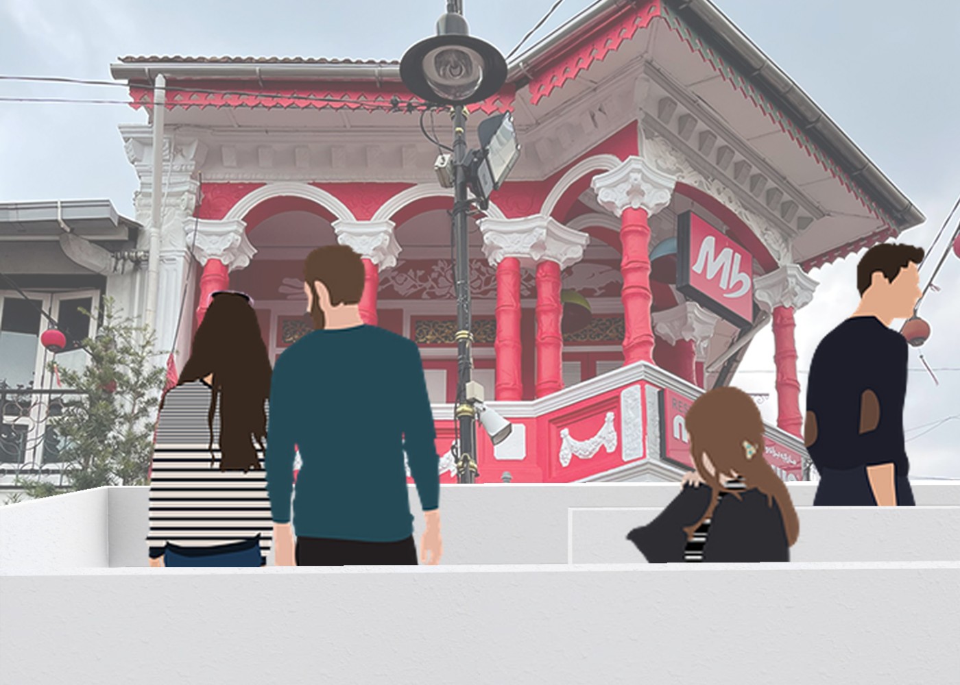 This project proposes a new journey that intervenes in the existing heritage walk in the city centre of Johor Bahru. The interventions act as frames, highlighting surfaces and material conditions to show the area's past significance. The interventions encourage people to move through the frames to recognise these valuable moments. A booklet accompanies the new walking journey and acts as an interactive tool where the audience can leave traces to commemorate their journey.