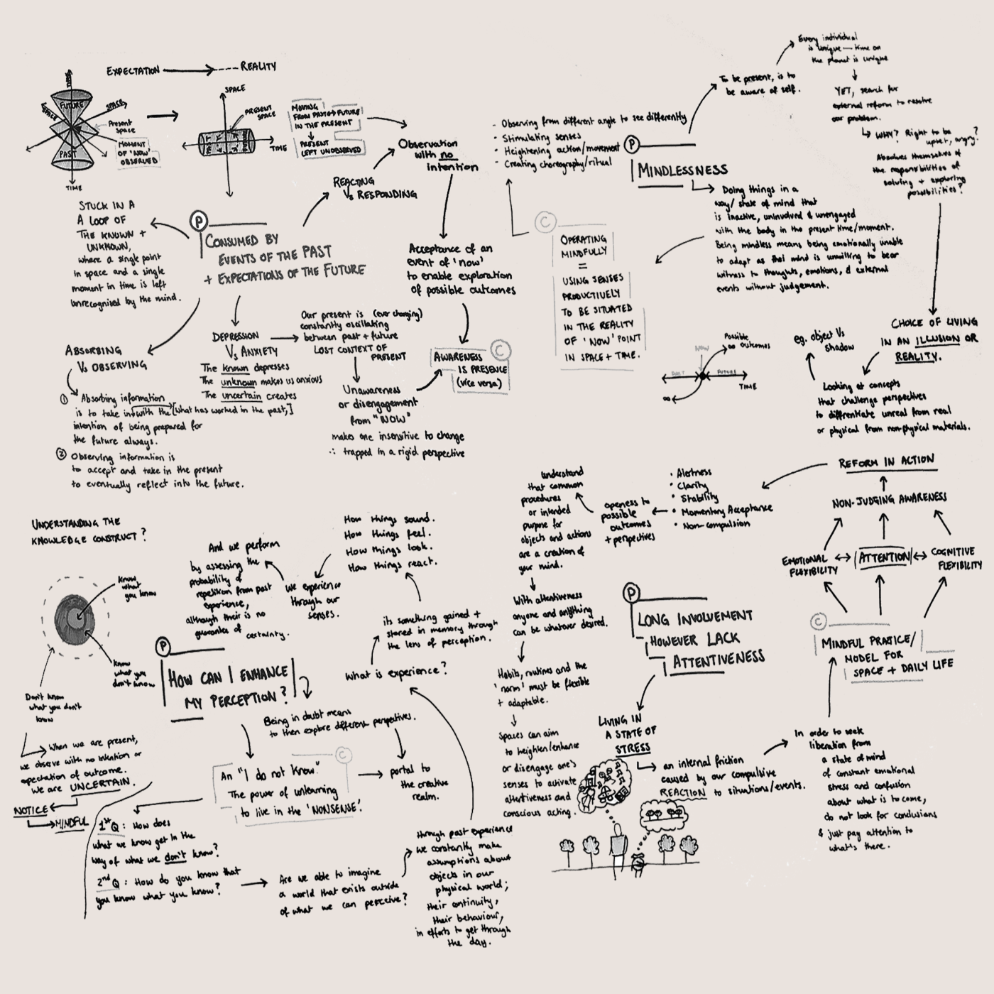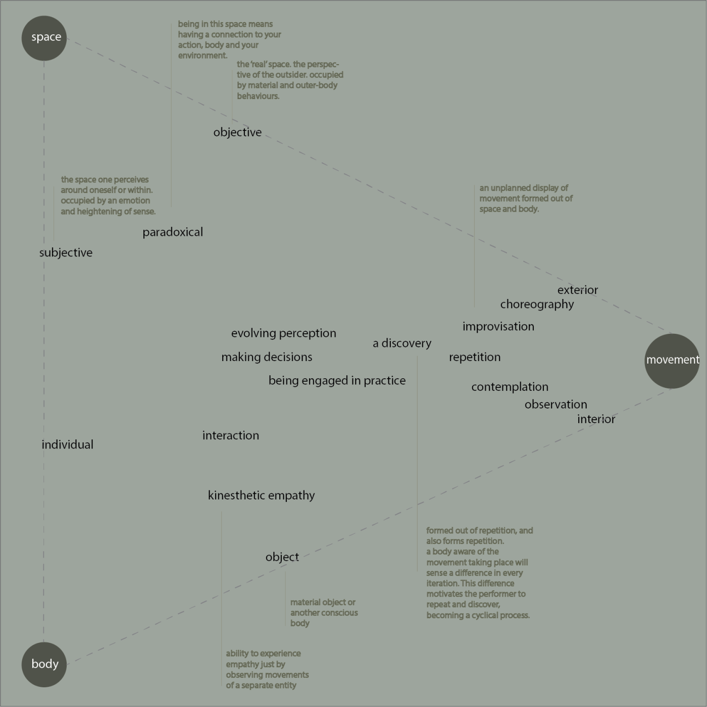 There are three main categories of concentration for this project: Using the body as a Place, an Instrument, and a Channel. The body of practice opens out to compelling possibilities and potentials of engagement between the body, objects and spaces. The inference is that our body is not an enduring self-enclosed form, but a perceptual relationship that is continuously forming a lived dynamic within the surrounding field. My research questions how the body functions as an amalgam of conscious and unconscious experience and as a nexus of past, present, and future. How can we be connected in the surrounding field within the practice of interior design?