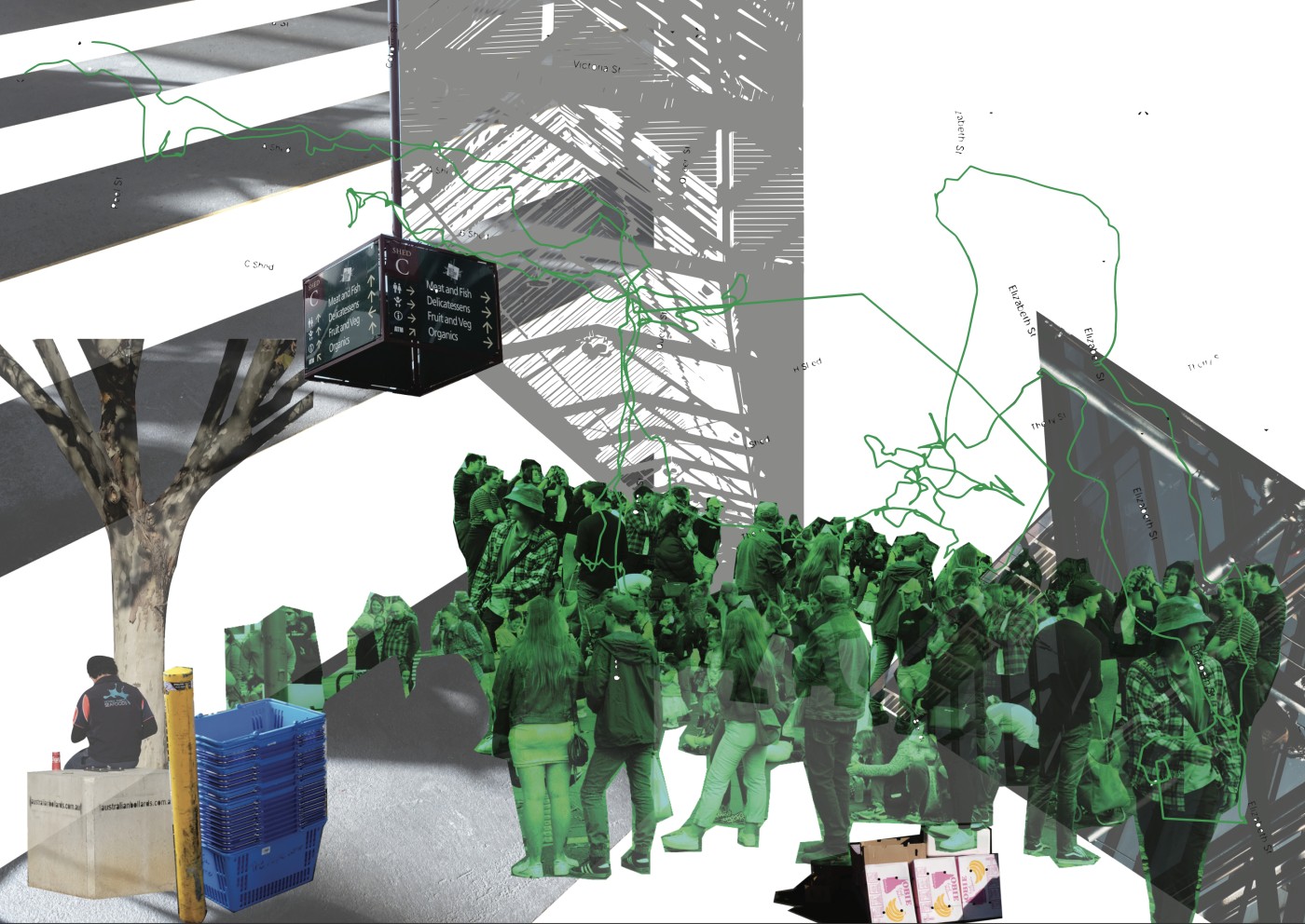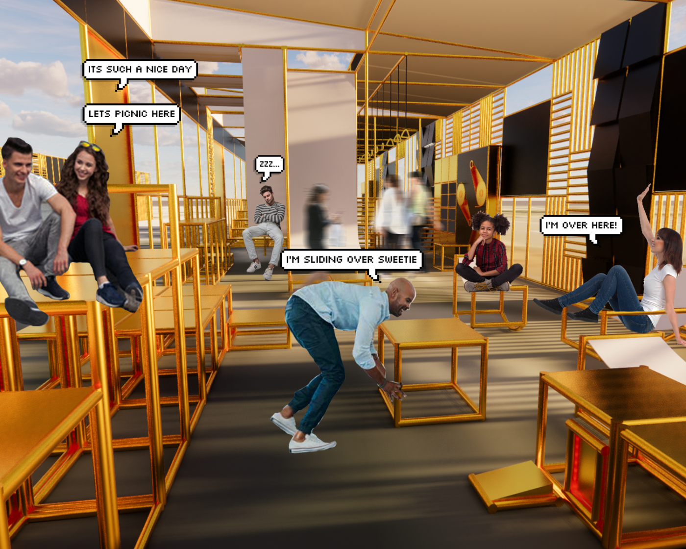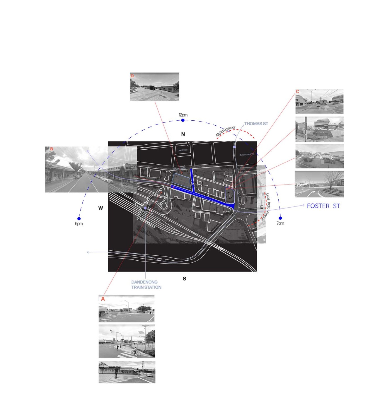 ‘You are Here’ is a dynamic approach to interior design that foregrounds the practice with the act of “selection, arrangement, and framing”, a process closely related to assemblage making. An assemblage being defined as a curated collection of components that through their arrangement generates a dialogue with the body. This project critiques and challenges the typology of our streets whilst at the same time redefining the interior as an assemblage and a product of negotiation among its inhabitants. This is examined through Foster St, Dandenong, identified as Victoria’s first Indian precinct where a series of interventions take place, designed with the intention to facilitate, and establish a sense of identity for the Indian community. The driving force behind this research project stems from the pattern of passive behaviour and the lack of freedom that we are given within the current design of our streets as a citizen, as a woman, and as a pedestrian.