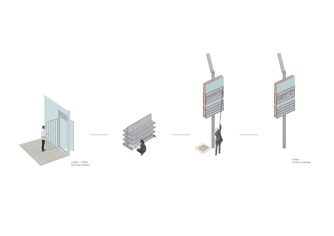 Waiting is a narrative journey in unexpected scenarios of the every day. It is a positive silence. It facilitates an experience for an audience to become more aware and more attentive to their own bodies’ relationships to the built environment. By noticing the everyday, the audience’s focus is shifted away from the experience of waiting, through deep seeing, doing and listening.