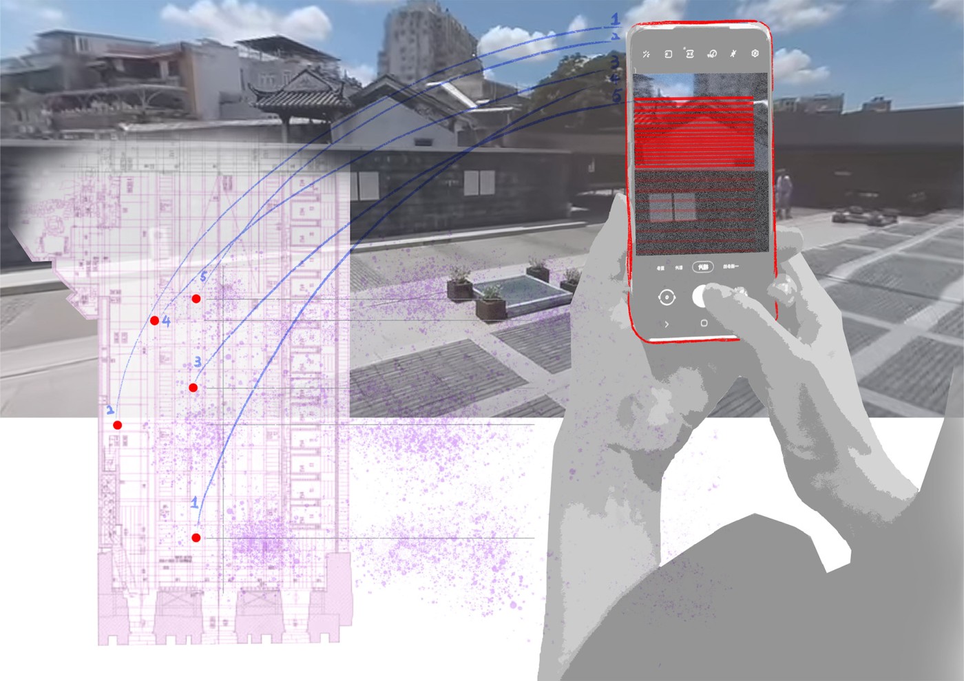 This project is a provocation for how technology can enable immersive connections between people, histories and place. A series of encounters brings awareness to the ruin's past, in its present condition; visitors interact with a digital program that produces an embodied experience with and in the heritage site. Through a combination of digital and analogue techniques in image production, such as collaging, the practice developed ways of intervening in the visitor/tourist experience.