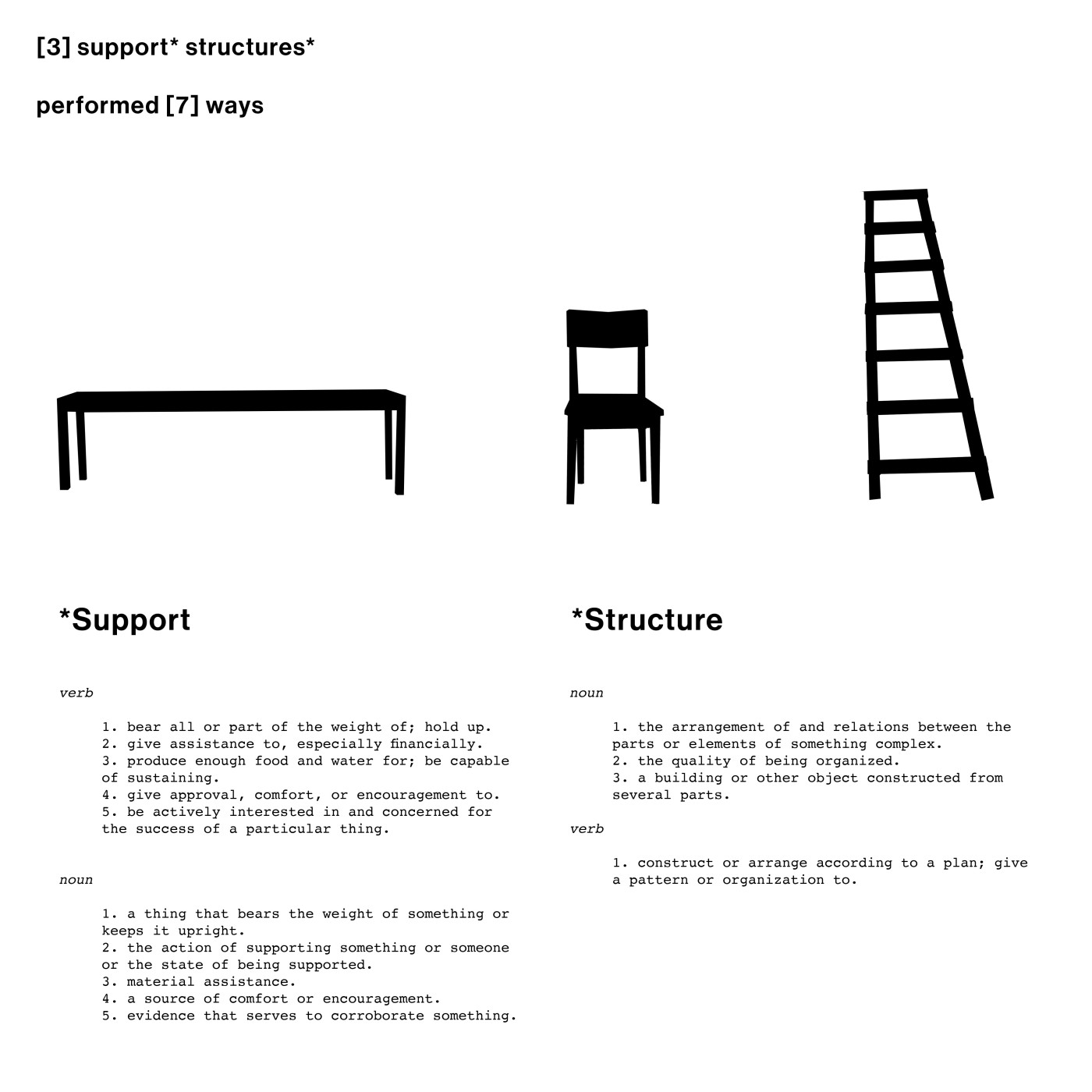 Our current reality has been redefined through the parameters of virtual experience, illuminating the criticality that an active being-in-the-world has within our well-being. 'What we are Together: Provisional Arrangements for Support' is a process-lead research project that responds to this observation by prompting questions around how assemblage as a technique informs behaviour and affords support as an emotional, physical, and philosophical methodology. Assemblage is explored through the arrangement of objects, bodies and sensations meeting provisionally to enable new territories and relationships to emerge.