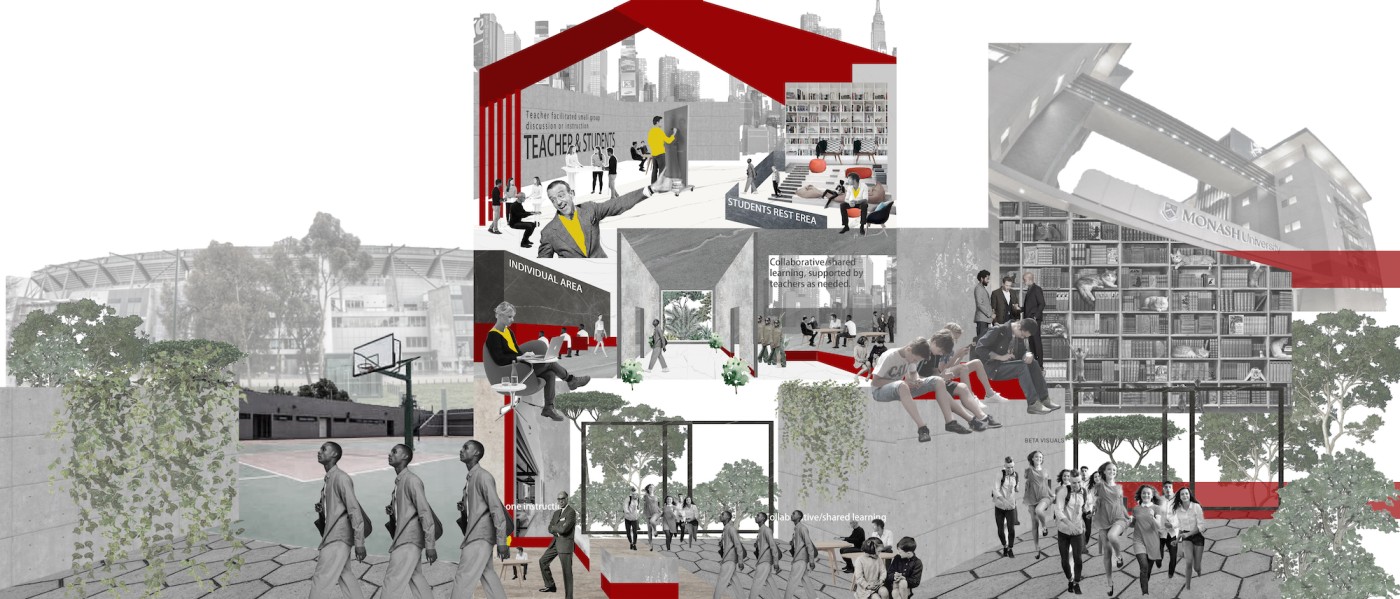Working in groups - through a process of research, analysis, and design exploration - students were asked to develop a set of design principles in order to design prototypal learning environments. A key aspect of the studio was the partnership with GHD Woodhead, which allowed the students to engage with a variety of design experts and consider the newly designed Wurun Senior High School Campus as an exemplar case study. Through this partnership ideas including adaptable learning, placemaking, campus movement, and digital technologies were unpacked with the students alongside their own design-led research.