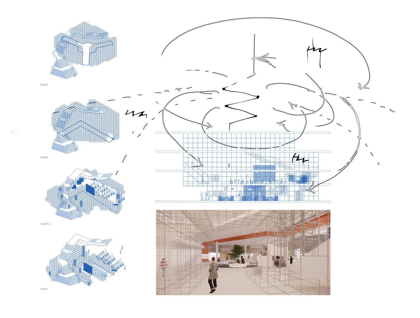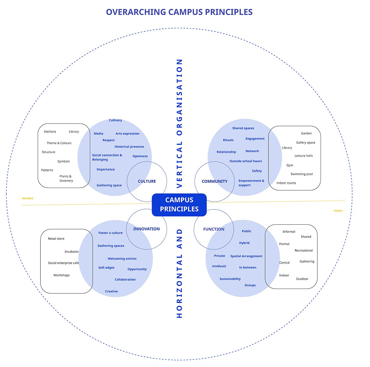 The four learning environment principles (ecological, situational, performative, sensorial) create non-hierarchical learning spaces for individualised experiences of learning and educating. Traditional frameworks of teacher-focused learning are decentralised to encourage cross-disciplinary interactions within the complex campus ecology. Learners are given a sense of ownership over their education, as the campus adjusts to the needs of learners, rather than the learner compromising to a traditional campus framework.