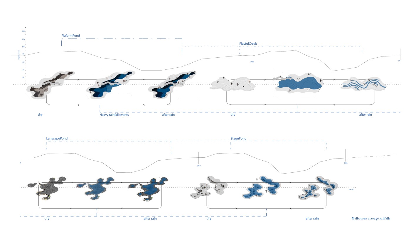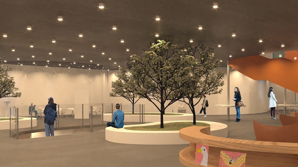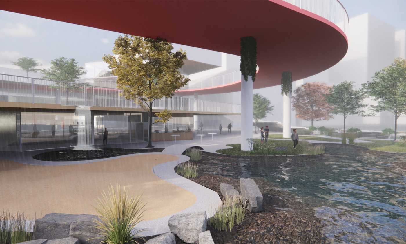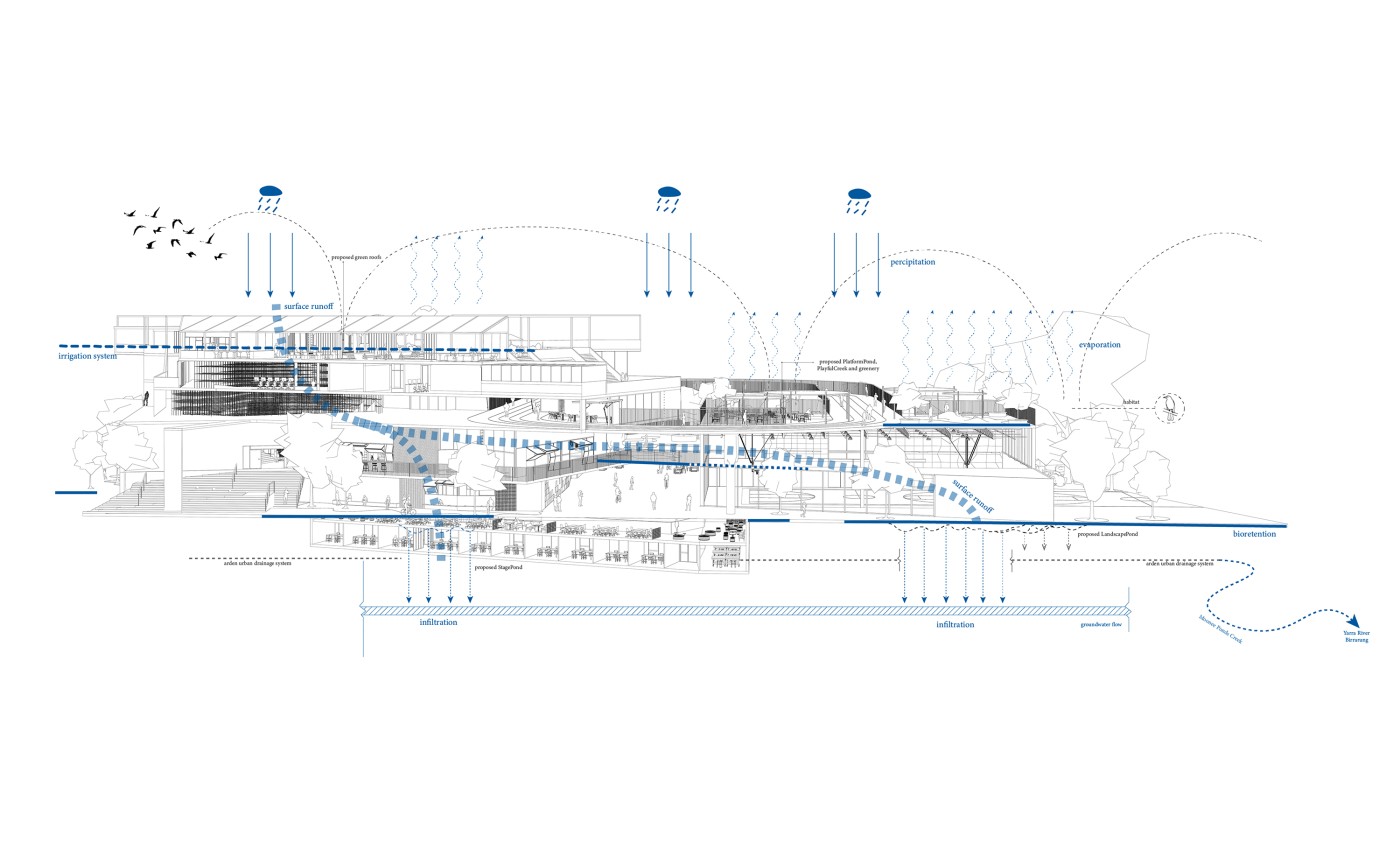 The campus layout is informed by learning neighbourhoods, as well as the existing landscape the campus is built on. Across six levels, learners and educators develop relationships with community and nature, with the flow of water highlighting the existing conditions of the Arden site. Natural flood plains dominate Arden, their presence a focal point in the development of Arden as a precinct. The same presence of water is found throughout the campus, with multiple iterations of flowing water connecting the campus vertically and laterally.