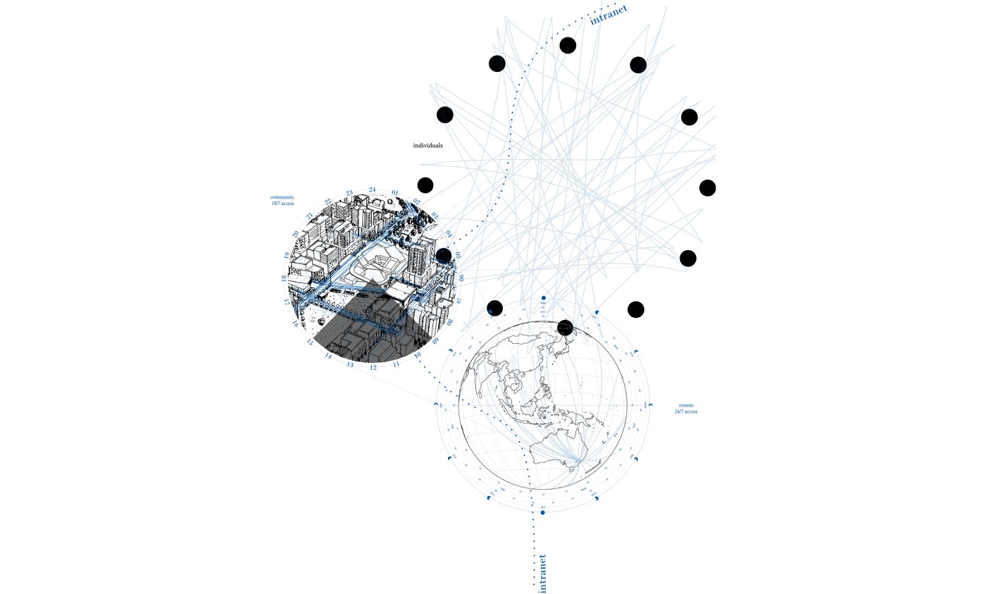 Arden, a recently designated urban renewal precinct in North Melbourne, Victoria was chosen as a location to implement our campus organisation principles. Our priorities were to establish a campus in a very sticky community, develop and design a new learning environment, and facilitate communication between the school and community institutions to achieve a process that naturally integrates the community and the campus.