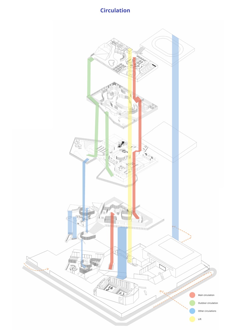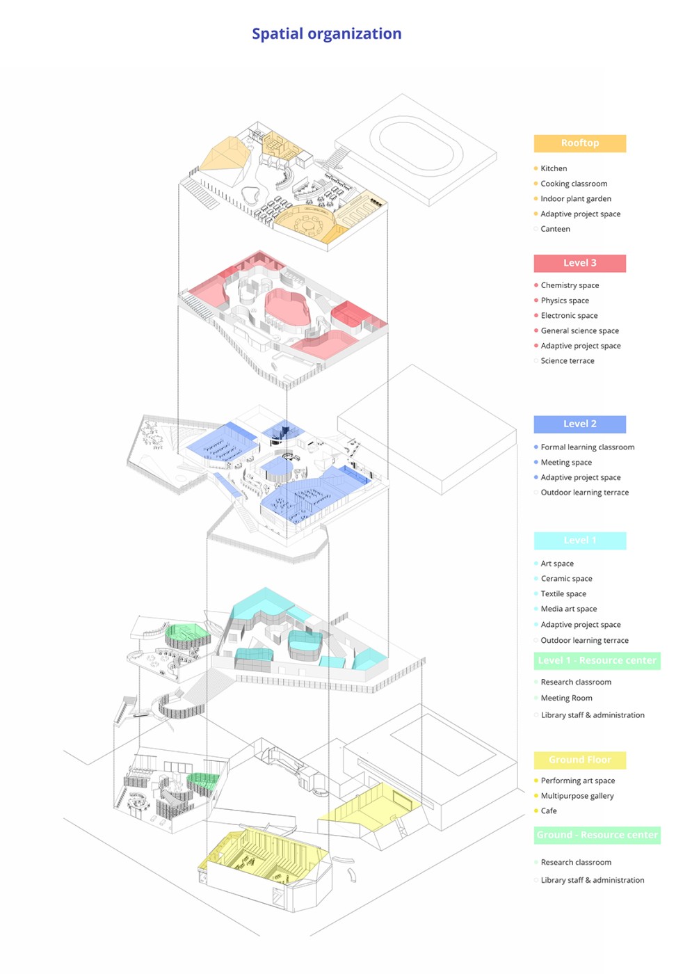 Circular furniture is used within the learning spaces to support new modes of teaching enabling flexible interaction between teachers and students. The exterior spaces are designed to cater to multiple functions such as group discussion, social gathering, rest, and self-directed activities. Each floor allows for strong vertical relationships throughout the whole building. The roof terrace is seen as a public platform that is accessible for community visitors.