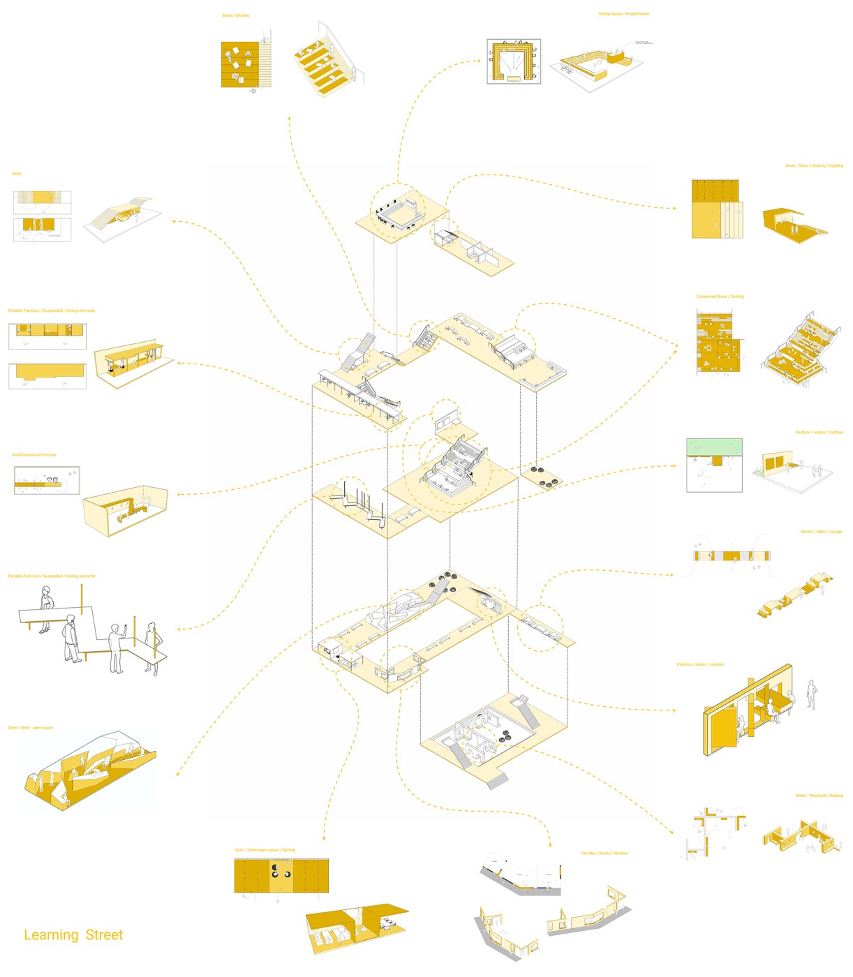 Our learning street prototypes not only focus on a conventional two-dimensional/horizontal zoning strategy of schools but also emphasise the vertical connection within the building maximizing students’ contact with nature and improving the accessibility and richness of the outdoor spaces. Overall, our intention is to create a dynamic environment not only to promote autonomous learning behaviours, attitudes, and collaboration for students but also a campus accessible to the wider community.