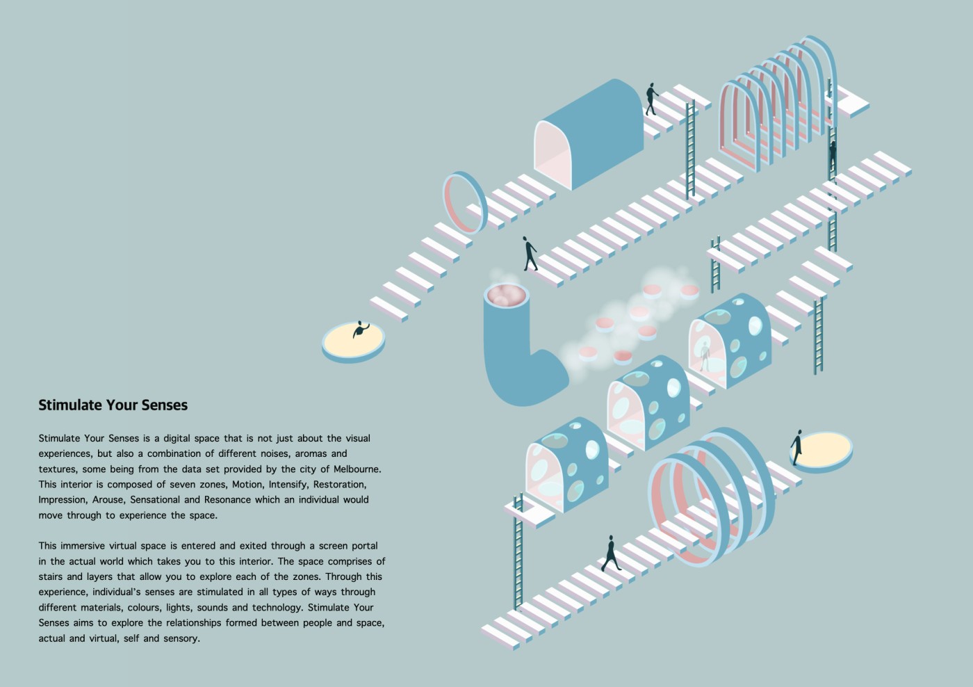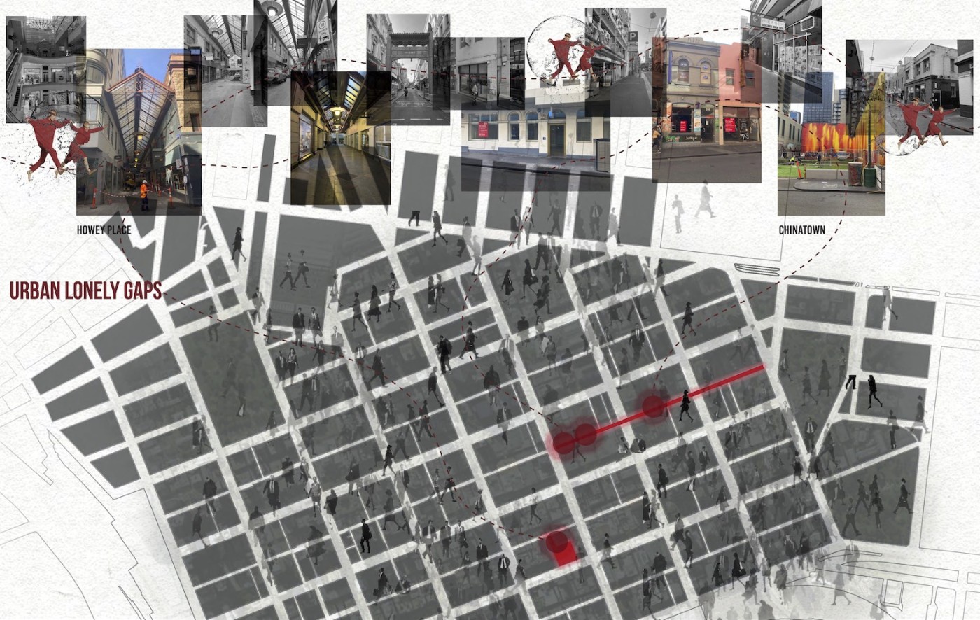 Our proposition addresses how the city is in a state of neglect. Engaging City starts from three keywords: stimulus, participation, and presence. Stimulus is a method of activation method and a strategy to bring people back to the city through attraction and empathy rather than feelings of anxiety or fantasy. Participation is a presentation process of interaction between people and the urban interior. We believe Melbourne needs stimulation to challenge and reinvigorate the urban fabric that no longer has a sense of presence and our interventions help the city and people to find a new meaning of presence.