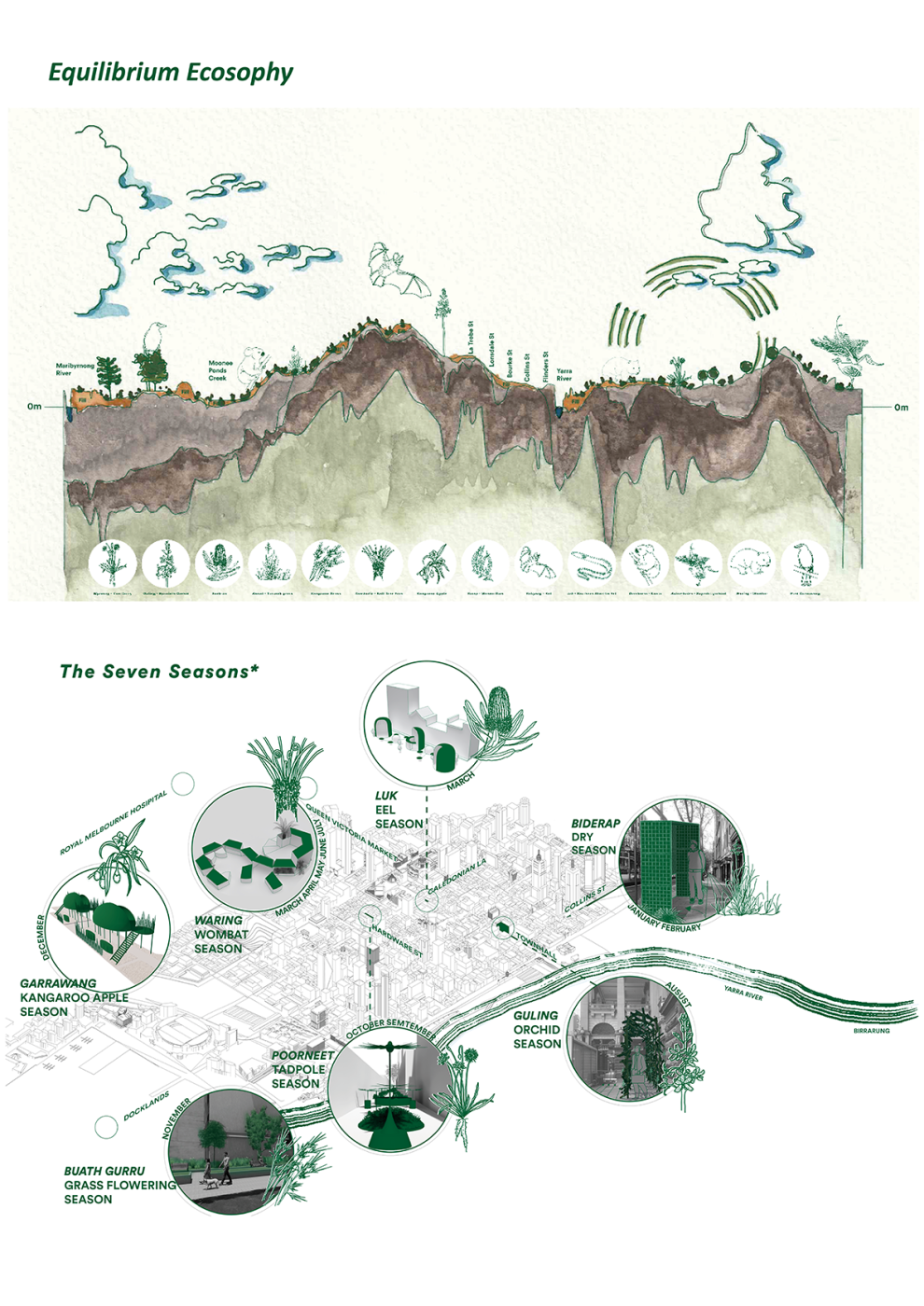 Ecosophy is a dynamic state of balance, harmony in environmental ecology to social ecology and to mental ecology. We need to build up an awareness that we all are part of the environmental ecology. Therefore, the aim of our proposal is to design ways and strategies to encourage collective contributions from everyone to act environmentally friendly and be part of the urban greening process. Our proposal uses the 7 seasons in the Eastern Kulin Seasonal calendar as a strategy to celebrate the temporal beauty by the work of nature at each time of the year and through this to build connections with nature in the urban environment.