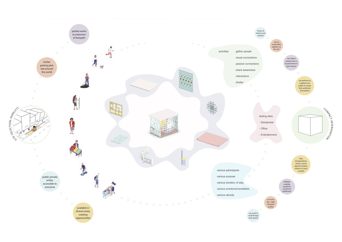 Publicness, we believe, is a medium to create space for communication and engagement for both individuals and the collective. Our group wants to reintroduce the idea of "publicness” as a new urban interiority to encourage people to be part of the publicness of the city. Designing a new compact intervention to be placed in street car parks in any location within the city of Melbourne and can be used in other countries as well. The new space and atmosphere created will gather people in a small group in the post-pandemic context and help the individual make new relationships through shared experiences as well as the connection with the urban environment.